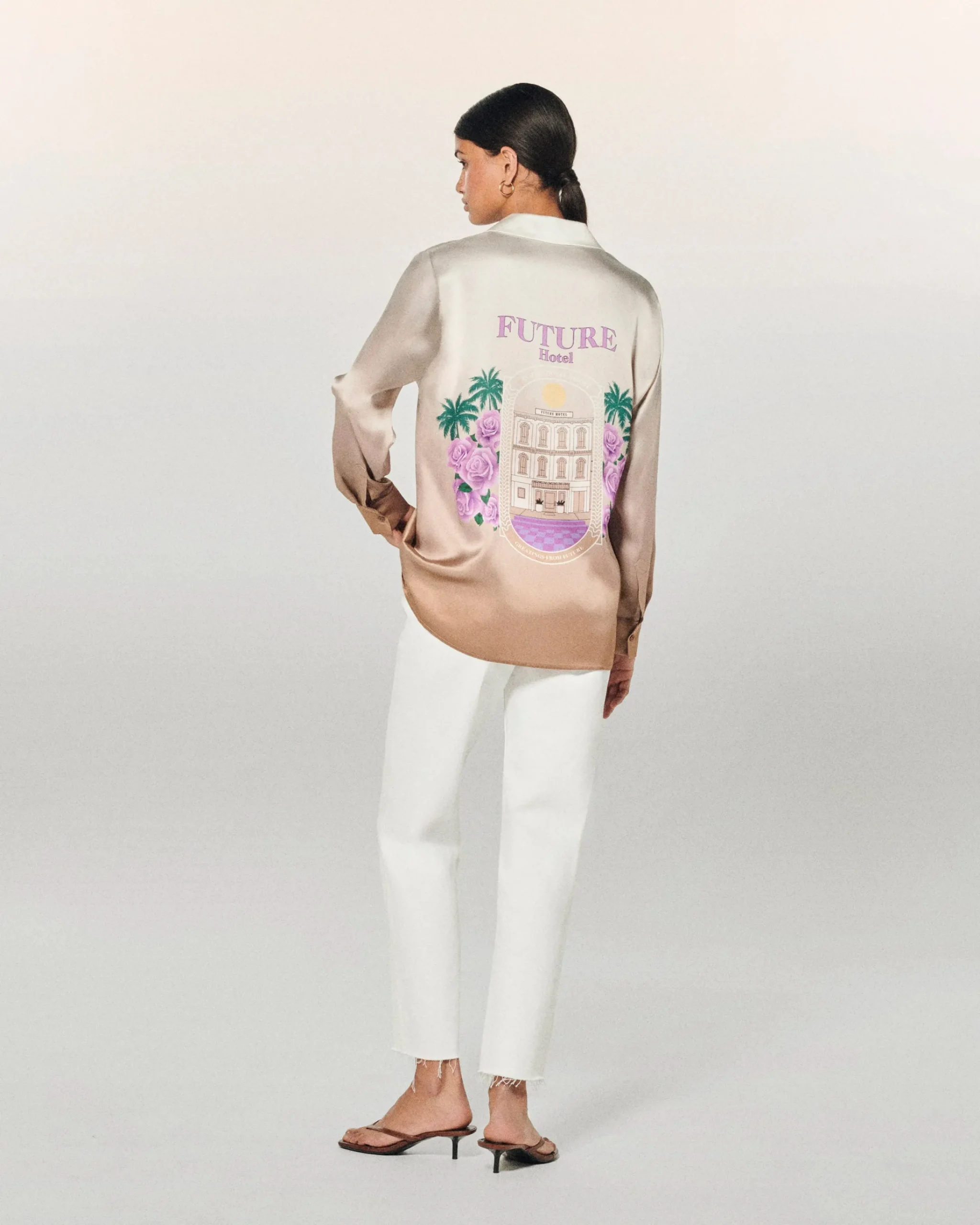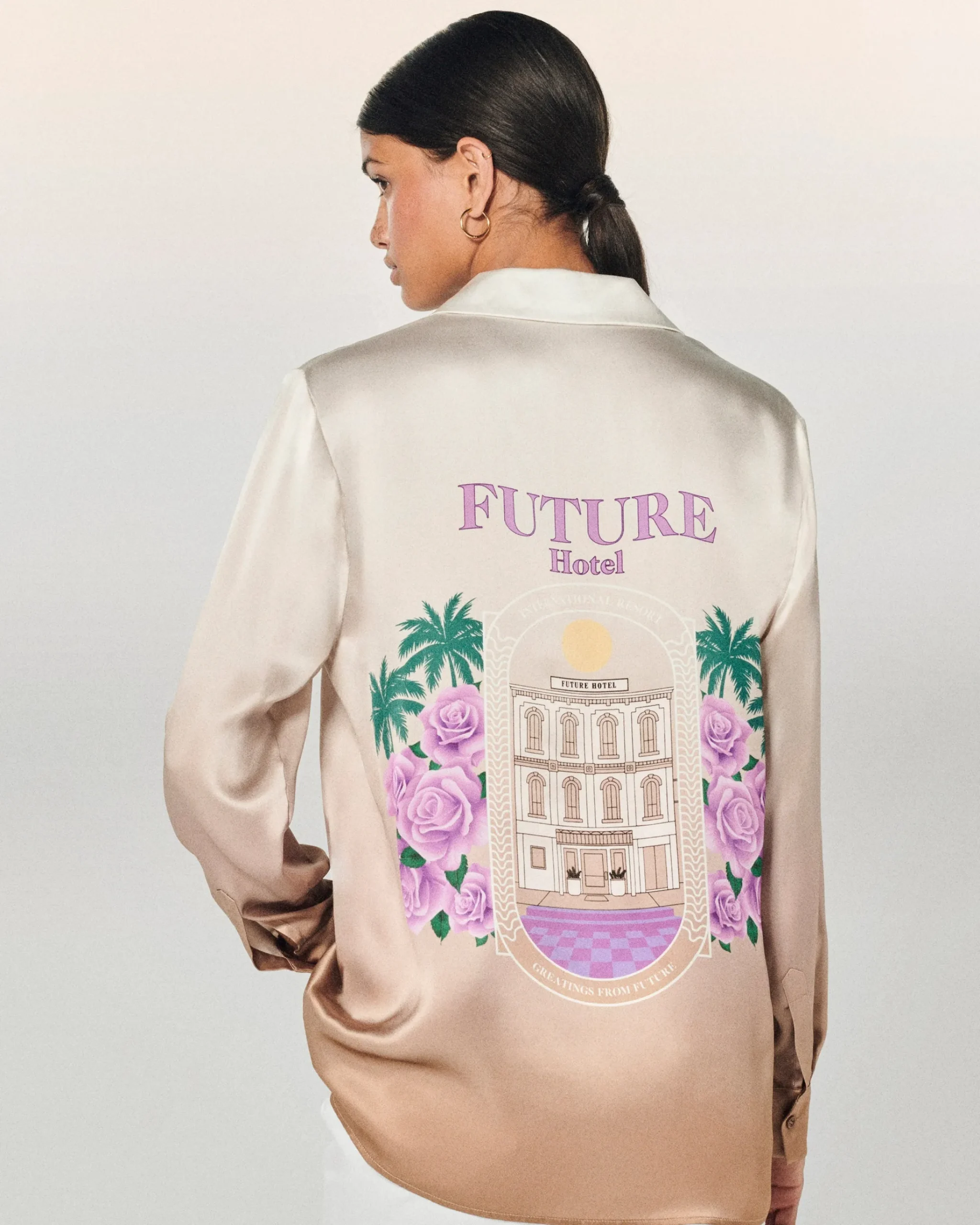 Prenotazione confermata! L’hotel Future ti aspetta su questa camicia morbida fantasia, confezionata in raso di seta lucido e setoso. Con maniche lunghe e polsini con patta e bottone, presenta bordi impreziositi da bordini a contrasto. Indossala con un paio di jeans strutturati per un look chic e casual!