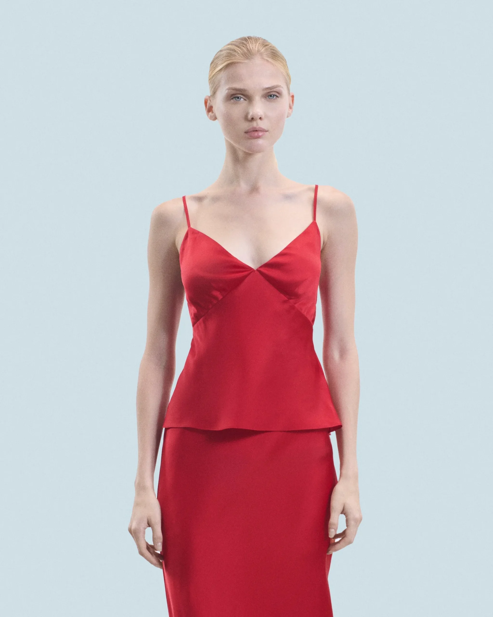 Realizzato in raso di seta leggero, lucido e setoso, questo top a canotta vanta un taglio impeccabile e dettagli audaci. Con spalline sottili, presenta uno scollo a V. Si indossa sia di giorno che di sera, è perfetto da abbinare a una gonna morbida o a dei pantaloni a gamba larga.