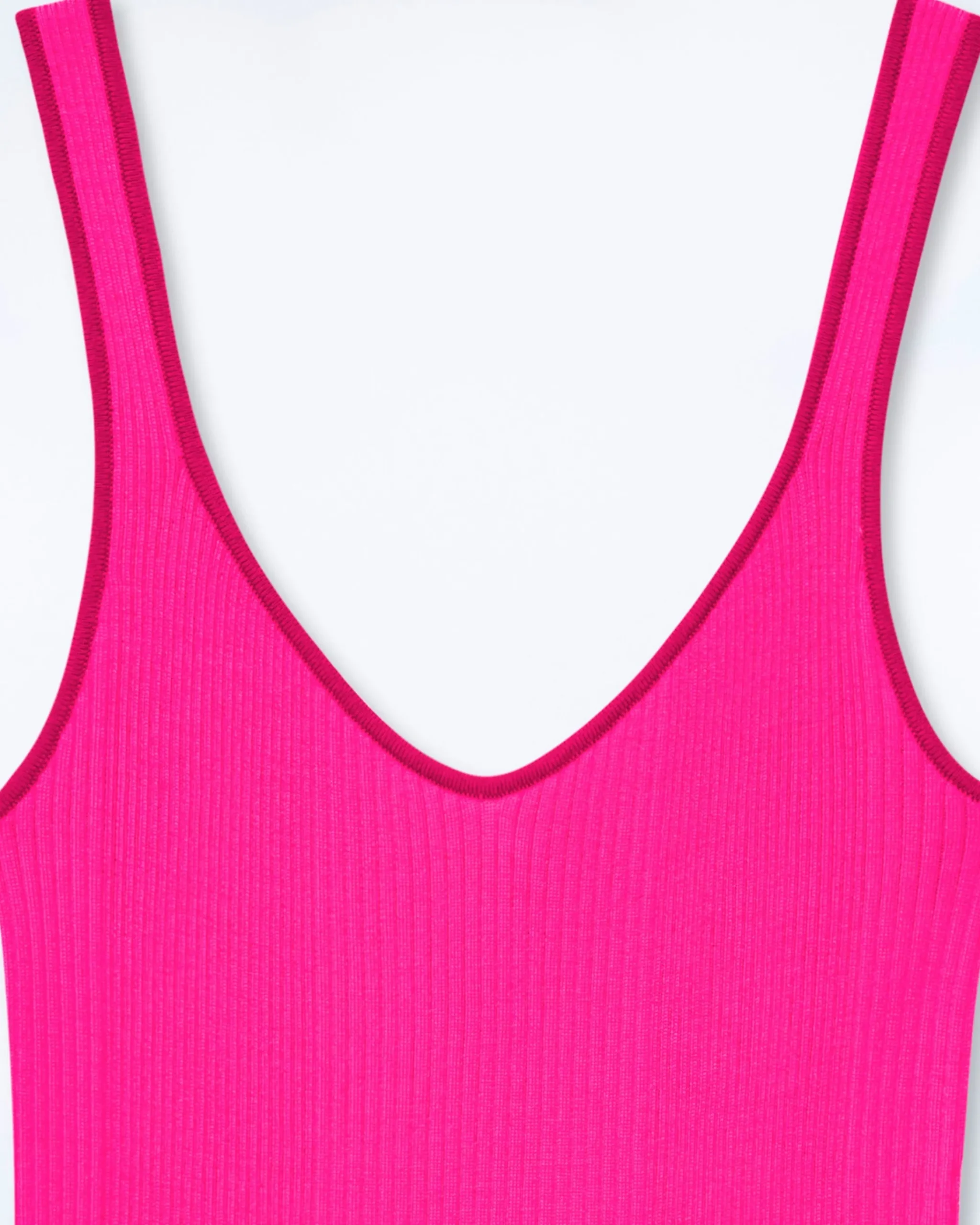 Uno stile vivace per questa canotta corta a coste, confezionata in lana merino! Con spalline sottili, presenta uno scollo a V e bordini a contrasto per creare un look strutturato. Puoi abbinarla a una gonna morbida o a un paio di pantaloni a gamba larga per un look effortless.