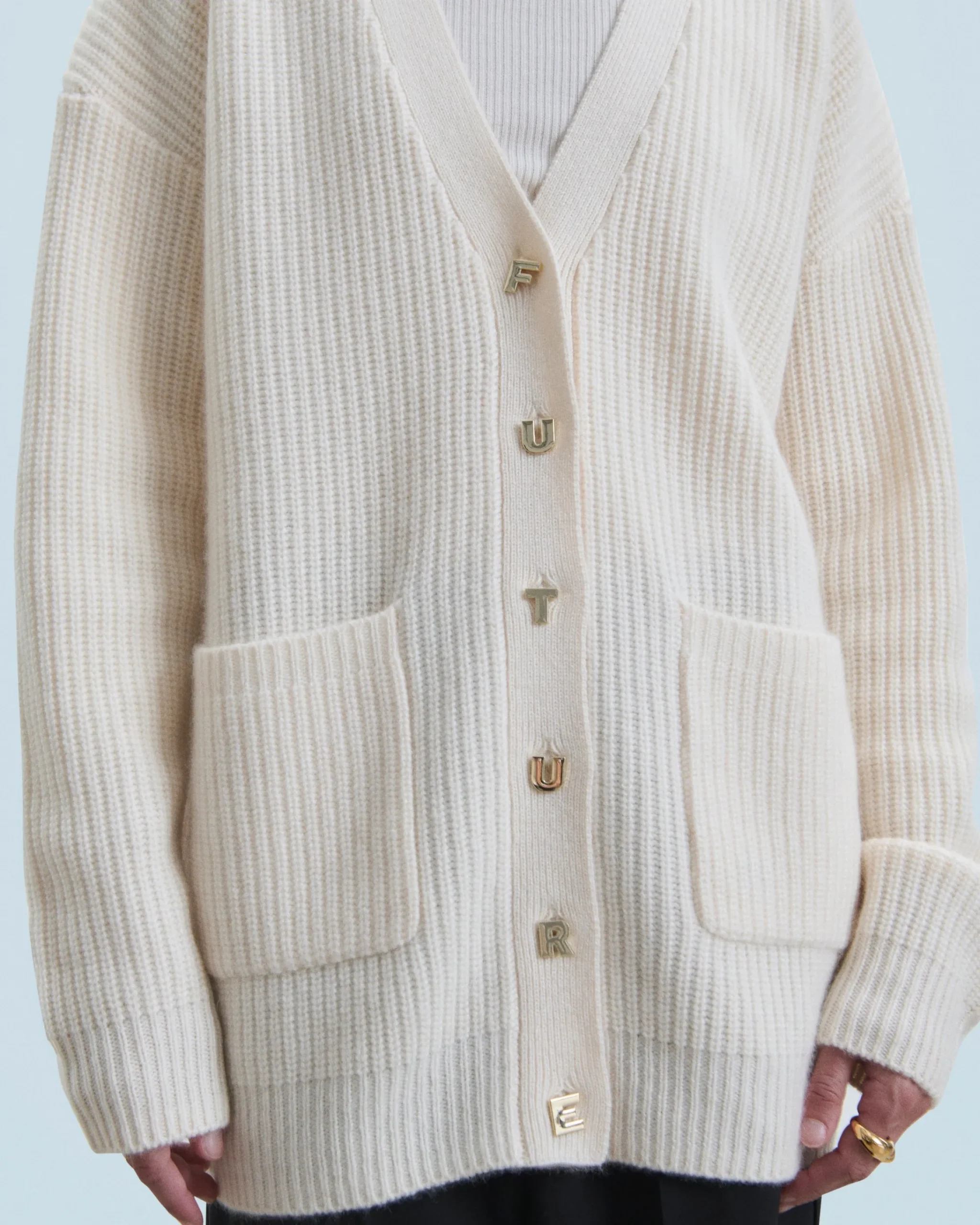 Questo cardigan lungo e oversize è caratterizzato da una morbida maglia a costa perlata. Realizzato in cashmere, presenta uno scollo a V, una chiusura con bottoni dorati firmati ‘Future’ e due tasche davanti. Con maniche lunghe e bordi a coste, puoi infilarlo su un vestito fluido o una camicia strutturata.
