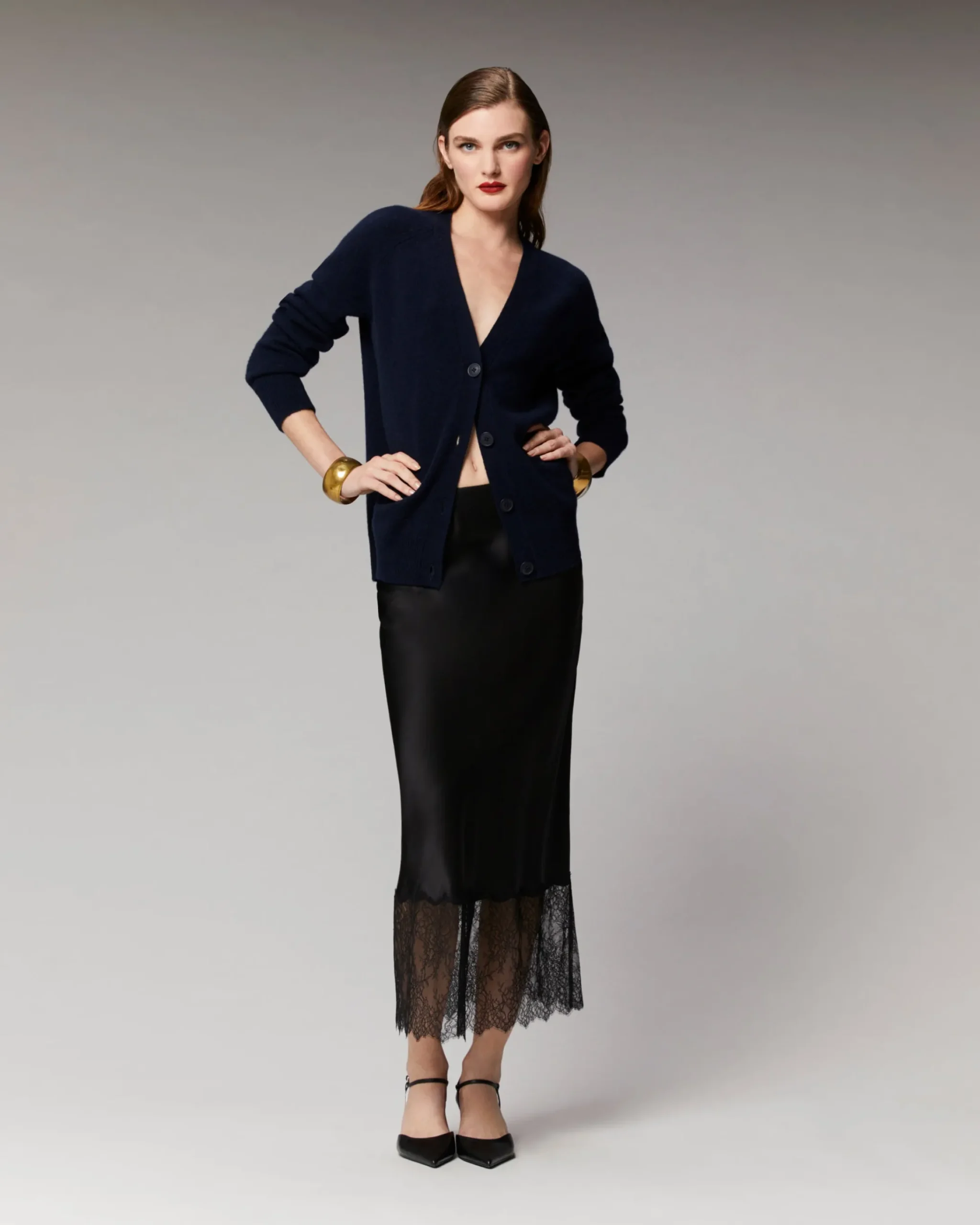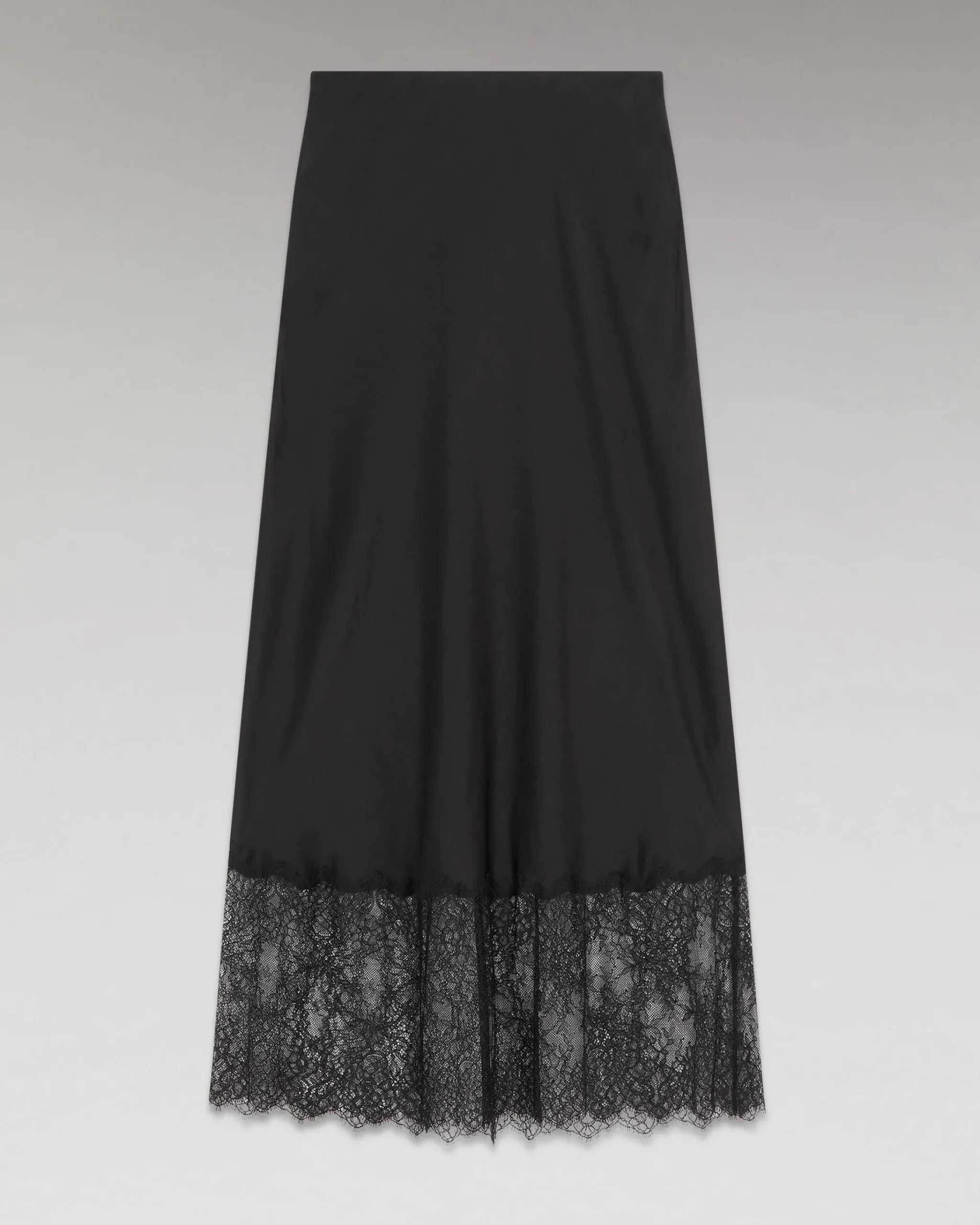 Impregnata di morbidezza e delicatezza, questa gonna midi incarna una visione futurista della raffinatezza. Confezionata in raso di seta leggero, lucido e setoso, disegna un look strutturato sottolineando il punto vita con una cintura elasticizzata. Chic e glamour, ha una vestibilità morbida ed è impreziosita da un gioco di cut-out e bordi in pizzo. Ideale per tutte le occasioni, puoi indossarla con un cardigan in maglia, dei gioielli e un paio di décolleté.