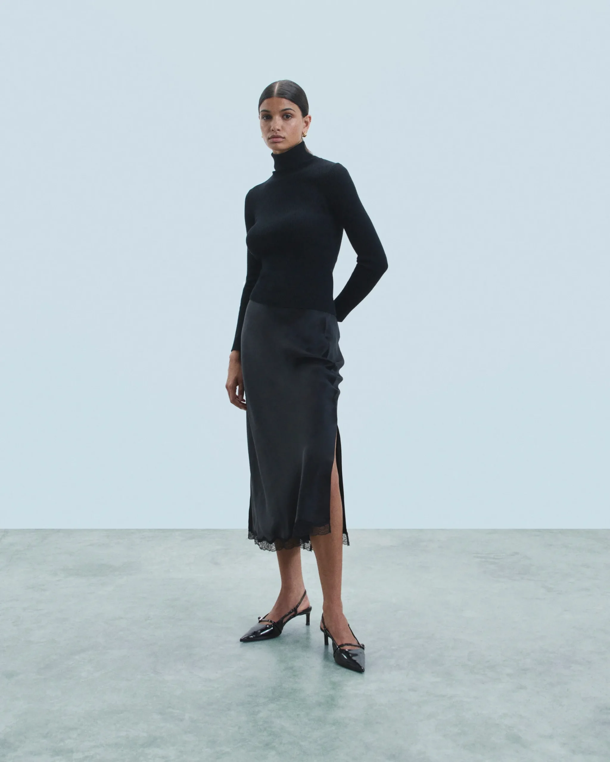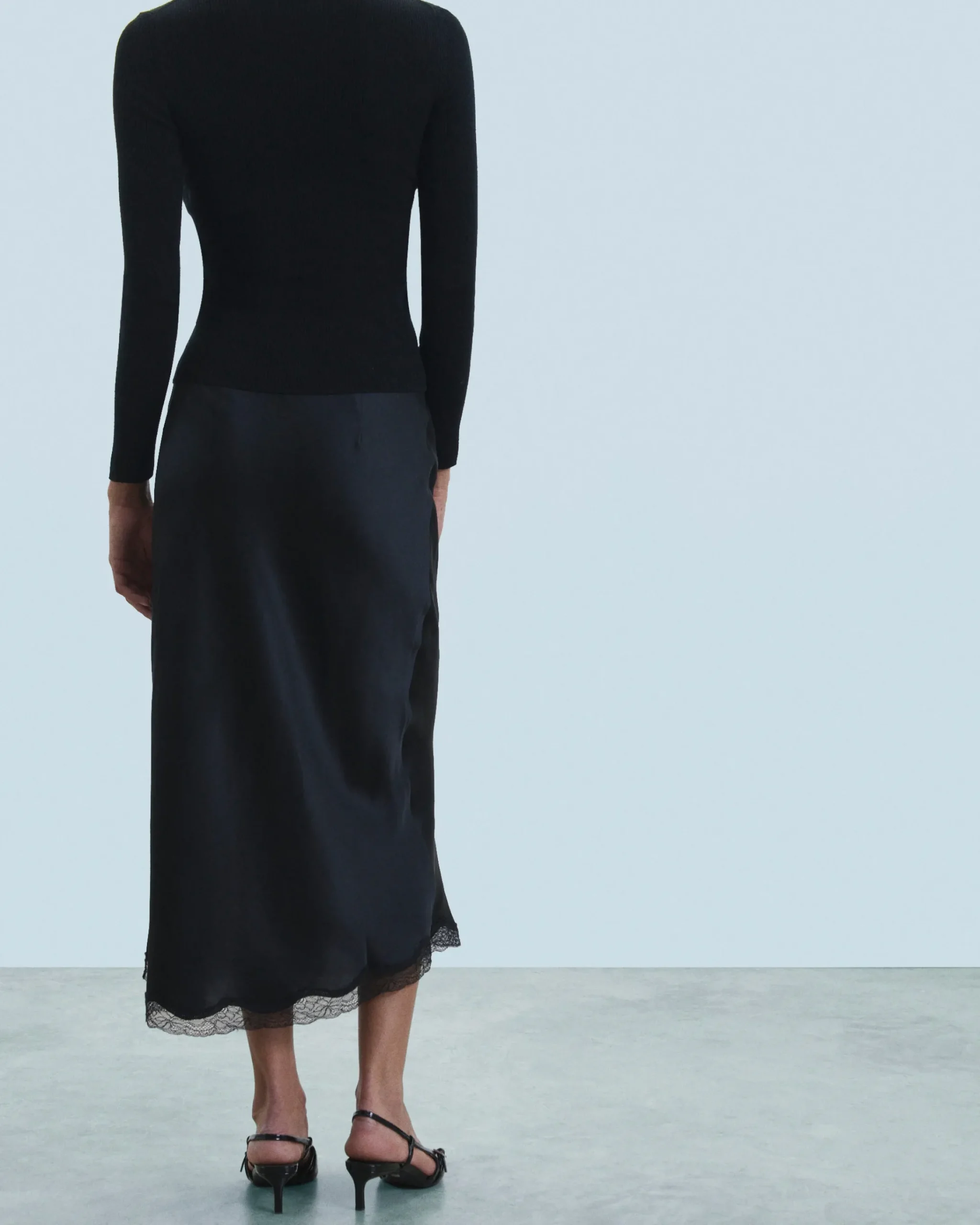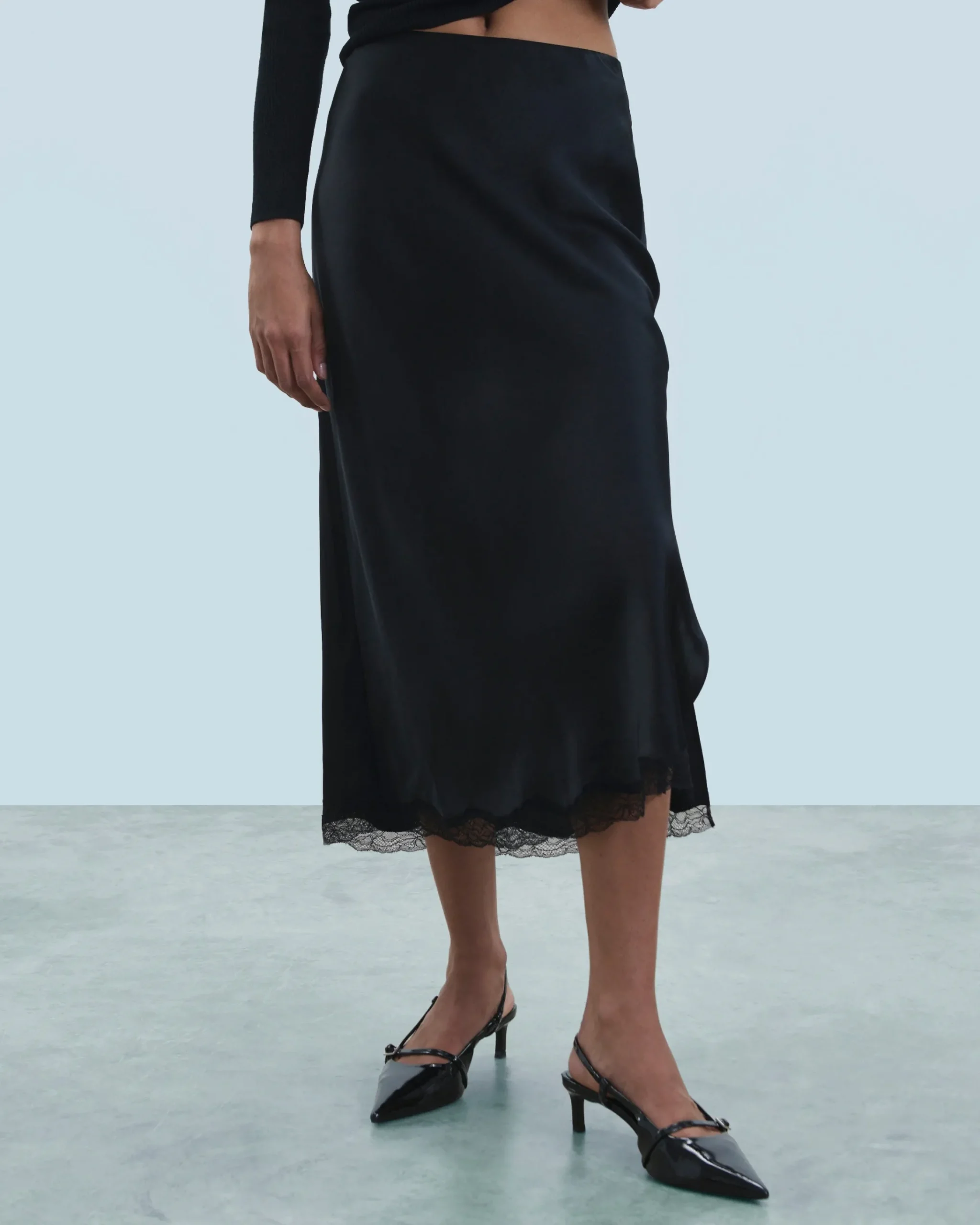 Confezionata in raso di seta leggero e lucente, questa gonna midi presenta uno stile audace in tutta eleganza. Elasticizzata in vita per un look slim, presenta uno spacco sui lati ed è impreziosita da un bordo in pizzo. Da accessoriare secondo il tuo mood, puoi indossarla su una camicia satinata o un top in maglia.