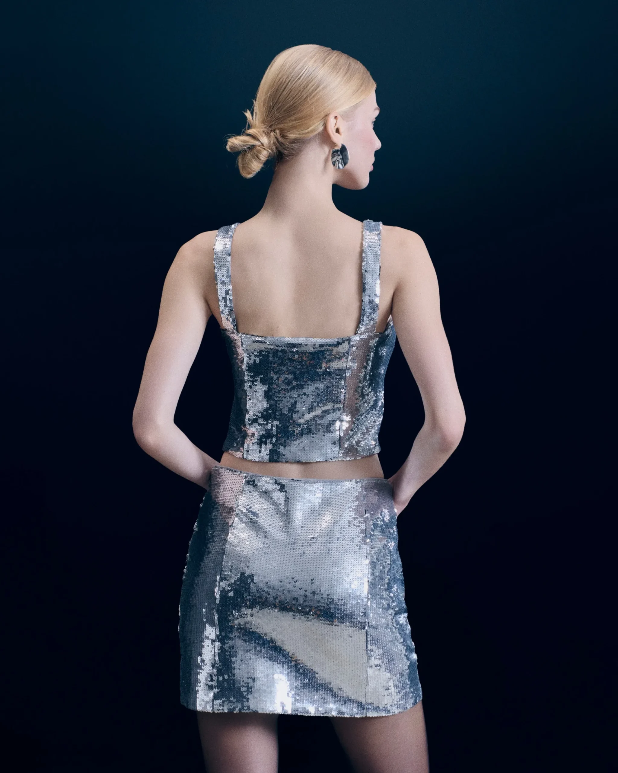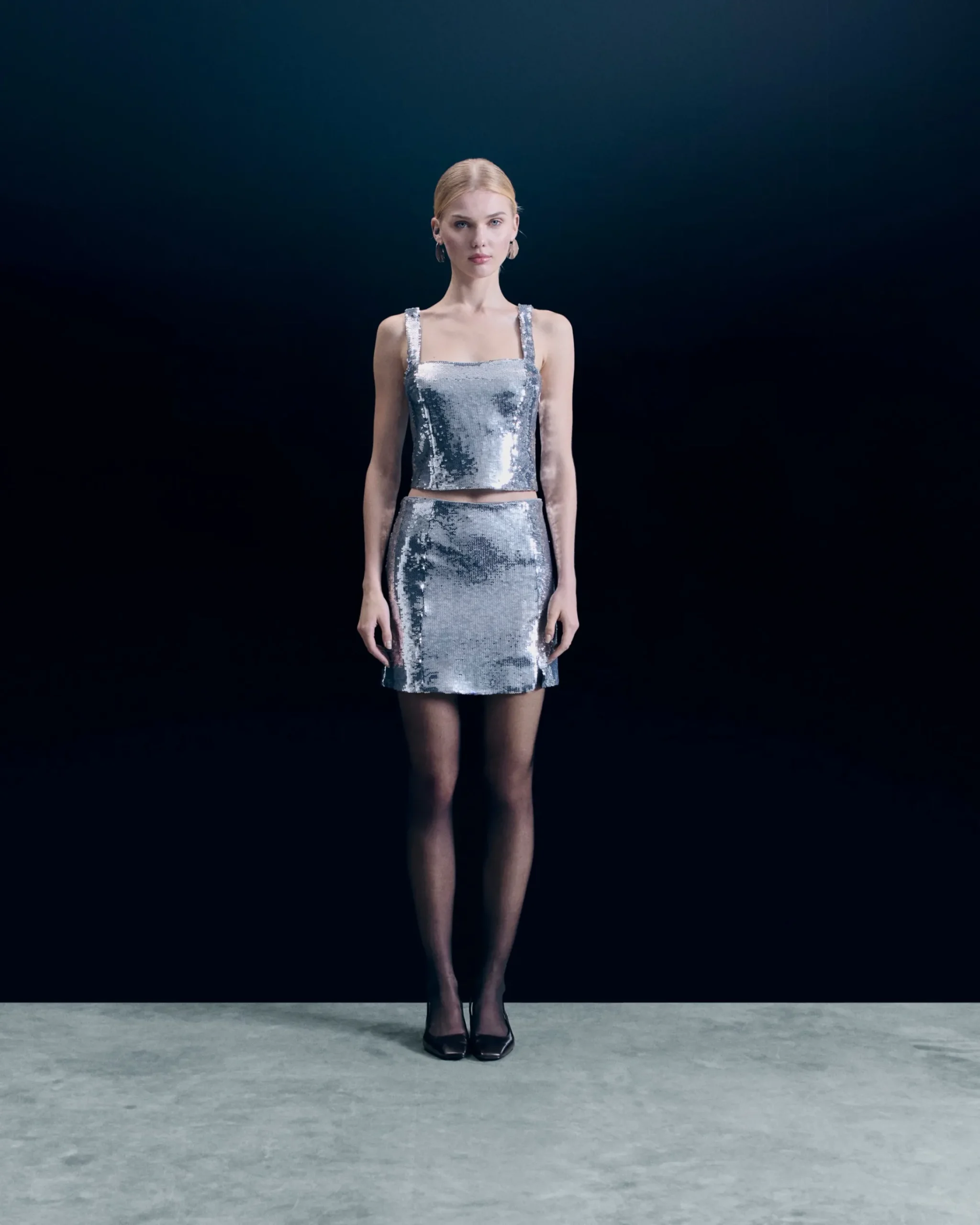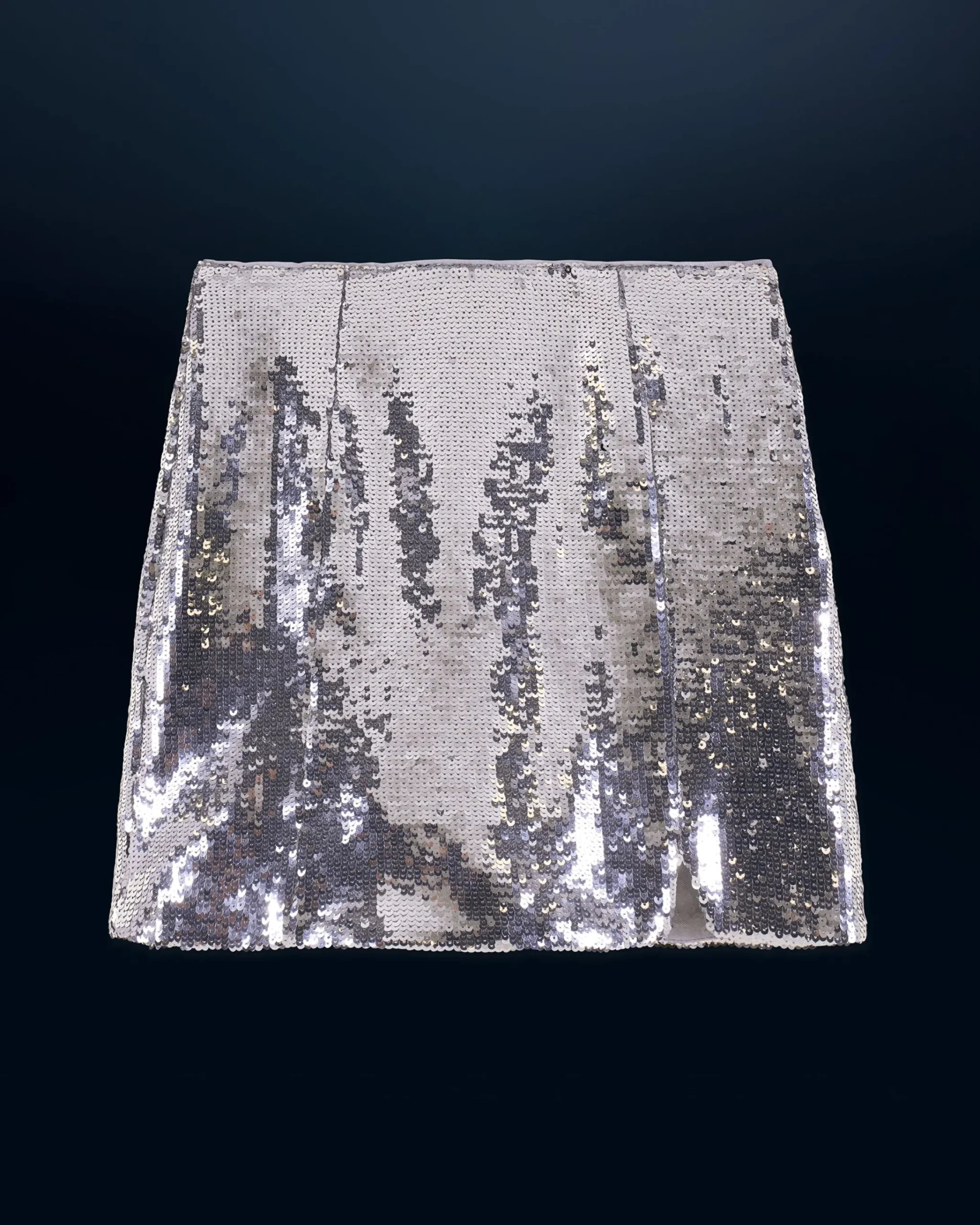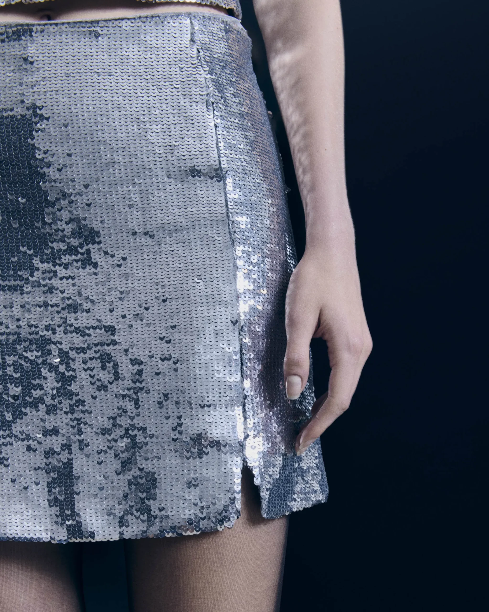 Brilla di mille luci con questa gonna corta ornata di paillettes argentate. Il taglio strutturato e la vestibilità impeccabile ne fanno un capo chiave del tuo guardaroba. Da indossare come total look con il top abbinato per un effetto irresistibile.