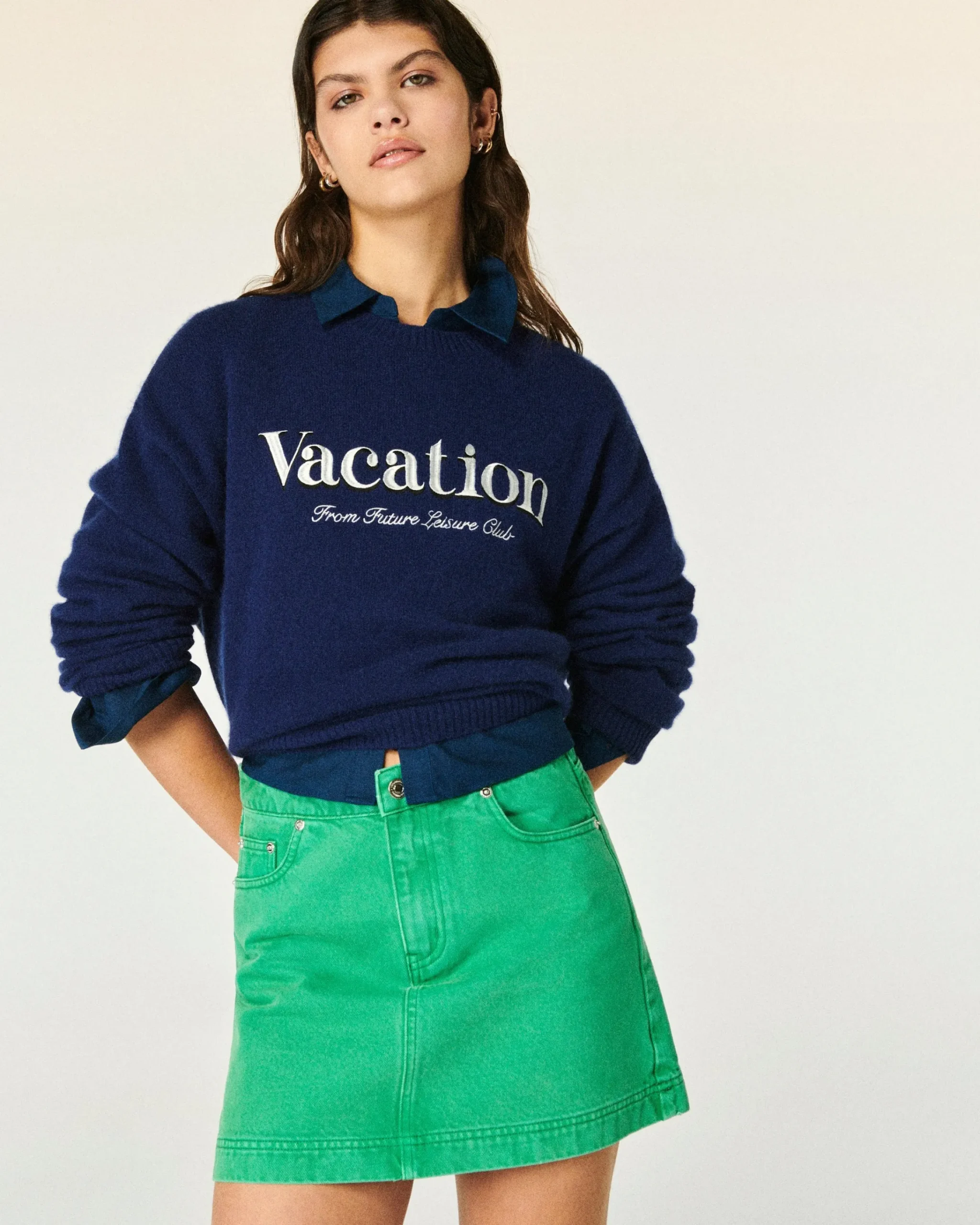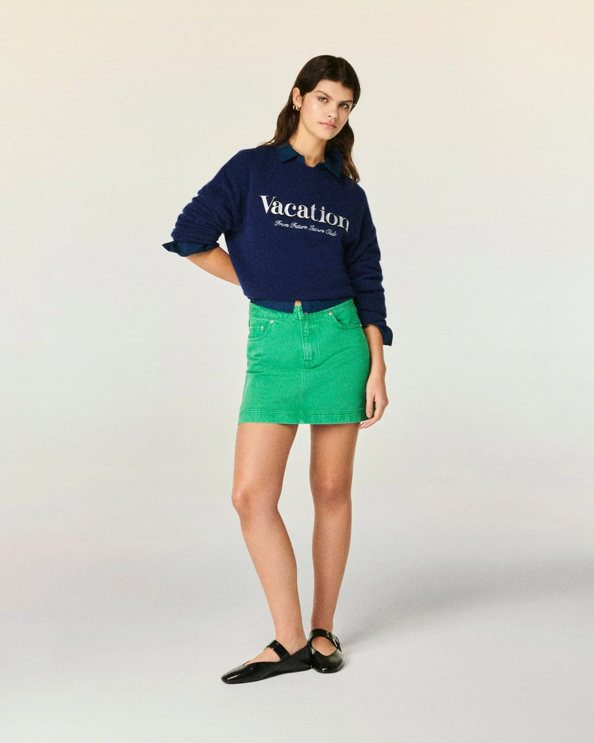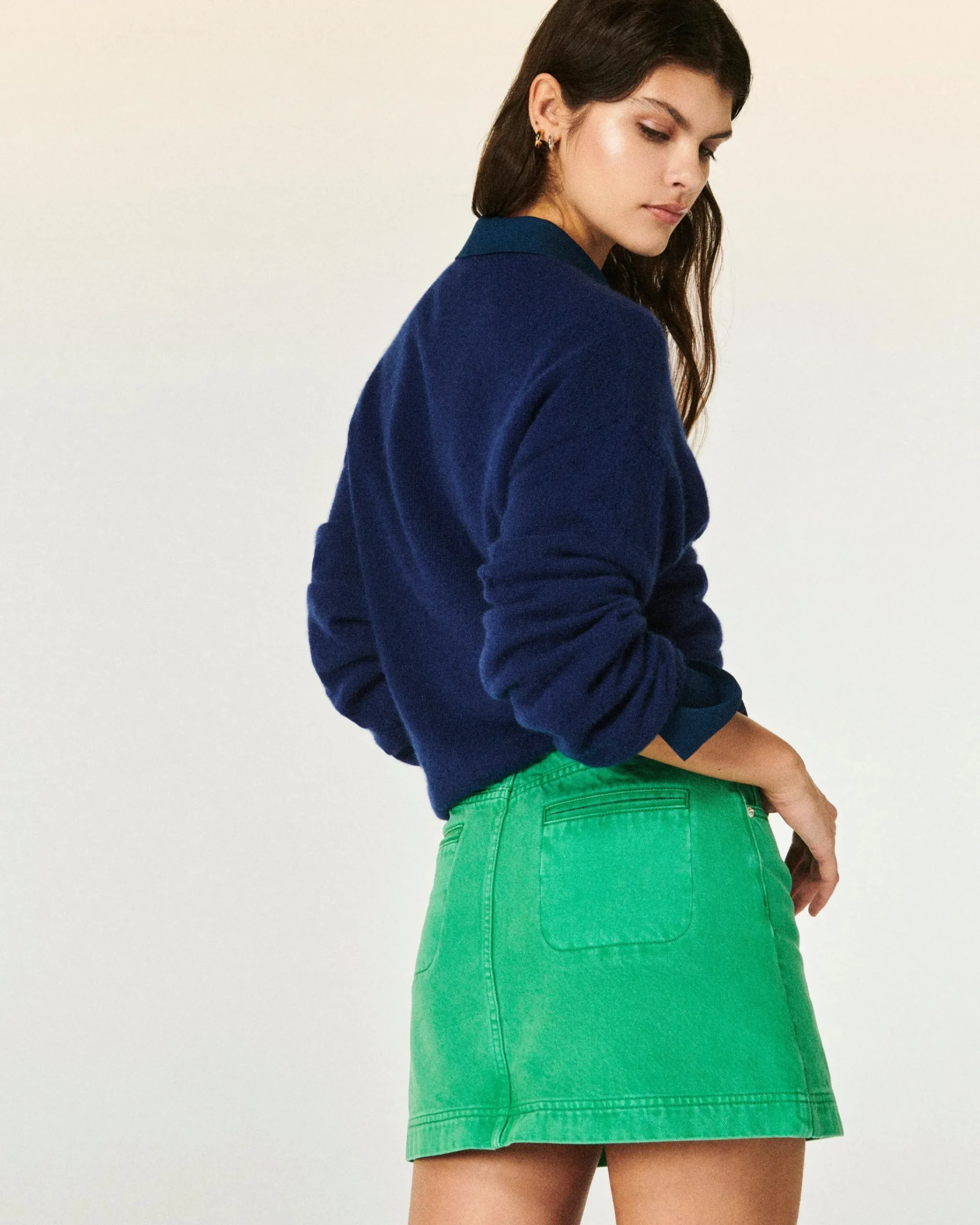 Un verde audace è il protagonista di questa minigonna in denim. Con una chiusura a zip con bottone, è dotata di due tasche sul davanti e due tasche a filetto finte dietro. Chic e casual allo stesso tempo, puoi giocare con le sovrapposizioni indossandola con una camicia in cotone infilata sotto un maglione in maglia.