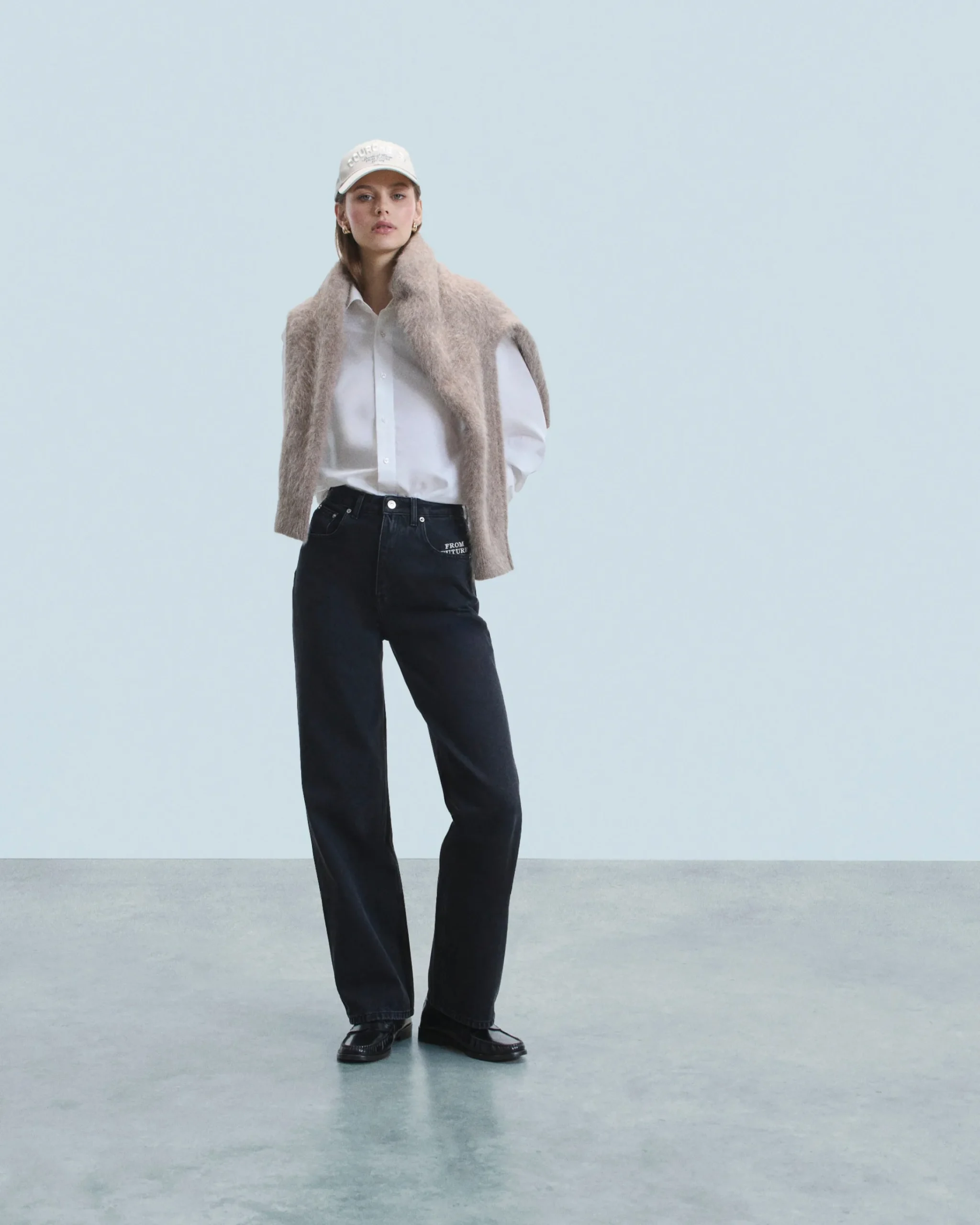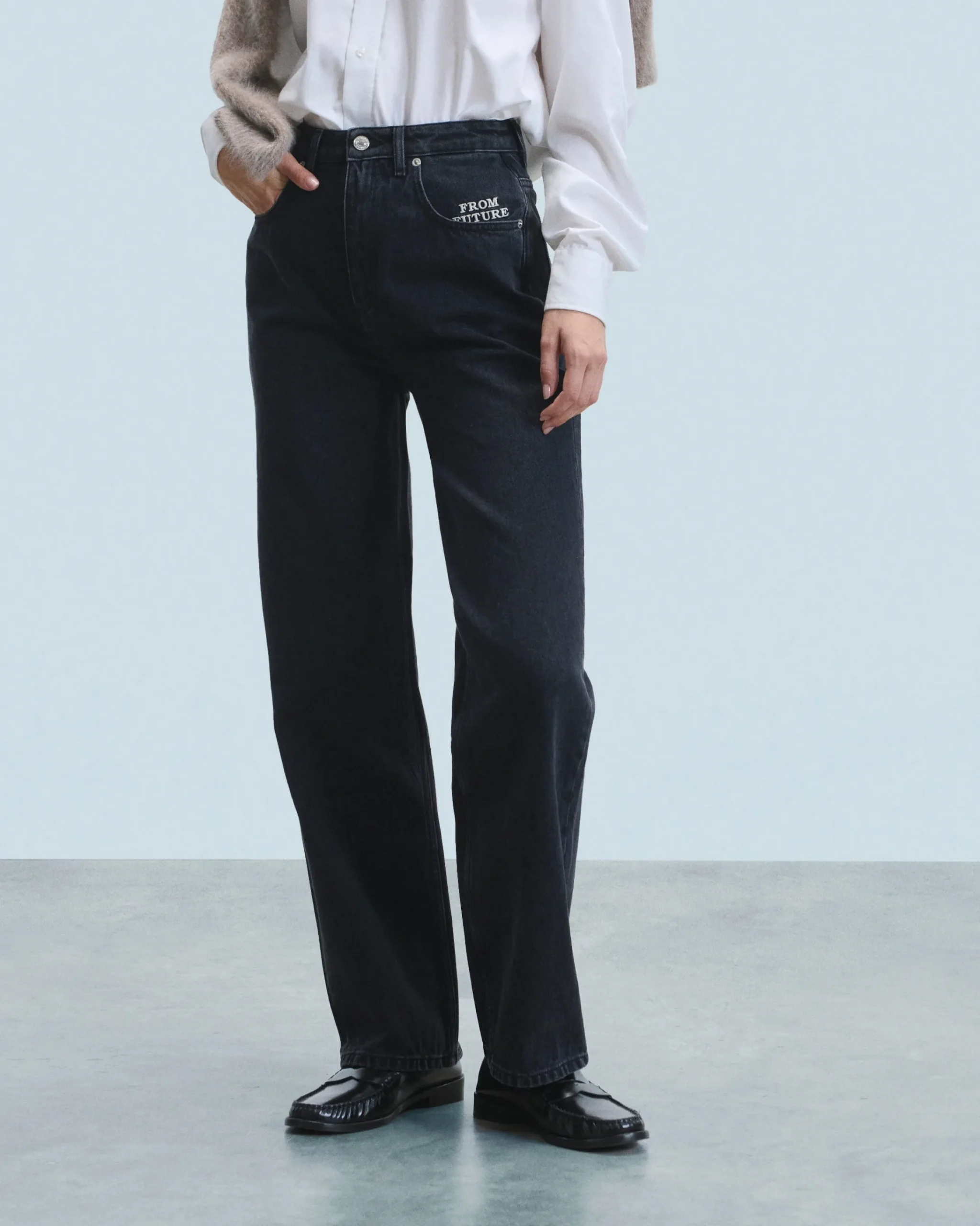 Jeans perfetti. Dettaglio nel ricamo semi-alzante “From Future” sulla tasca sinistra. Gambe dritte per allungare la silhouette senza modellare troppo. Un tempo senza tempo che indosserai tutto l’anno.