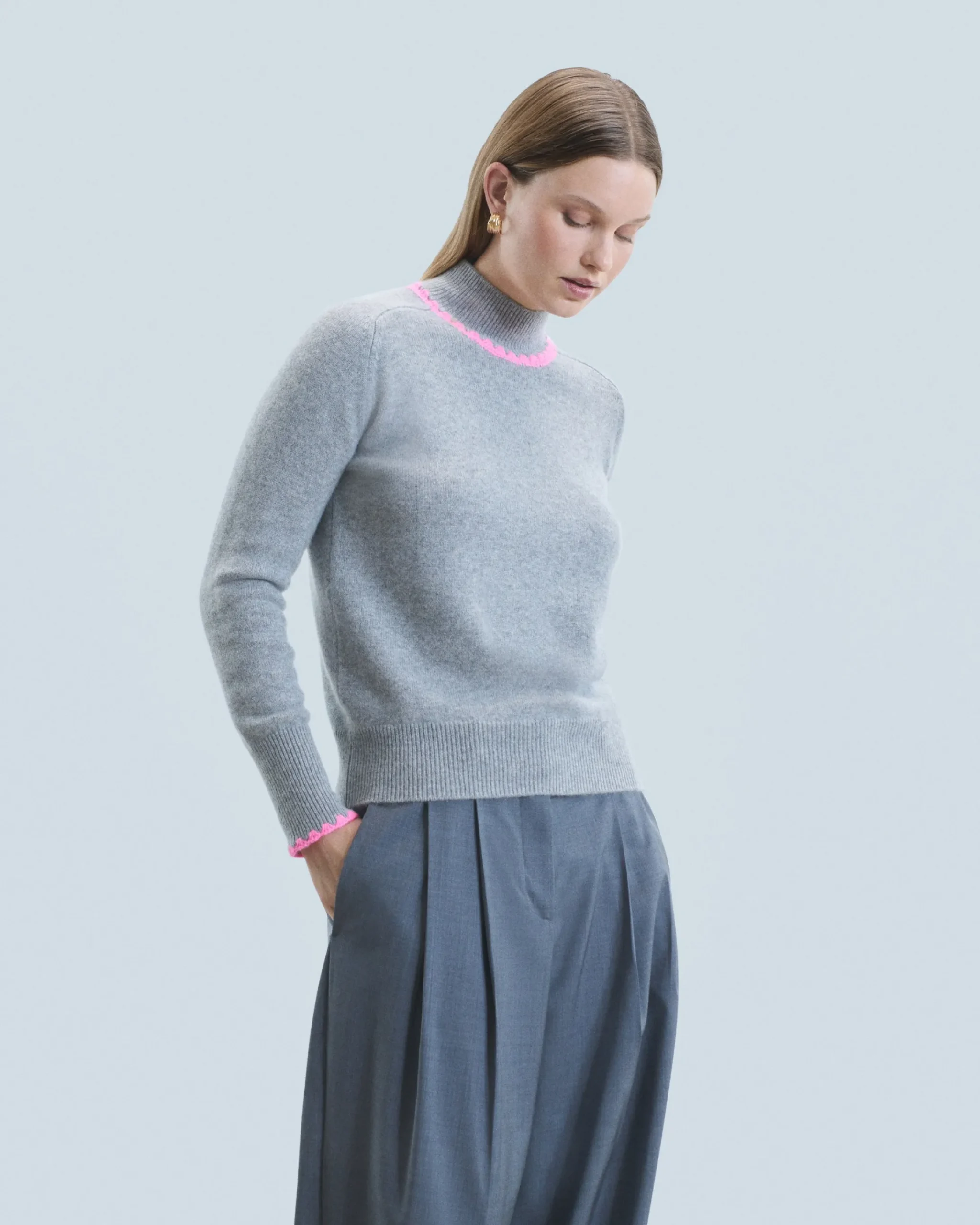 Con maniche lunghe e bordi a coste, questo maglione in cashmere combina comfort ed eleganza. Il dettaglio che fa la differenza: i bordini a contrasto che sottolineano delicatamente il collo alto e i polsini. Componi un look chic indossandolo con una gonna morbida e un paio di décolleté!