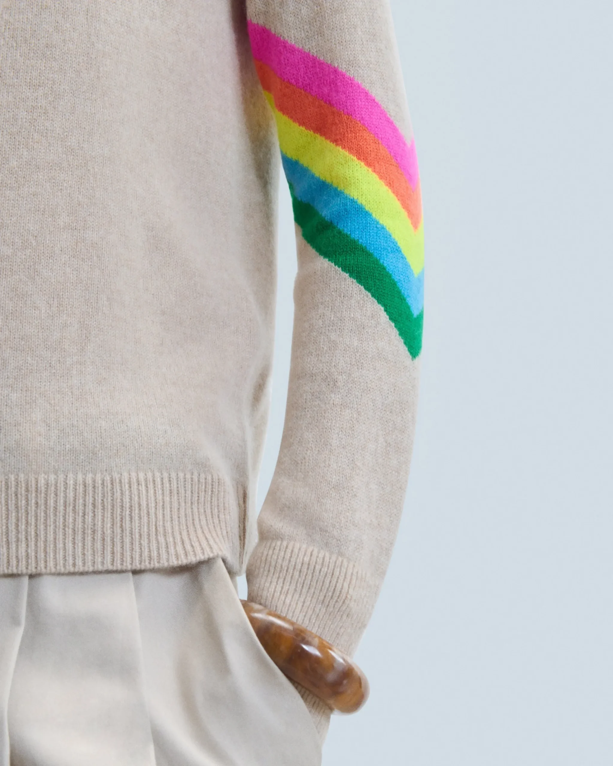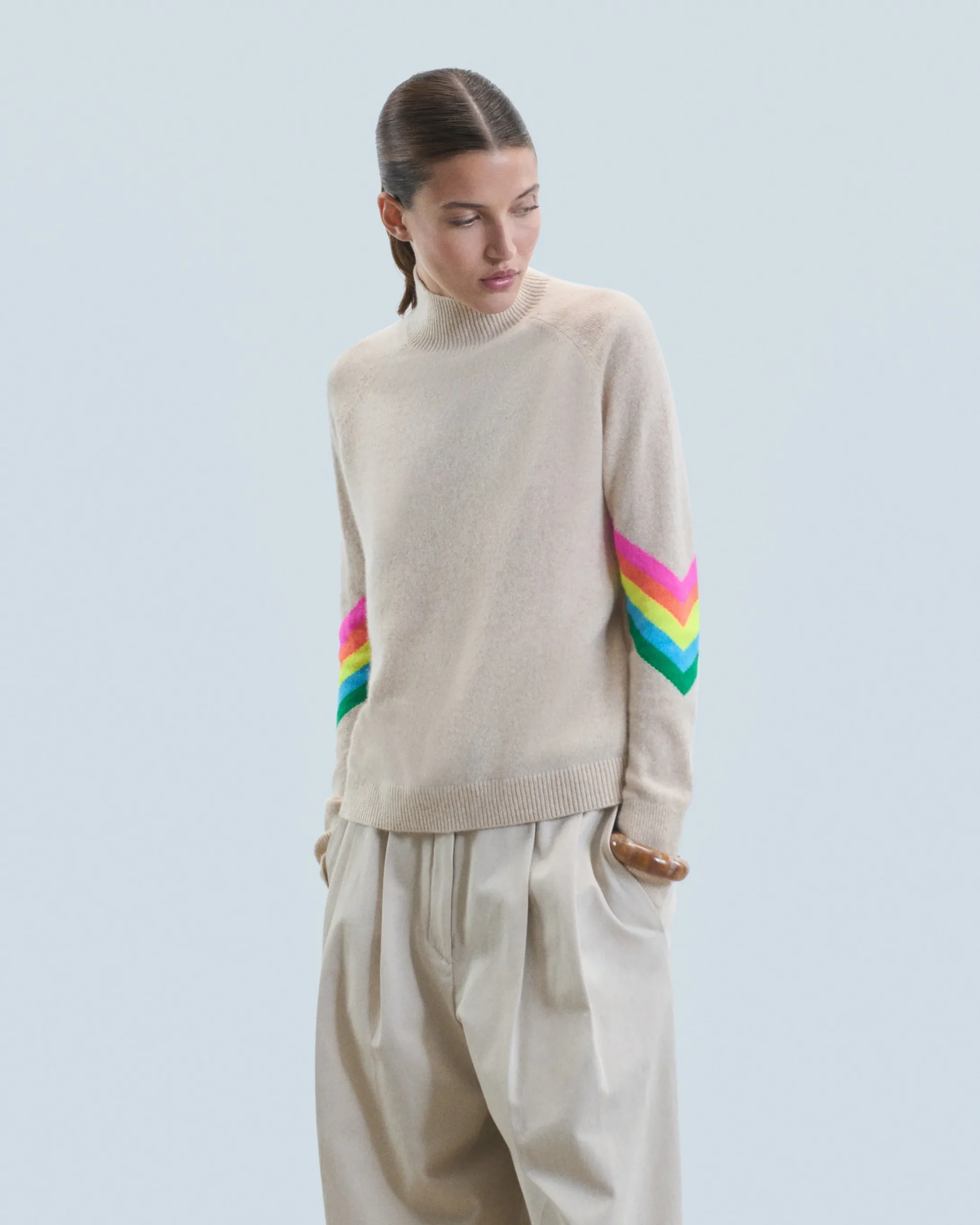 Pezzo iconico del guardaroba From Future, questo maglione corto in cashmere leggero è vivacizzato da bande multicolori sulle maniche. Con un collo alto e bordi a coste, ravviverà il tuo look di stagione con un tocco audace. Indossalo con un paio di pantaloni larghi o una gonna morbida!