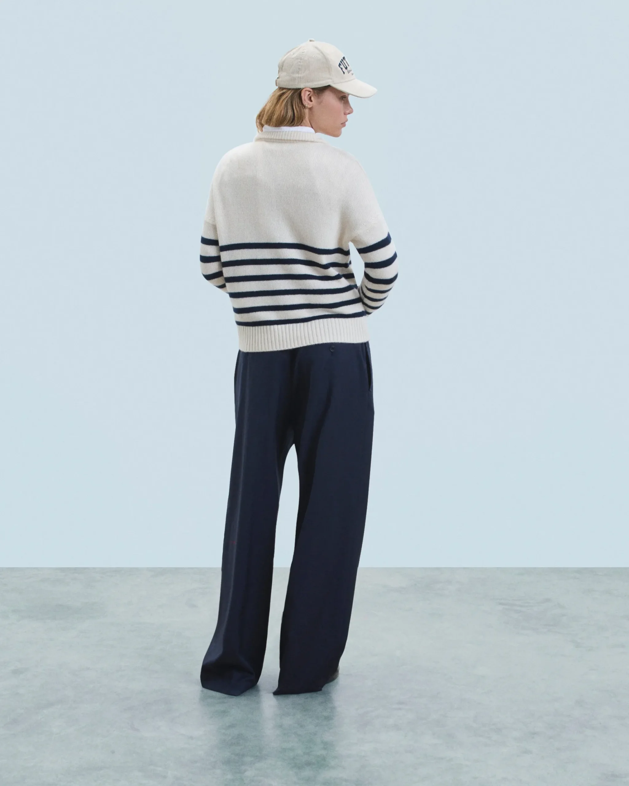 L’irrinunciabile maglione marinière si reinventa in una versione oversize e confezionata in cashmere. Vivacizzato da righe a contrasto, presenta un collo alto con zip, maniche lunghe e bordi a coste. Elegante e senza tempo, puoi abbinarlo a un paio di jeans a gamba larga e una giacca strutturata.