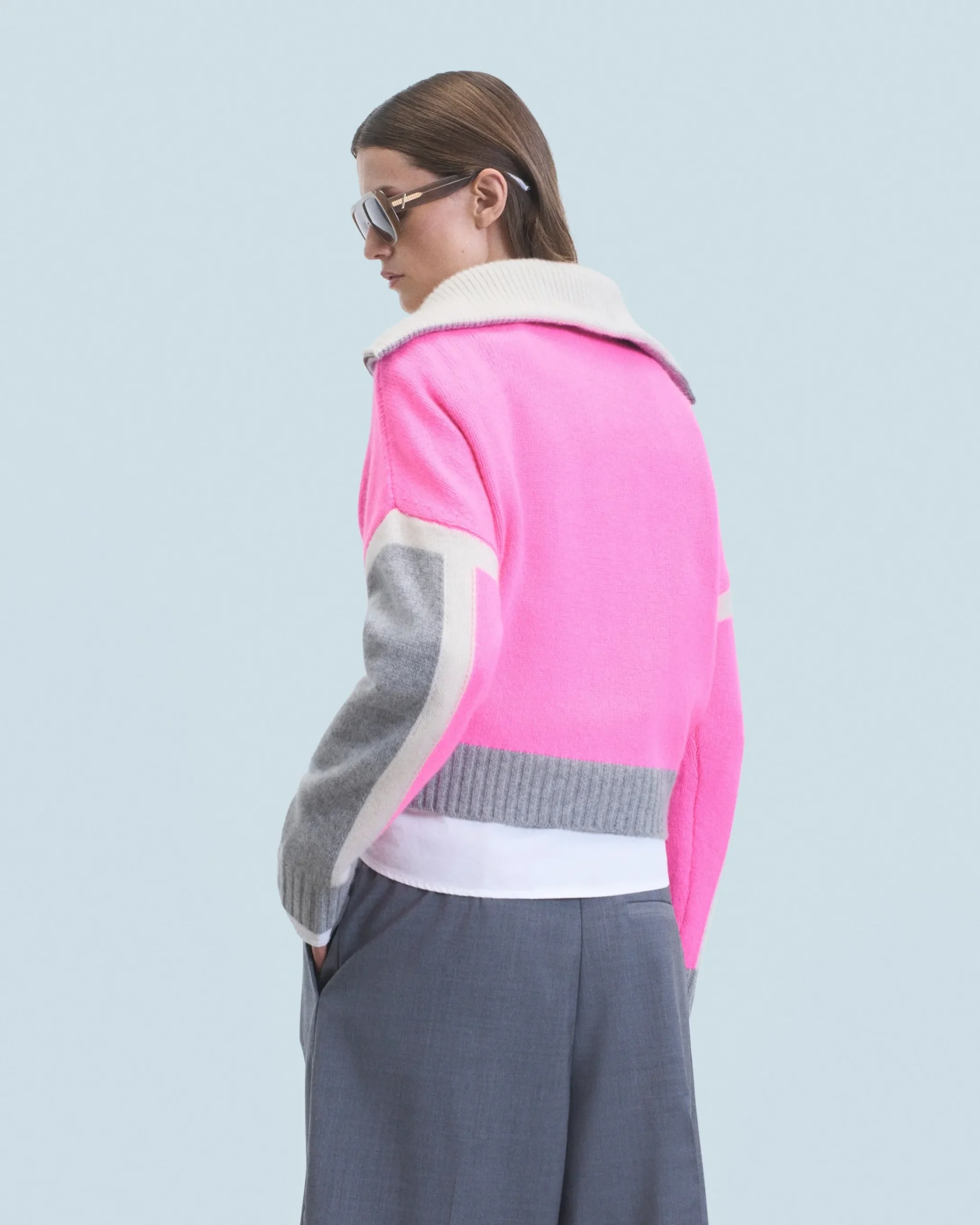 Taglio impeccabile e linee decise: questo maglione tricolore è arricchito da bande a contrasto per un look elegante e strutturato. Realizzato in cashmere, presenta un collo a camionista, maniche lunghe e bordi a coste. Decisamente audace, si abbina perfettamente a un jeans strutturato o a una gonna fluida. – Maglione tricolore in cashmere certificato GCS® Donna – Bande a contrasto – Collo a camionista – Maniche lunghe – Bordi a coste – Vestibilità regular – Il Good Cashmere Standard® (GCS) è uno standard indipendente per un cashmere più sostenibile e responsabile. Mira a migliorare il benessere delle capre da cashmere, le condizioni di lavoro degli allevatori e a proteggere l’ambiente.- Cashmere 6 fili