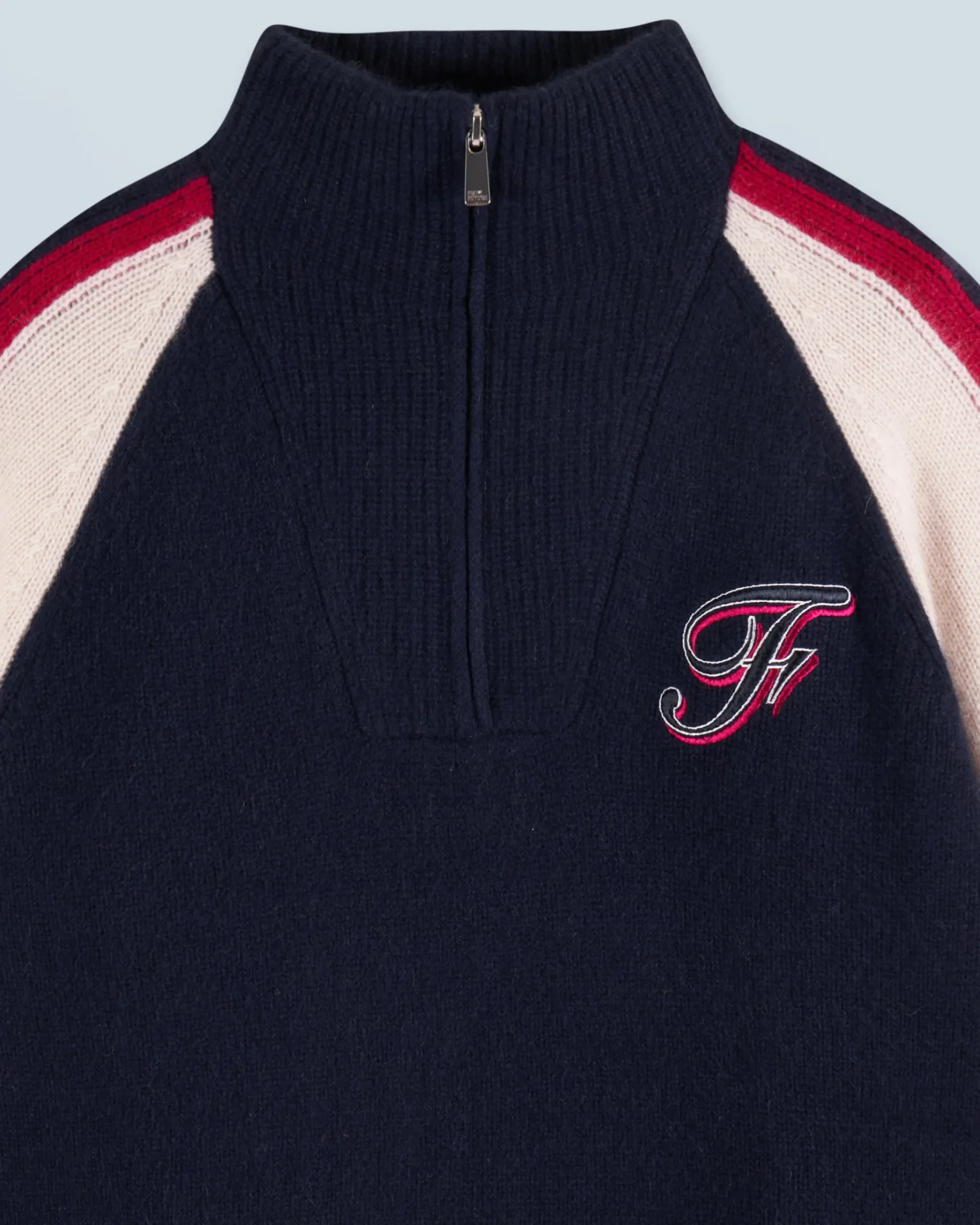 Uno stile sporty-chic per questo maglione in cashmere vivacizzato dall’iconica F ricamata sul petto! Con un collo alto con zip, presenta maniche lunghe e bordi a coste sottolineati da bande a contrasto. Indossalo con un paio di jeans a gamba larga o una gonna morbida per un look chic e strutturato!