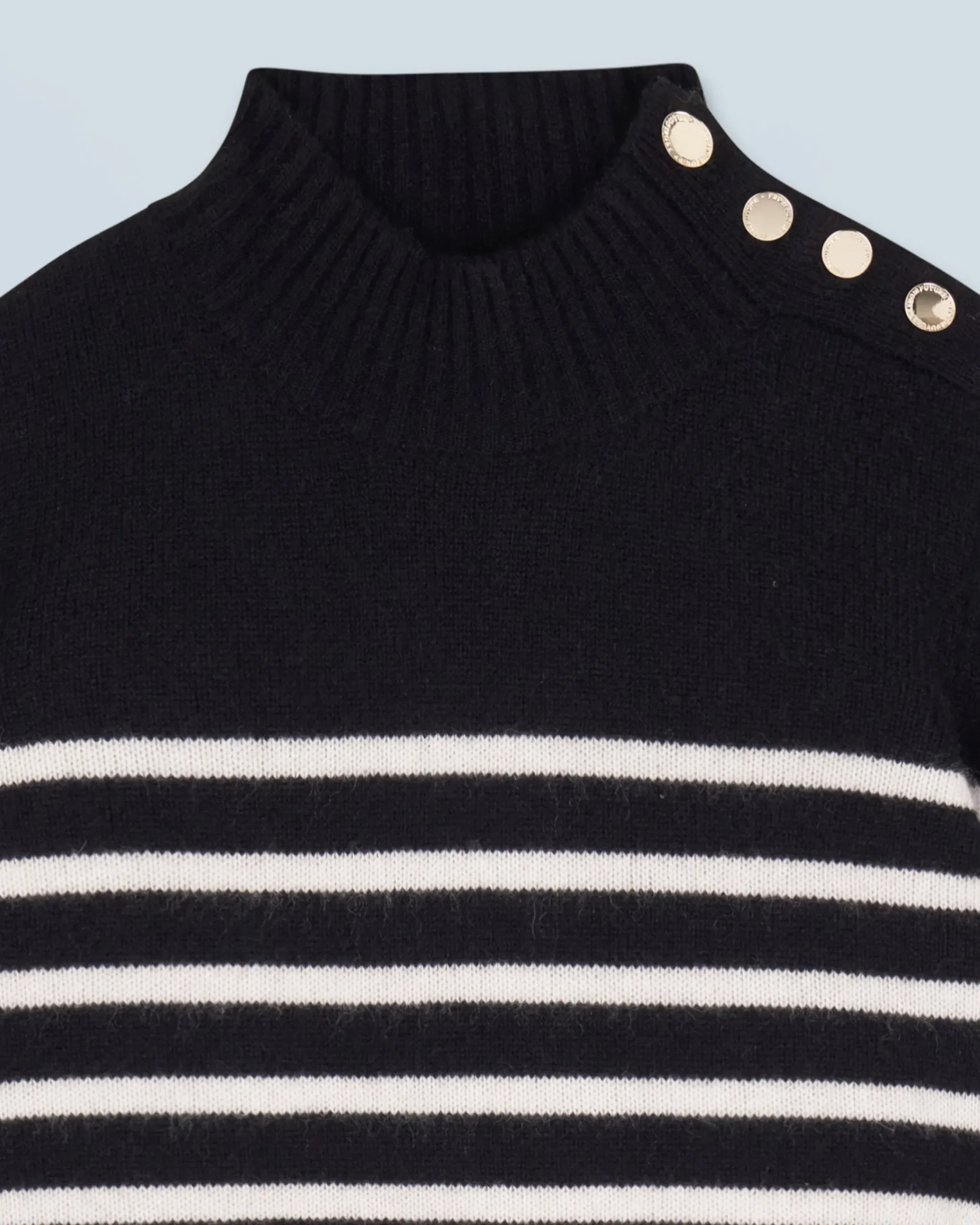 L’intramontabile maglione marinière si reinventa con un tocco di audacia! Confezionato in cashmere, presenta maniche lunghe, un collo alto e bordi a coste. Vivacizzato da bottoni sulle spalle, le sue righe a contrasto conferiscono al tuo look uno stile rilassato ma elegante. Facile da abbinare, puoi indossarlo sopra un vestito morbido o con un paio di jeans casual.