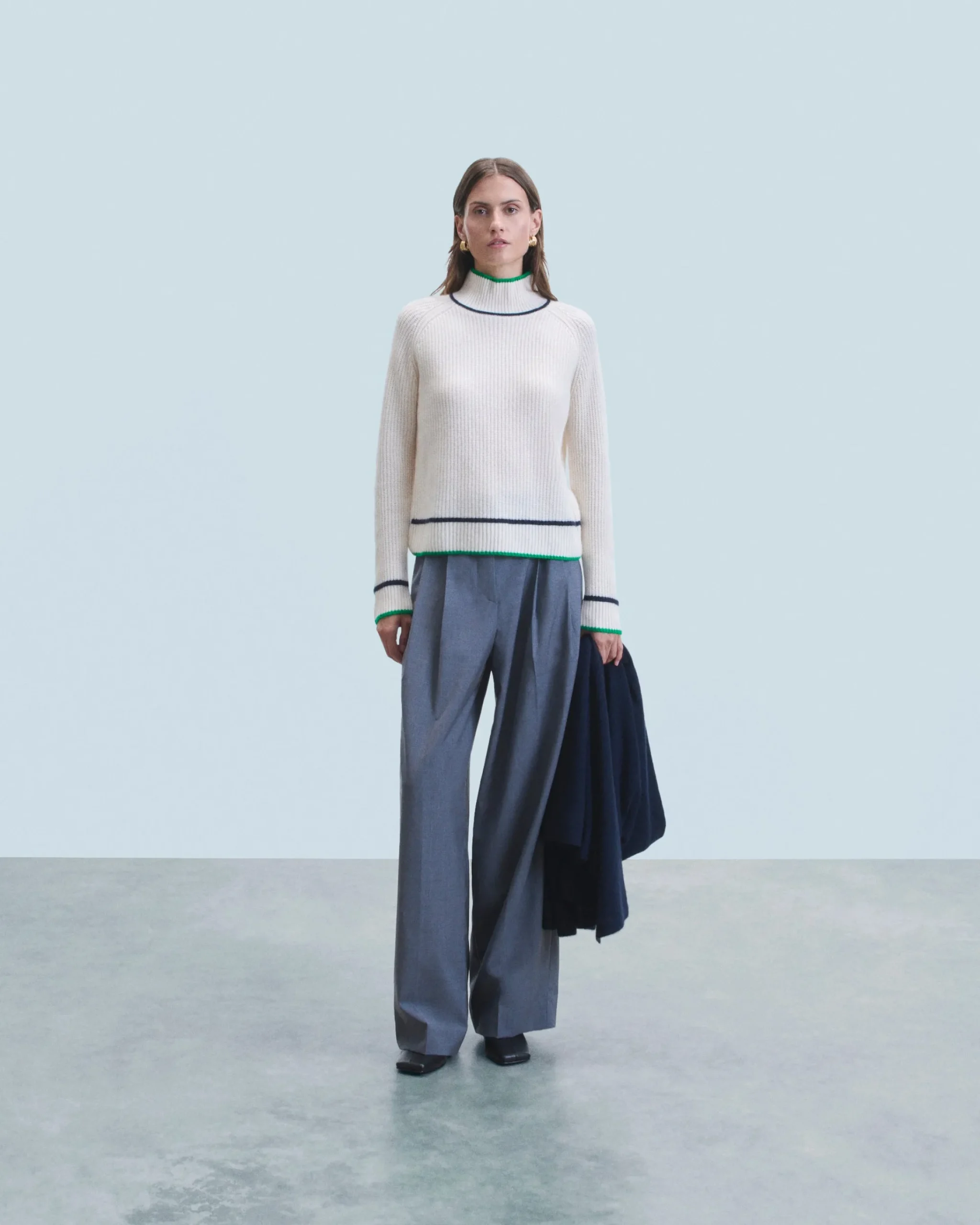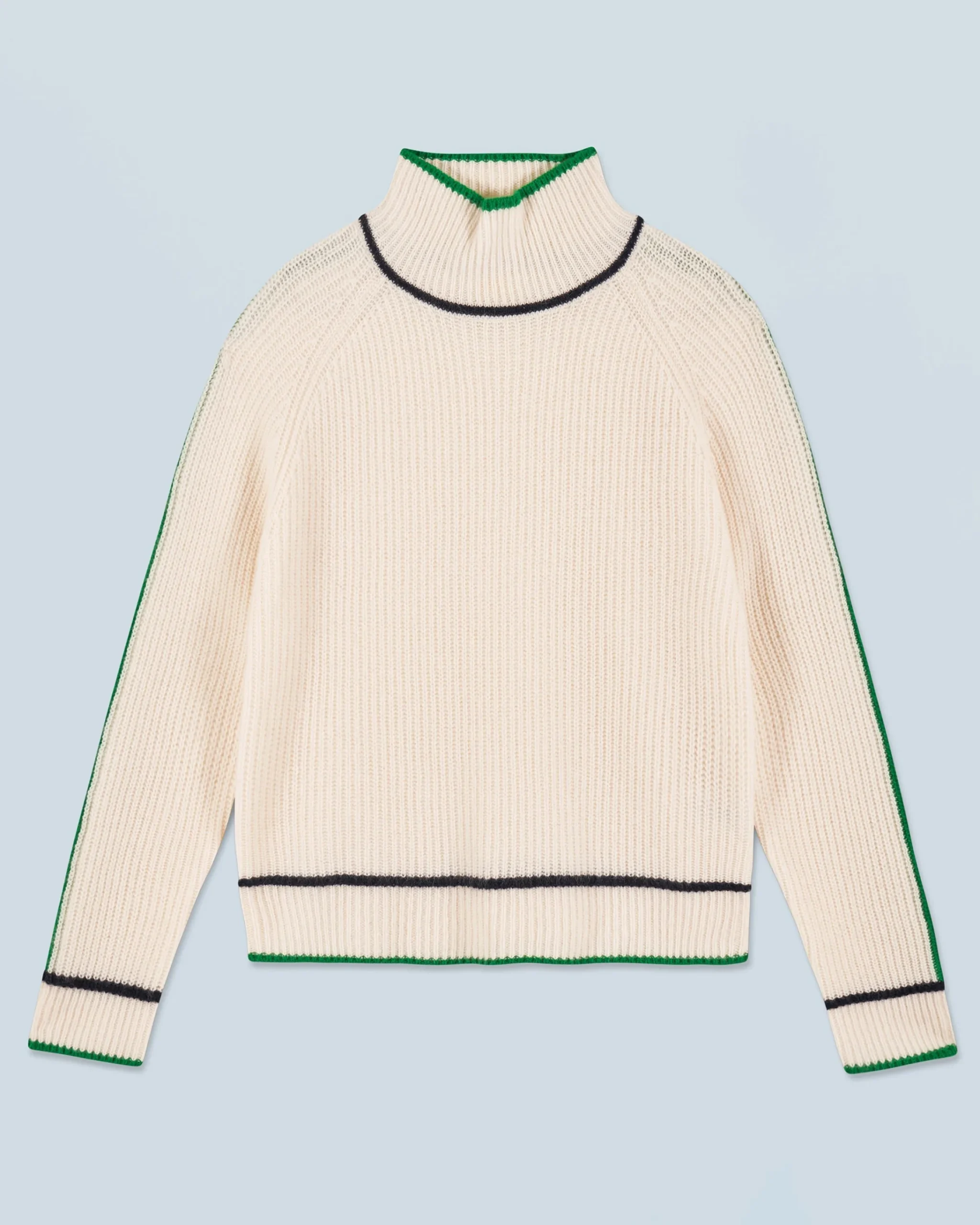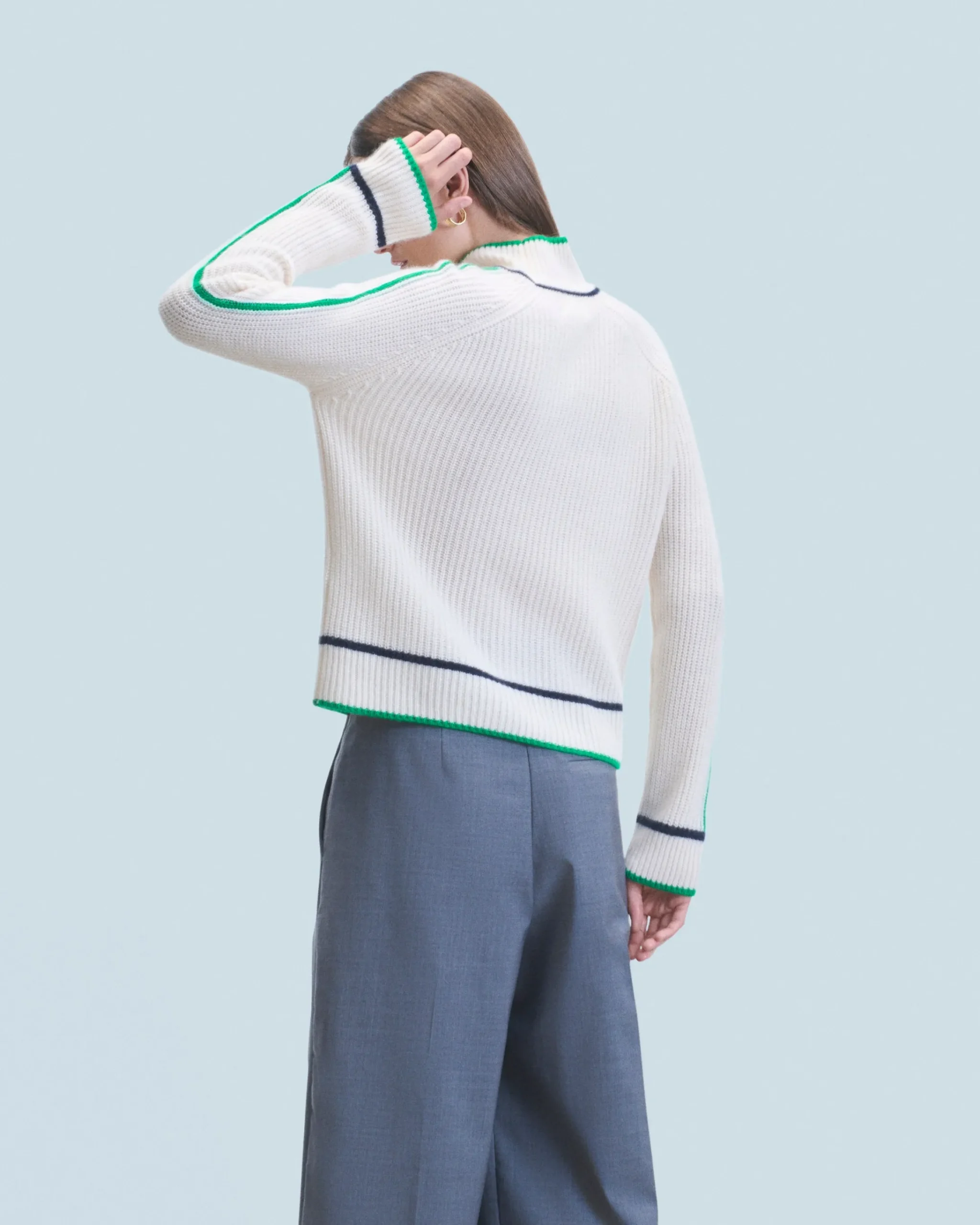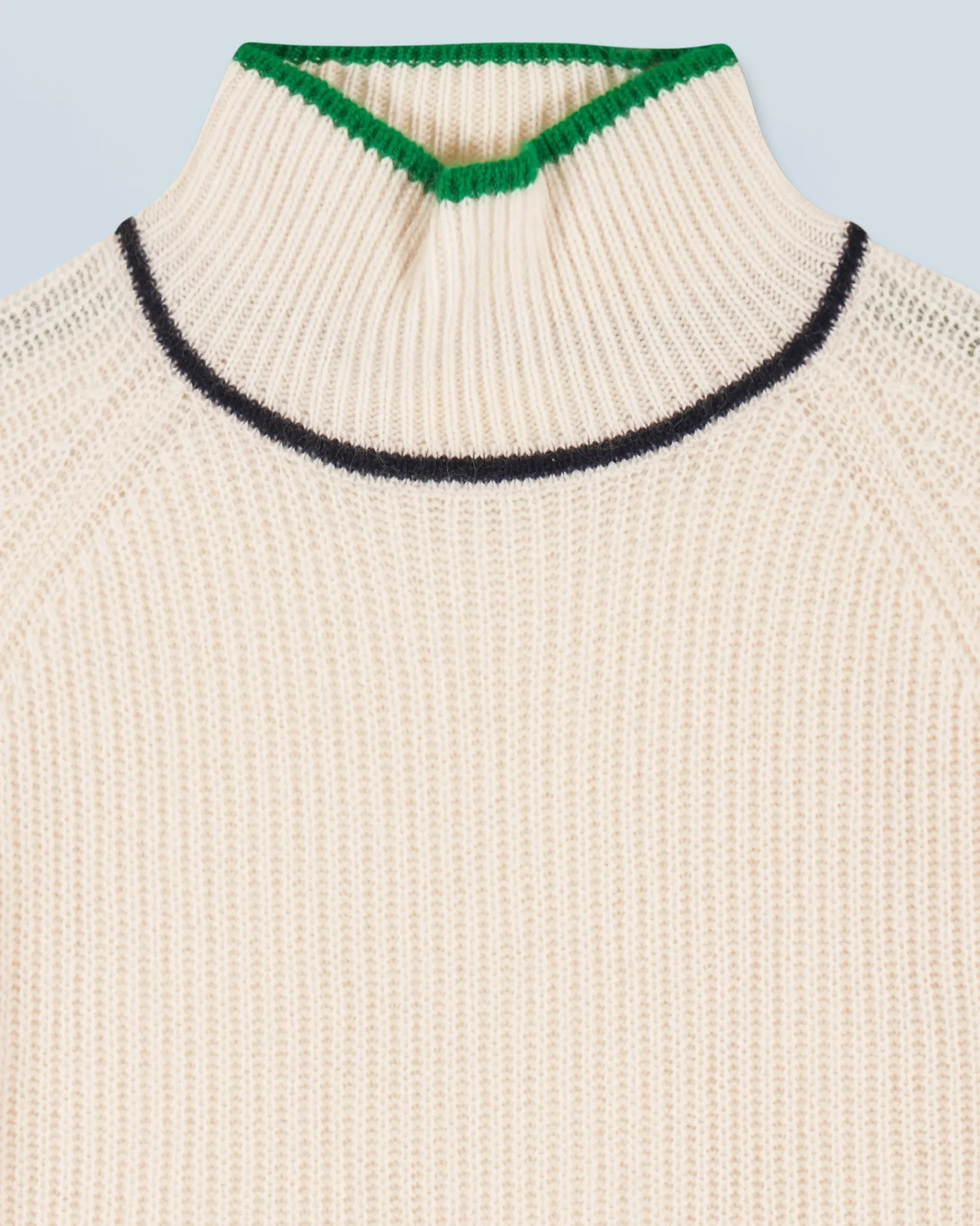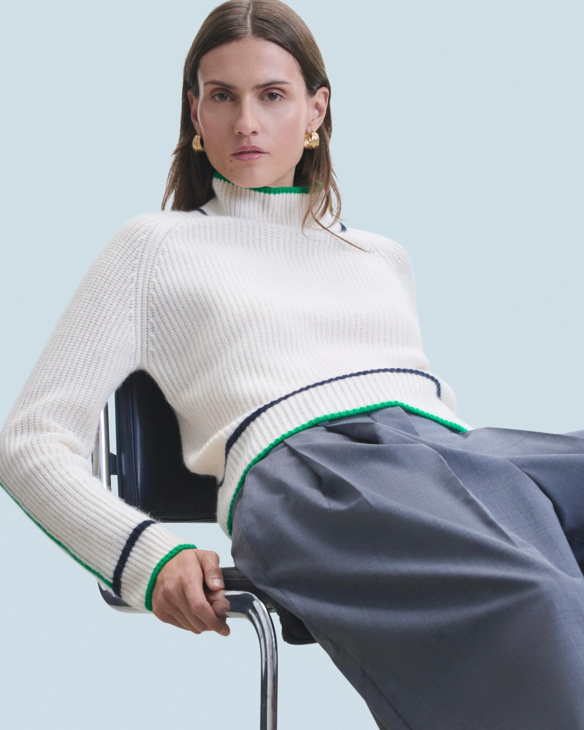 Un filato morbido a costa perlata per questo maglione corto tricolore confezionato in cashmere. Con un collo alto, presenta linee a contrasto lungo le maniche e sui bordi a coste. Elegante e audace, puoi mixarlo con un pantalone ampio, una borsa e un paio di sneakers.