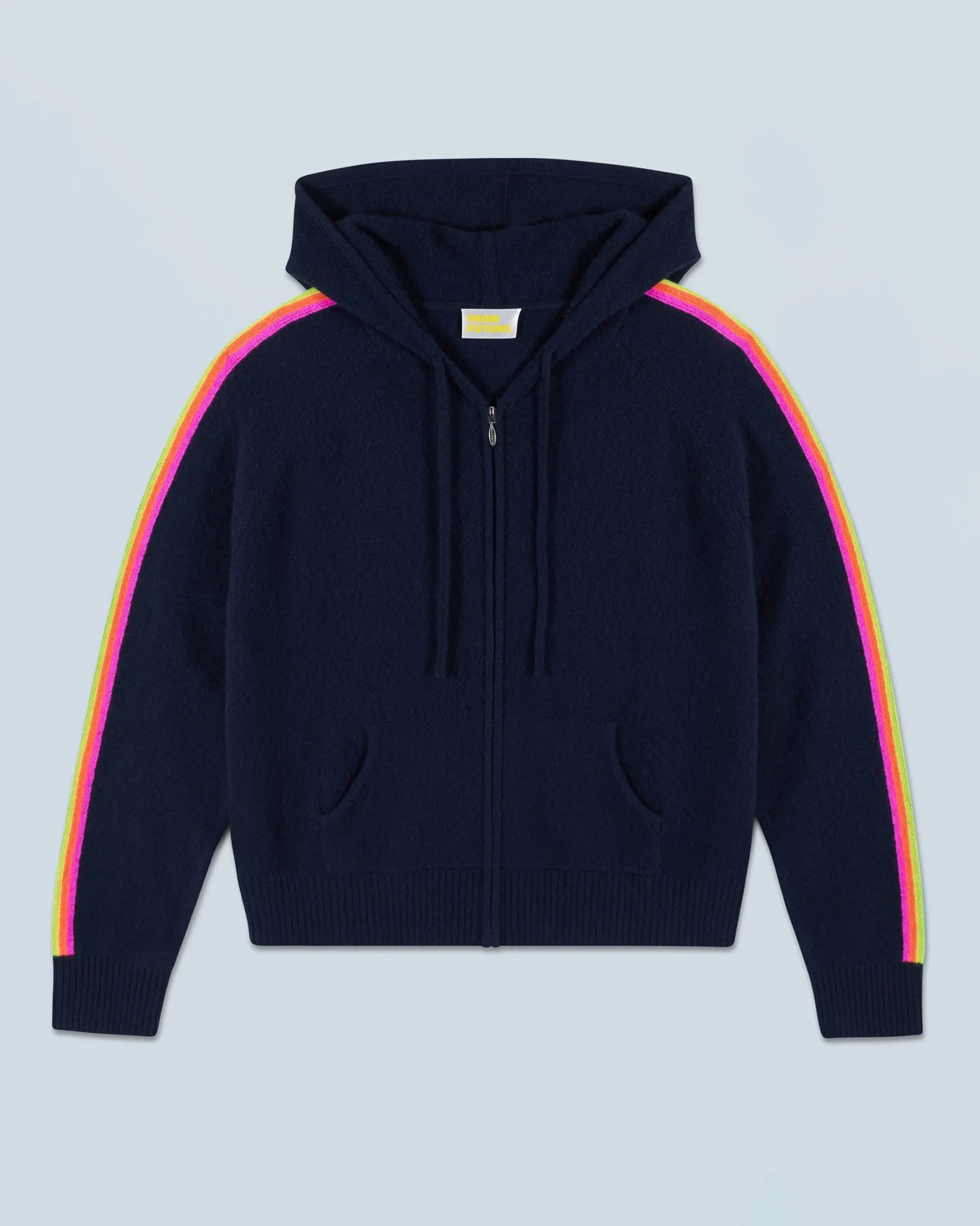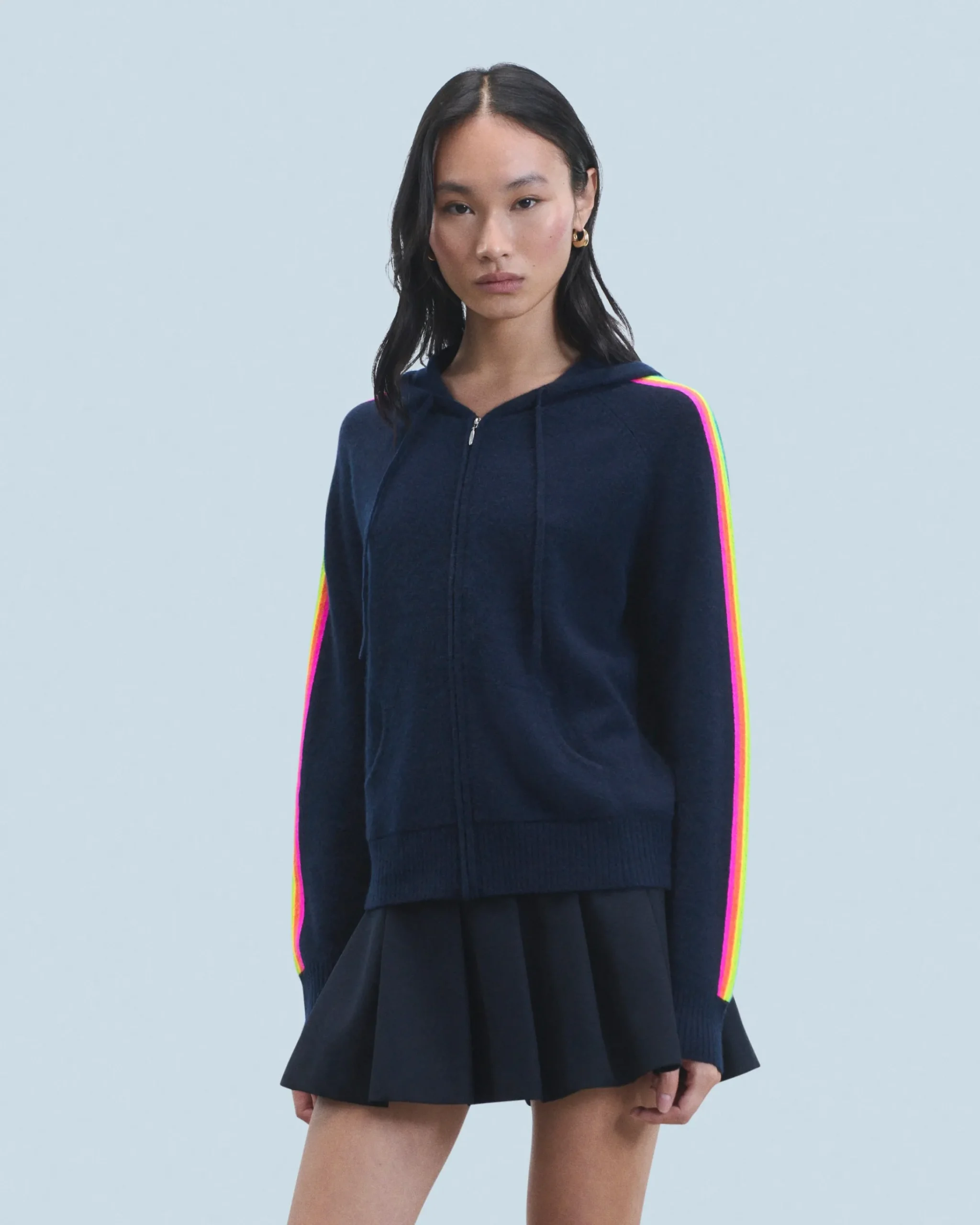 Pezzo iconico del guardaroba From Future, questo maglione con cappuccio presenta bande multicolori lungo le maniche per ravvivare il tuo look di stagione. Realizzato in cashmere morbido e leggero, è dotato di cordoncini, una chiusura a zip e una tasca davanti.
