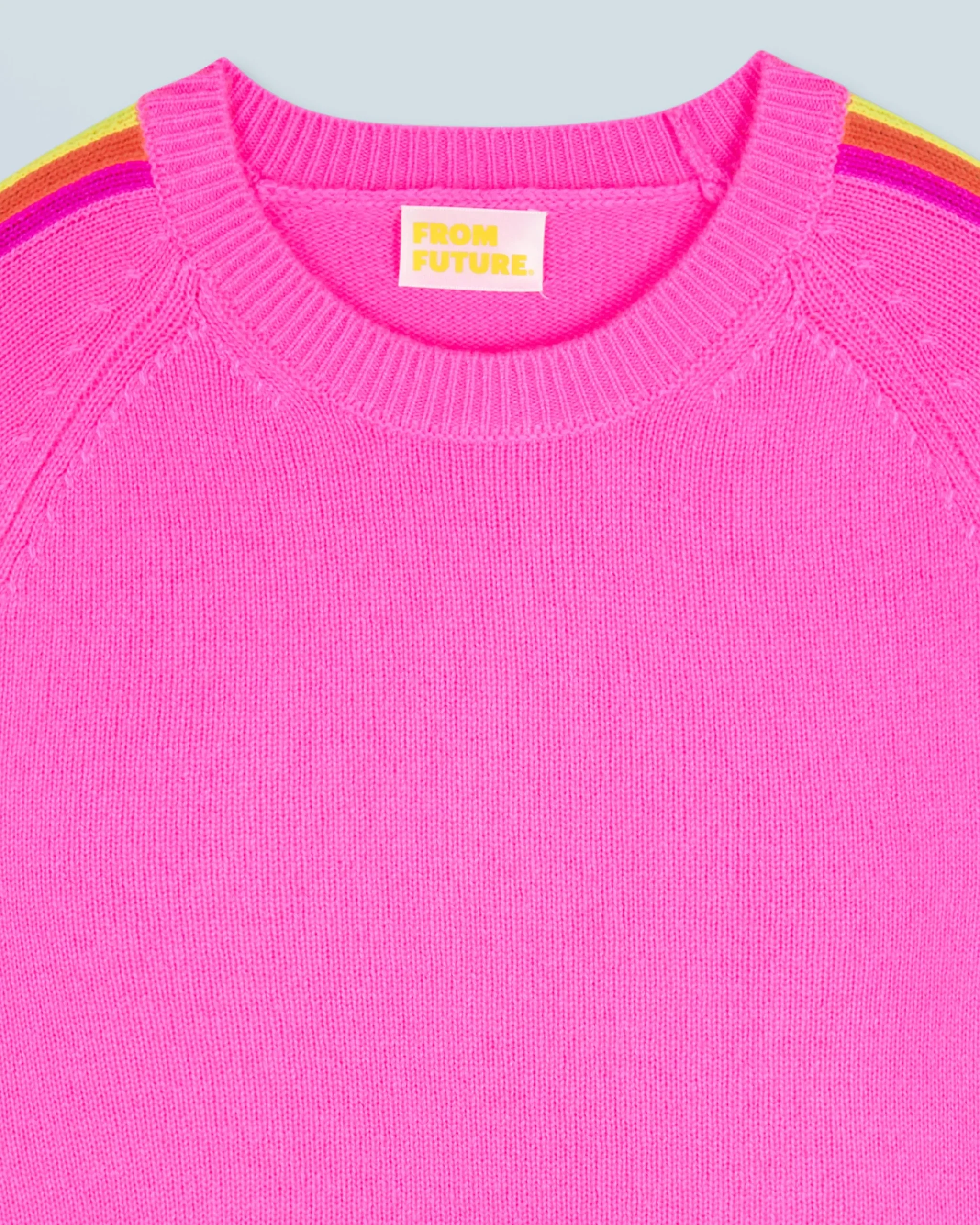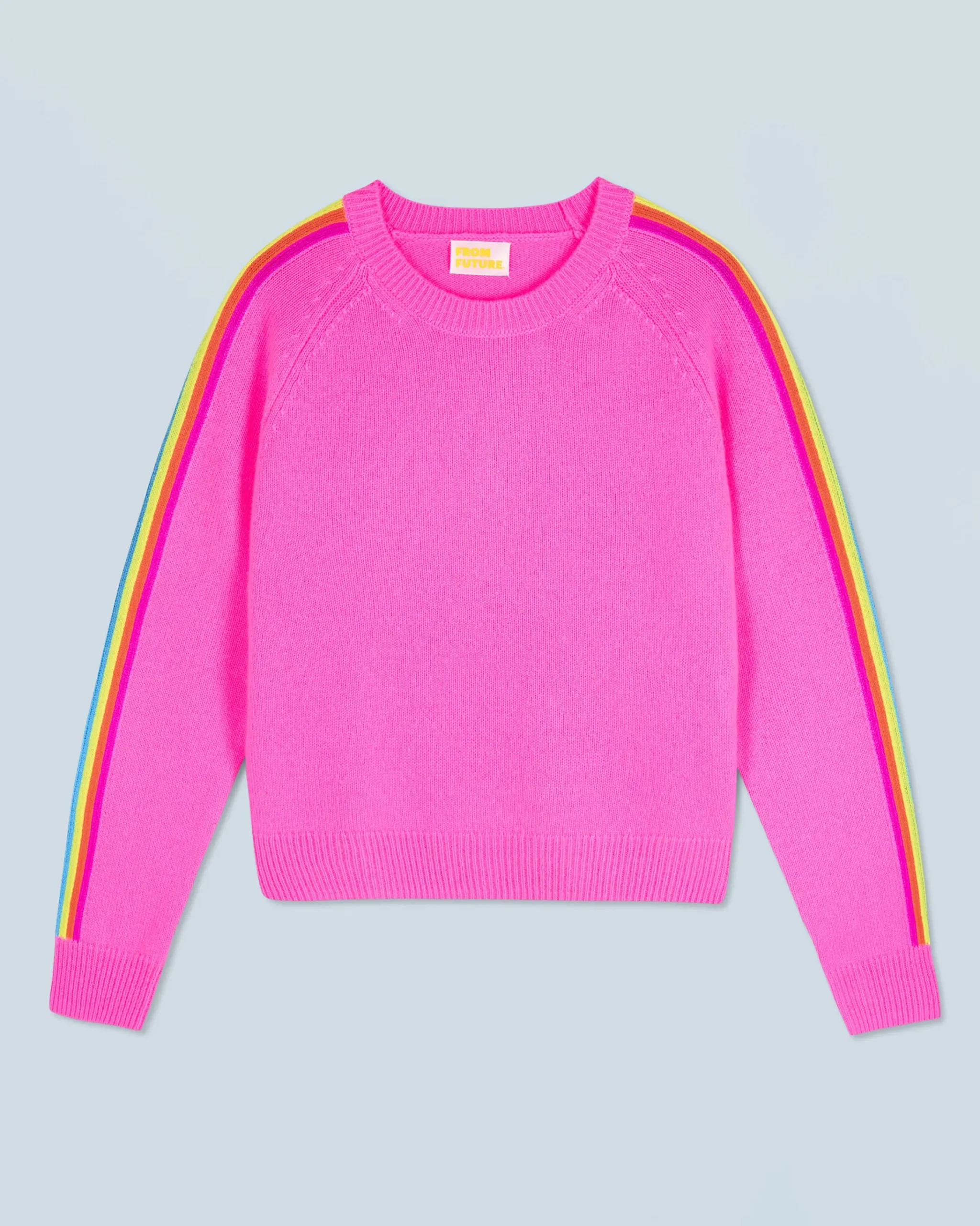 Con uno scollo tondo e bordi a coste, questo maglione corto è realizzato in un filato 100% cashmere per riscaldare il tuo look con stile. Pezzo iconico del guardaroba From Future, è vivacizzato da bande multicolori che corrono lungo le maniche. Indossalo con una t-shirt, un paio di pantaloni larghi e delle sneakers per un look casual!