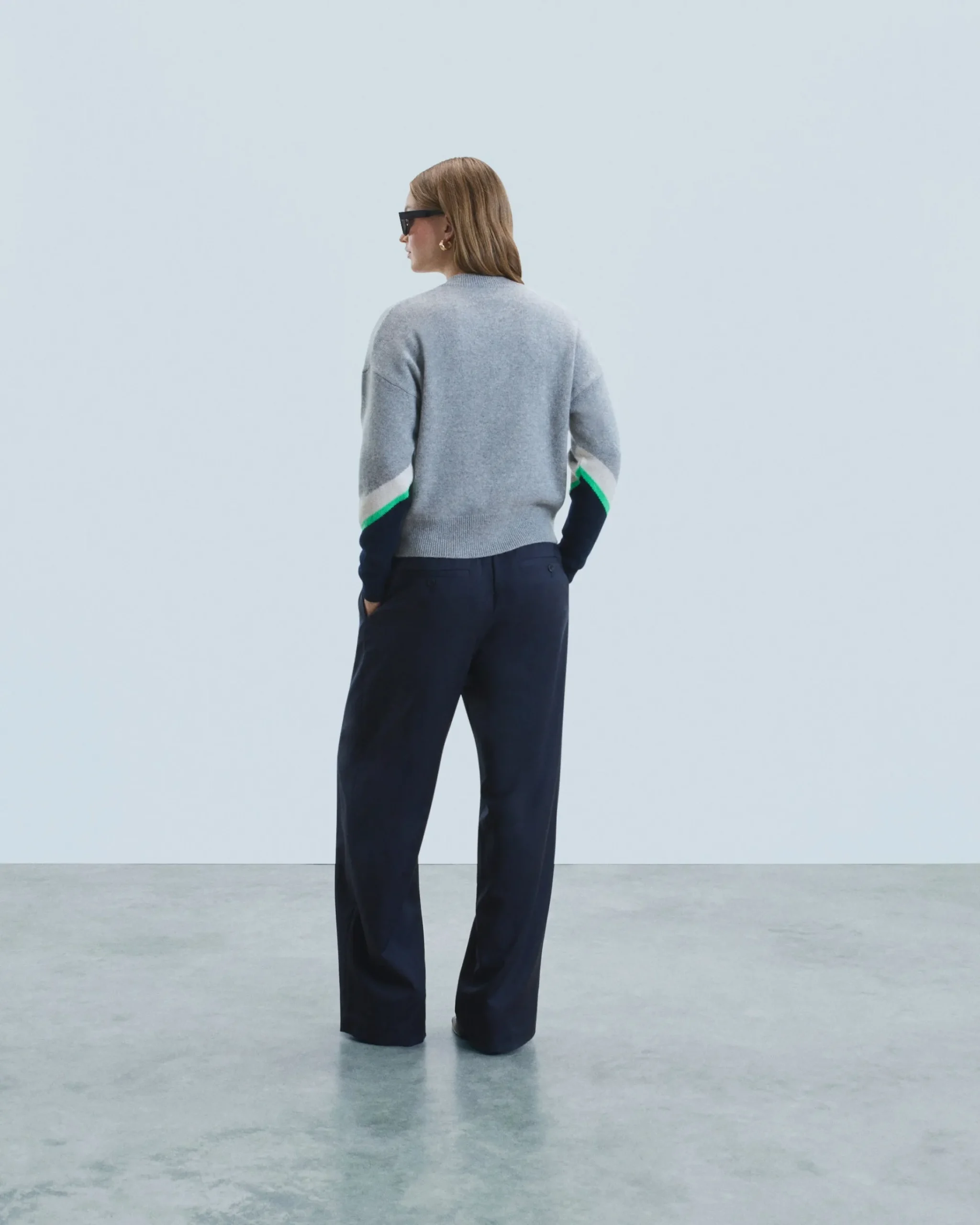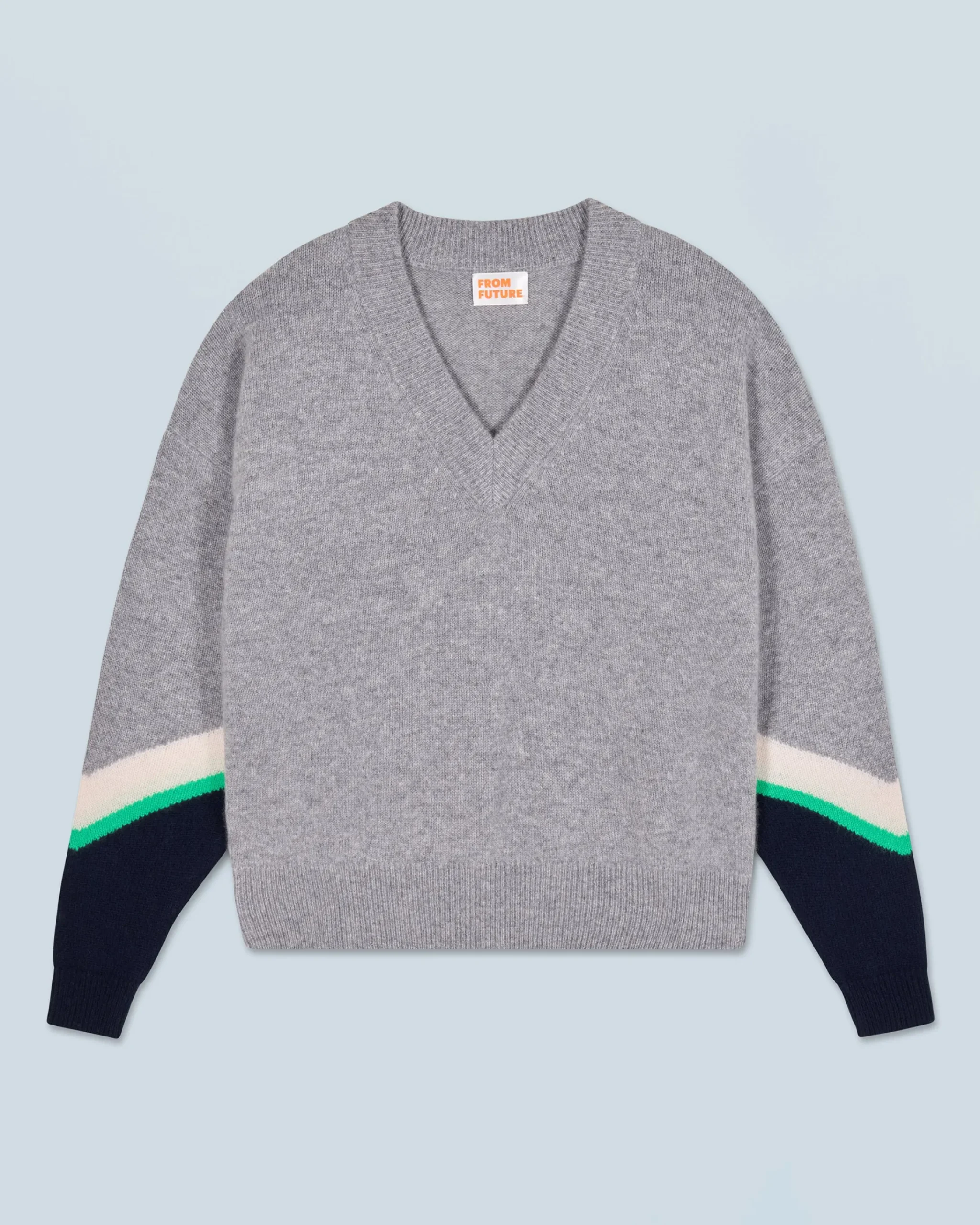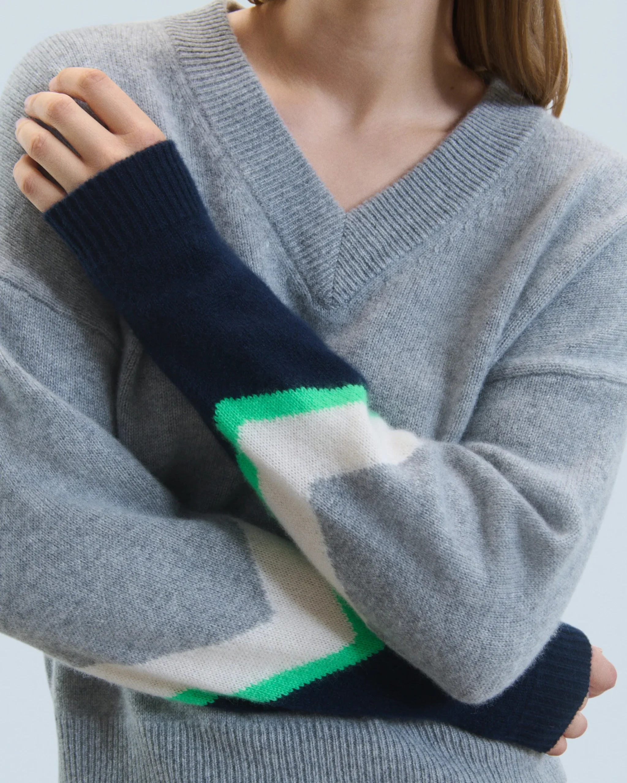 Questo maglione in cashmere presenta uno scollo a V, cuciture a contrasto e bande tricolori. Con maniche lunghe e bordi a coste, disegna un look strutturato con un tocco audace.
