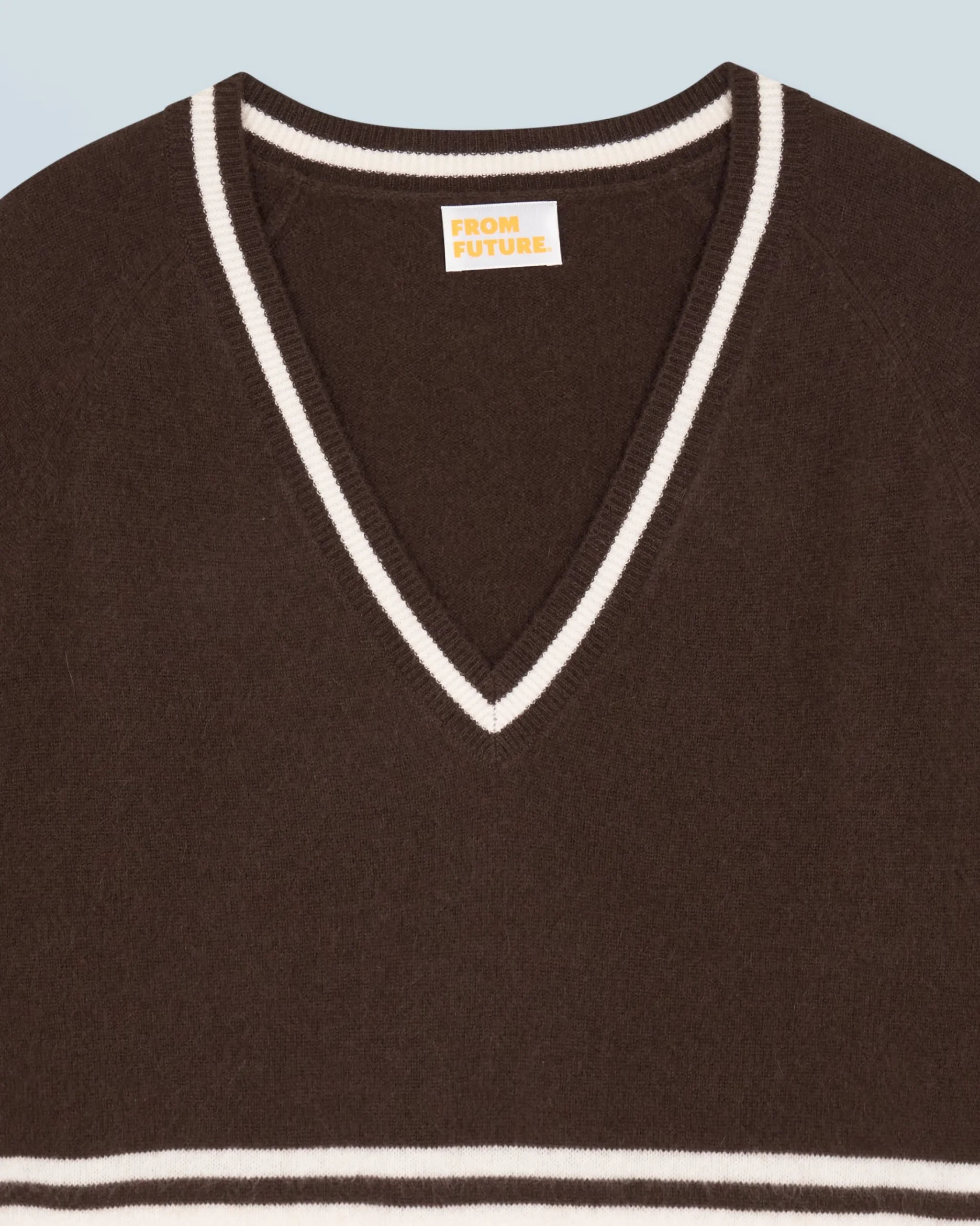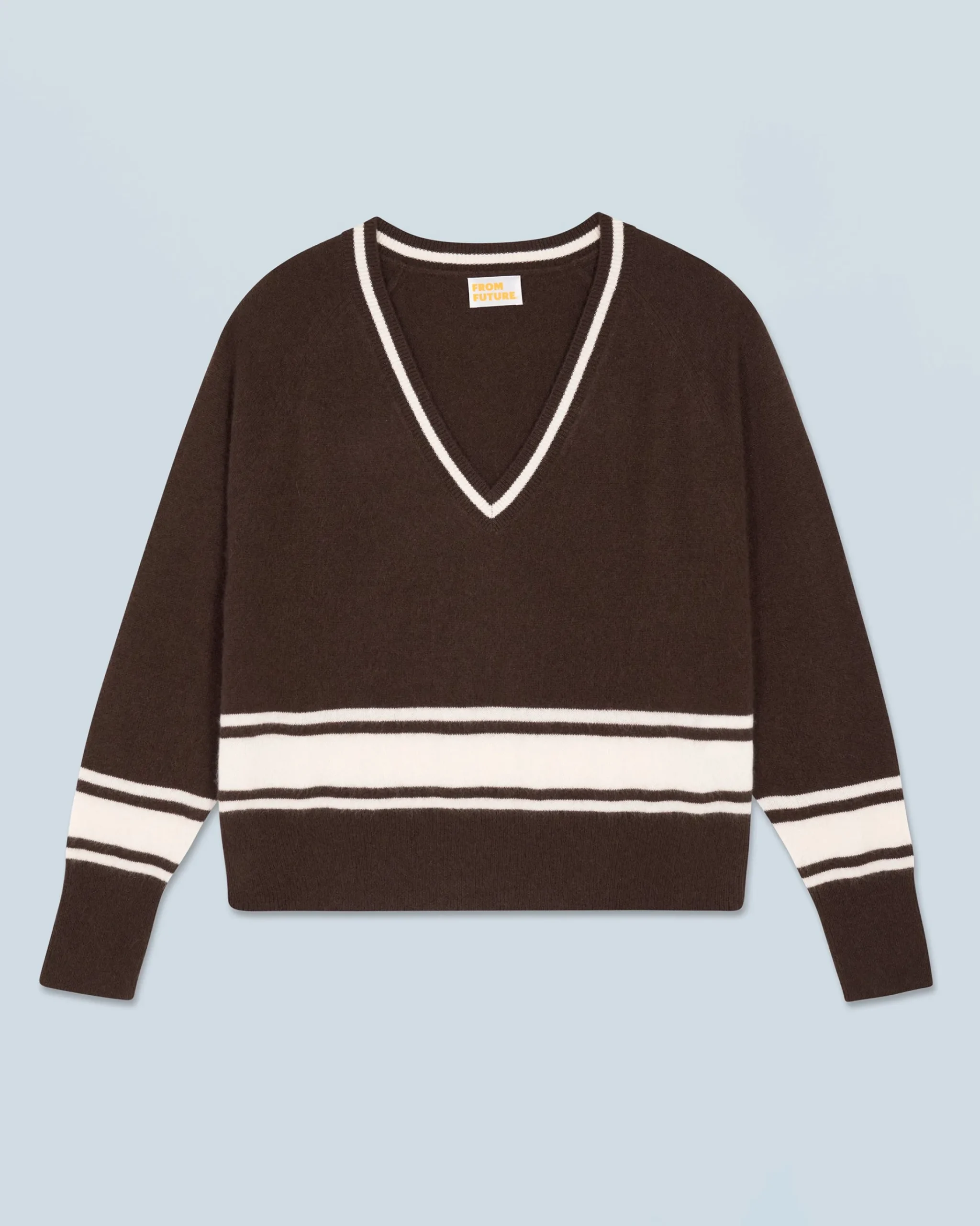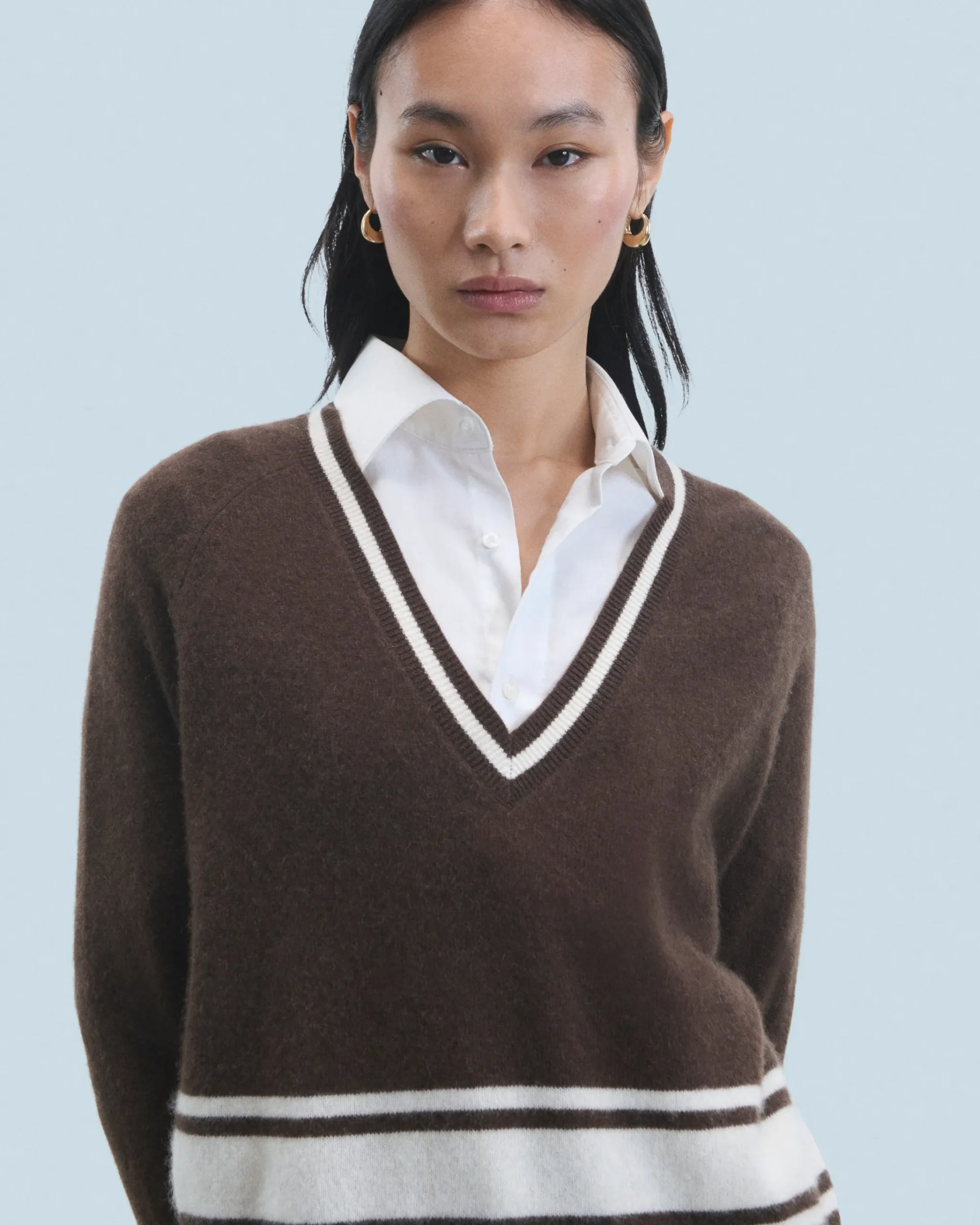 Confectionné en cachemire, ce pull oversize vient structurer l’allure avec une pointe d’audace. Des bandes contrastées soulignent le col V, les manches longues et le bas, insufflant un look élégant et affirmé.