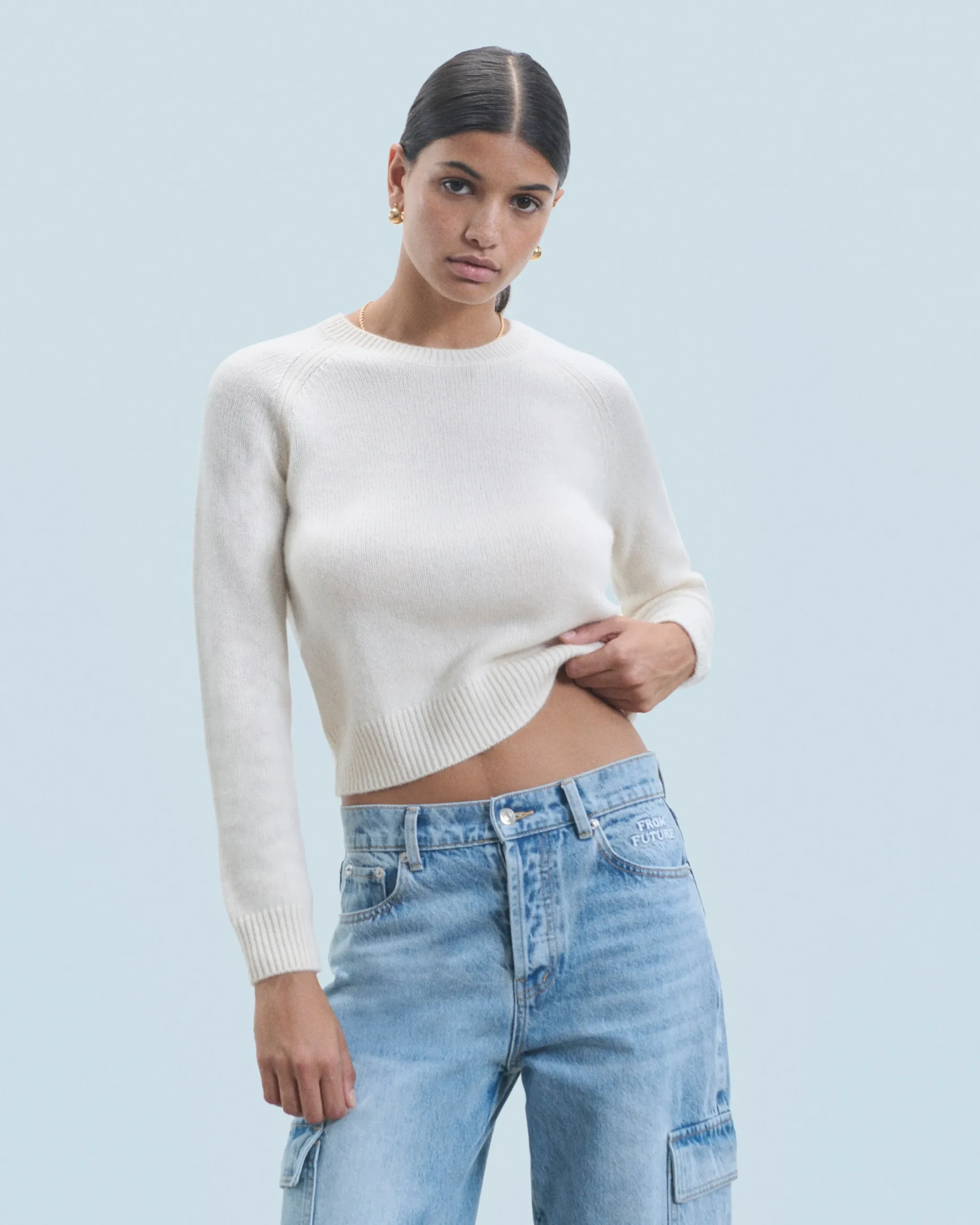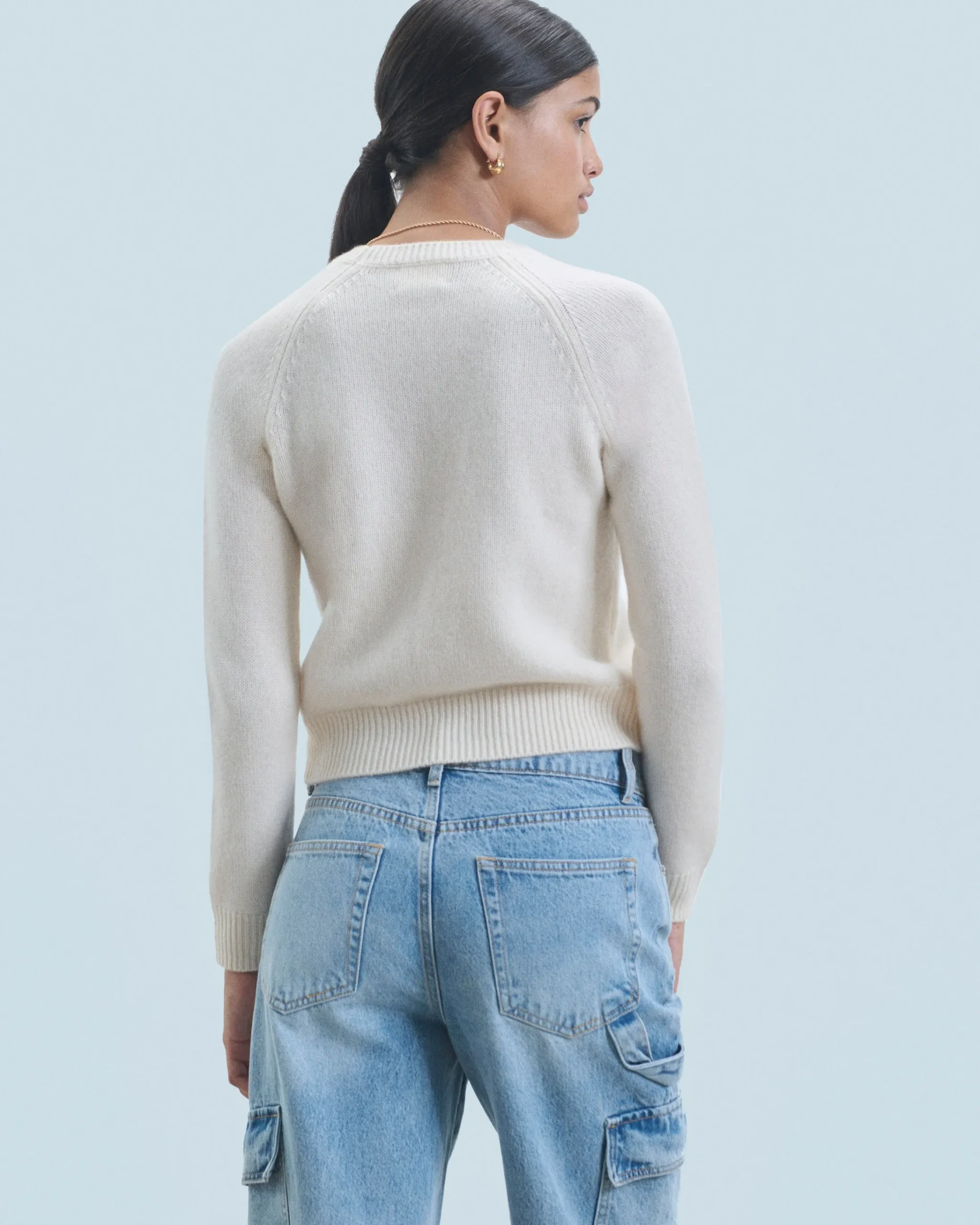 Proposto in una gamma di colori inediti, questo maglione in cashmere si presenta come un vero must del guardaroba. Il suo taglio corto e slim, vivacizzato da uno scollo tondo e maniche lunghe raglan, sottolinea con eleganza tutte le morfologie. Da indossare a volontà, puoi abbinarlo a un paio di jeans dritti o a una gonna morbida.