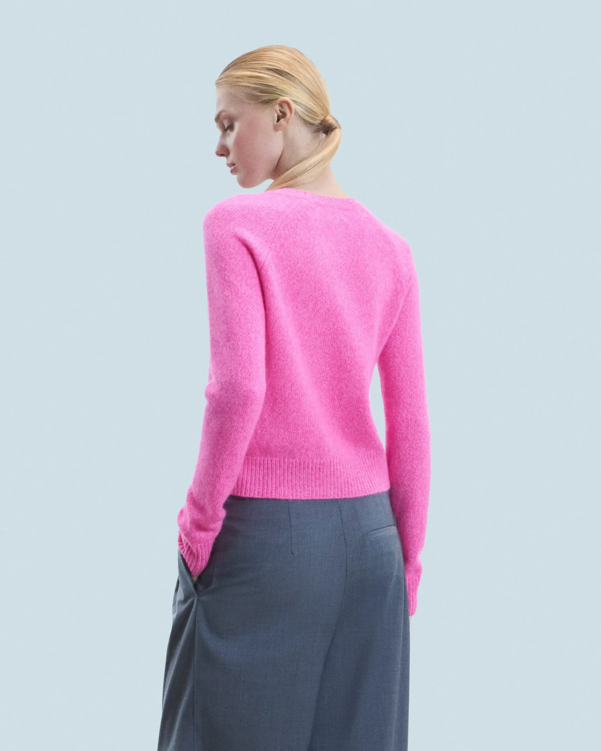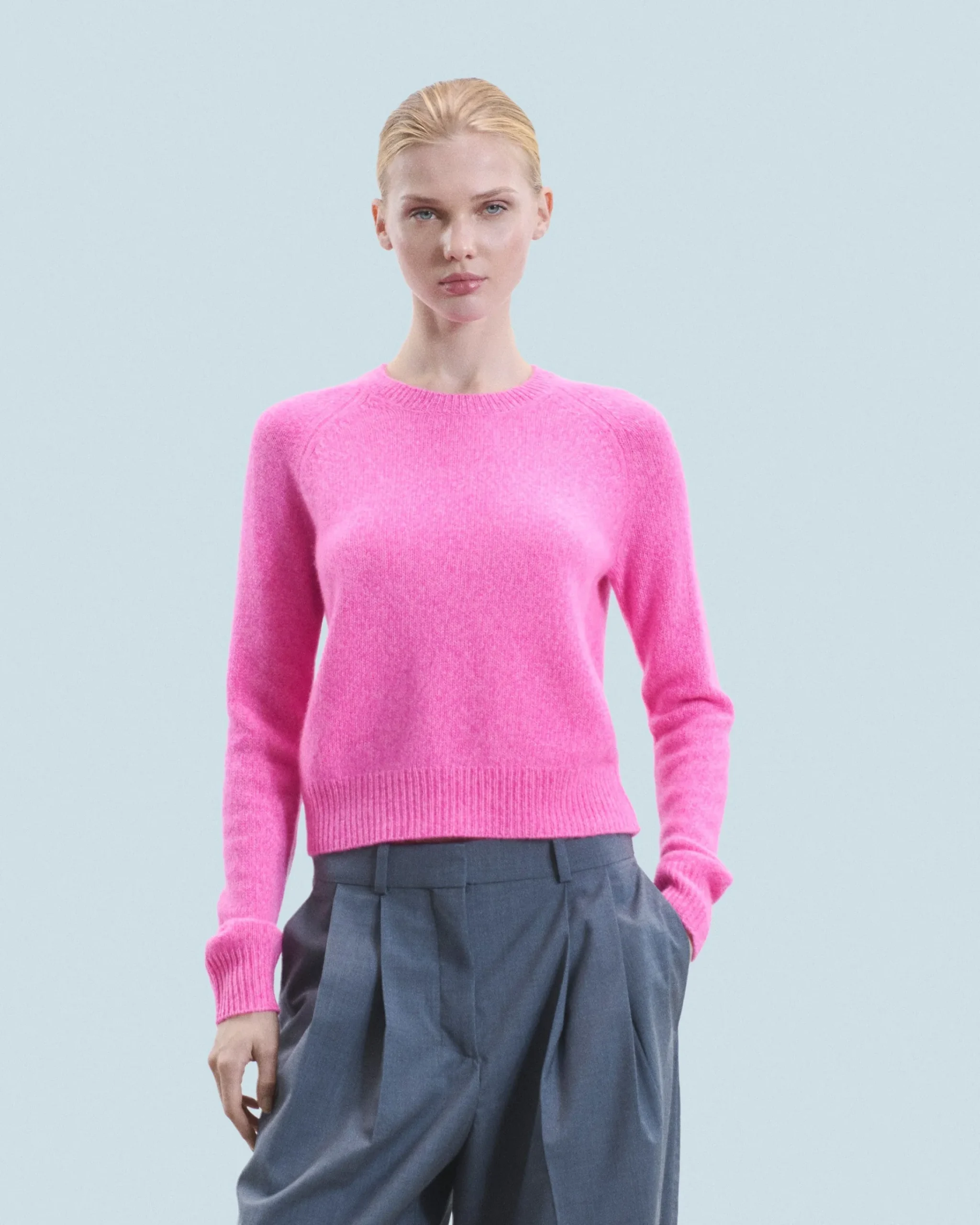 Proposto in una gamma di colori inediti, questo maglione in cashmere si presenta come un vero must del guardaroba. Il suo taglio corto e slim, vivacizzato da uno scollo tondo e maniche lunghe raglan, sottolinea con eleganza tutte le morfologie. Da indossare a volontà, puoi abbinarlo a un paio di jeans dritti o a una gonna morbida.