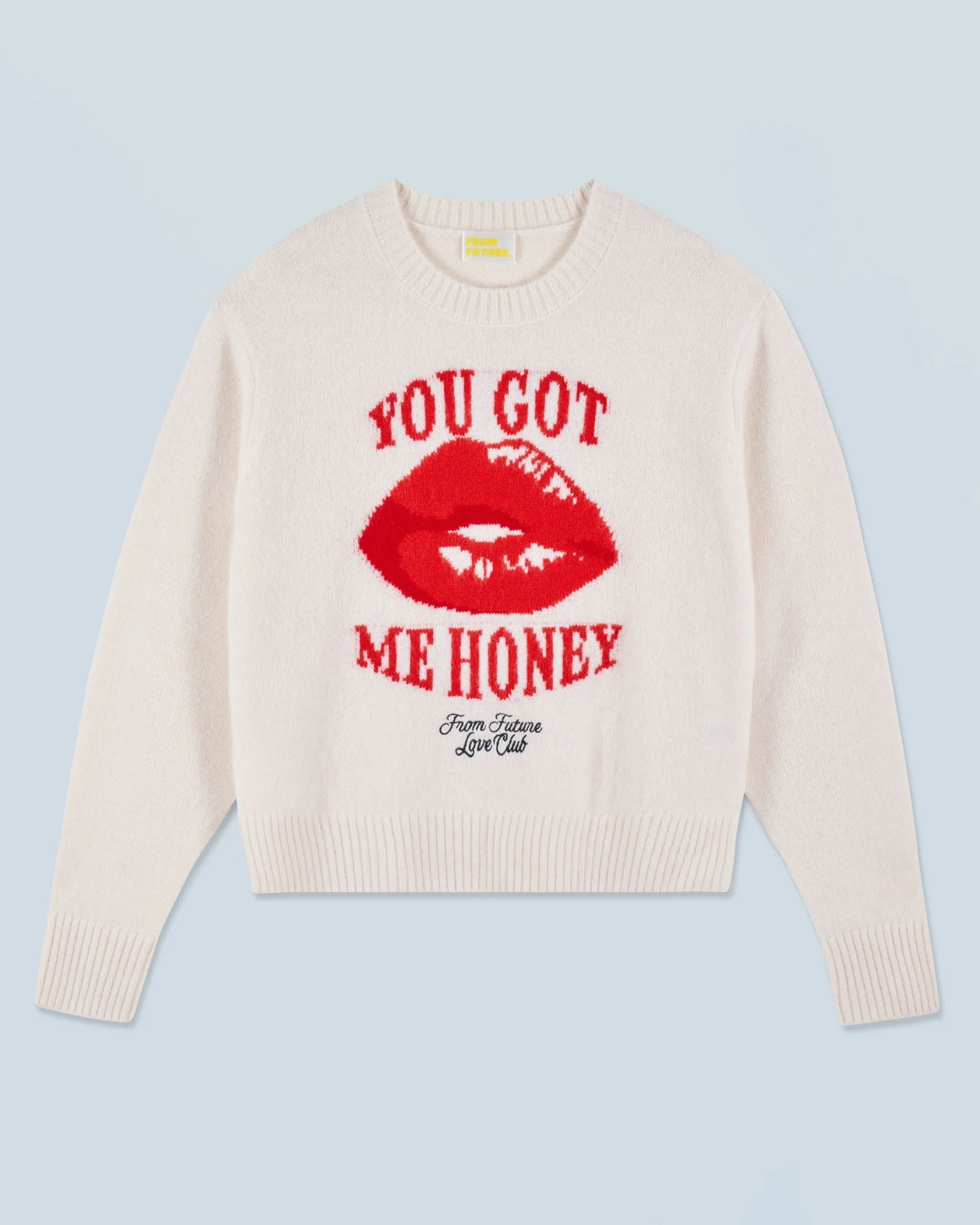 Lasciati conquistare da questo maglione audace, decorato con il motivo red lips “You Got Me Honey” irresistibile. Realizzato in cashmere, è dotato di un collo rotondo, maniche lunghe e bordi a coste. – Maglione in cashmere certificato GCS® Donna – Motivo red lips “You Got Me Honey” – Collo rotondo – Maniche lunghe – Bordi a coste – Vestibilità regular – Il Good Cashmere Standard® (GCS) è uno standard indipendente per un cashmere più sostenibile e responsabile. Mira a migliorare il benessere delle capre da cashmere, le condizioni di lavoro degli allevatori e a proteggere l’ambiente.- Cashmere 4 fili