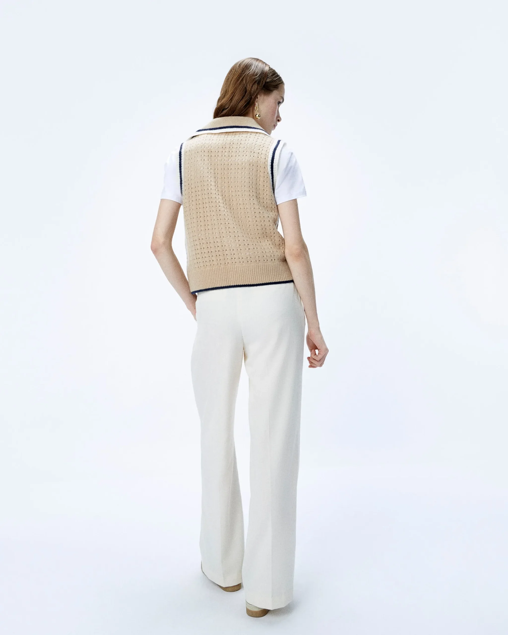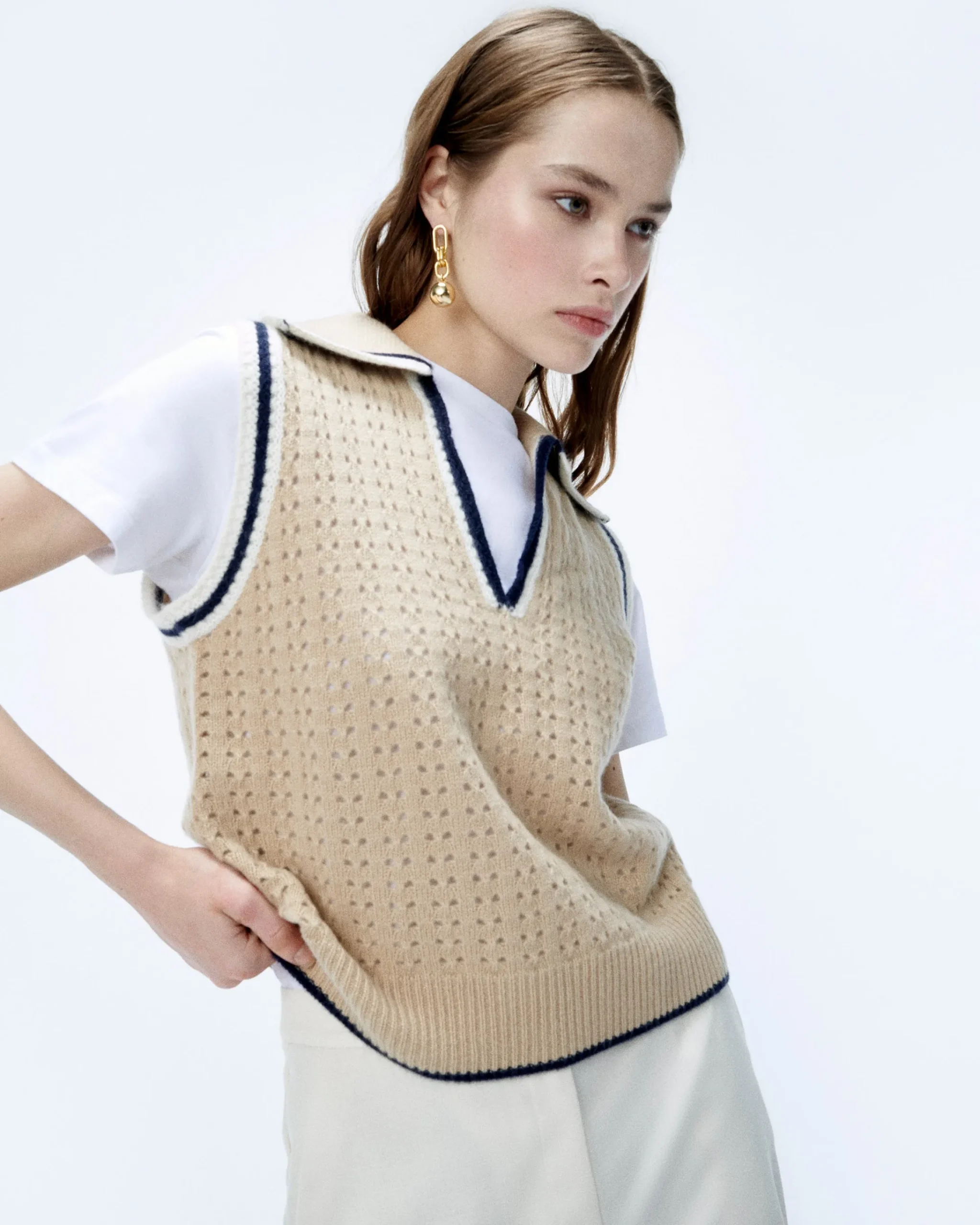 Riscalda i tuoi look di stagione con questo pullover corto senza maniche in cashmere 2 fili, impreziosito da dettagli lavorati all’uncinetto. Puoi infilarlo su una camicia bianca, oppure sovrapporlo a un top per creare un piacevole contrasto.