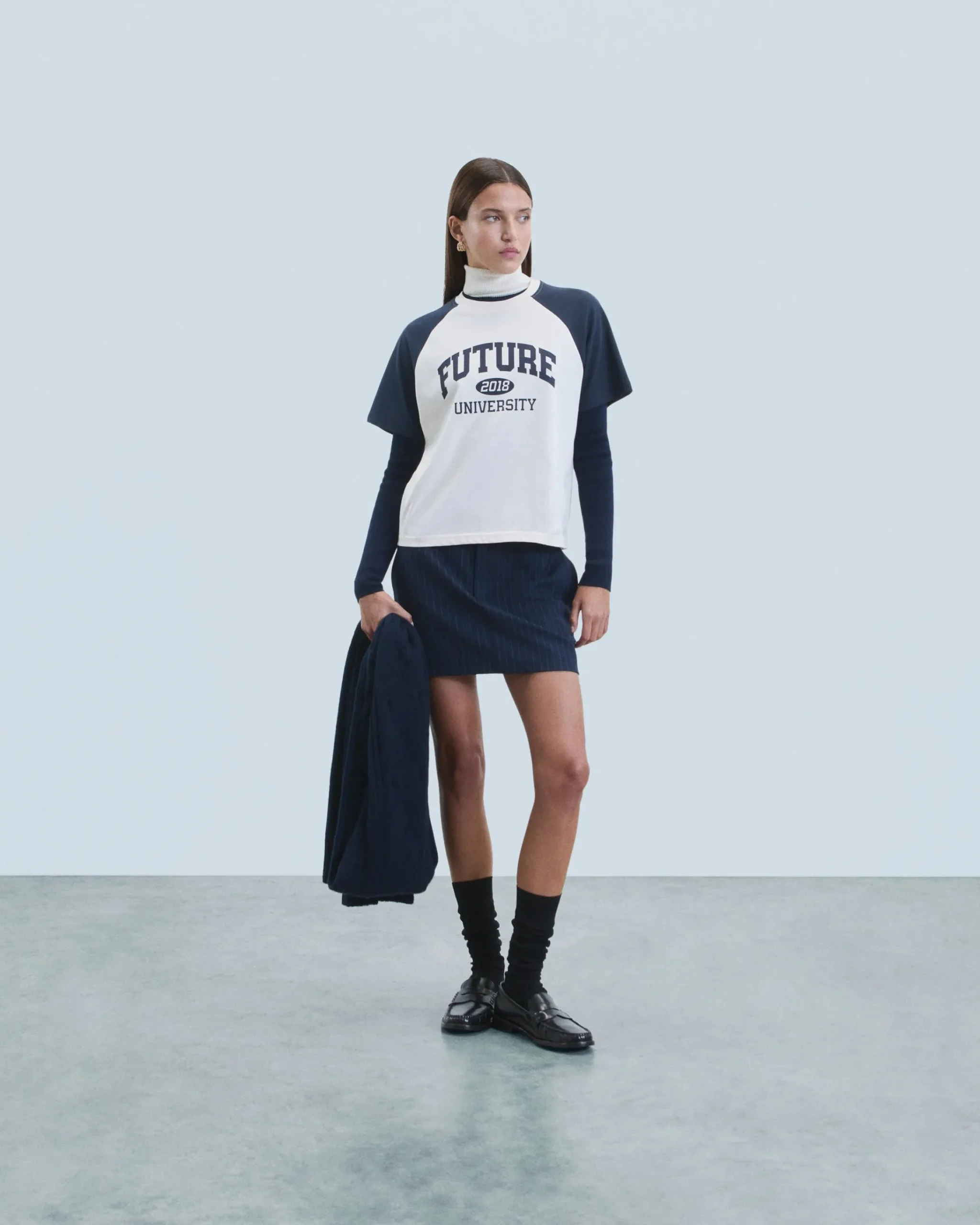 Casual ma comunque elegante, questa t-shirt in cotone presenta la nostra firma “Future University”. Il girocollo e le maniche corte a contrasto reinventano lo stile college con un tocco di audacia.