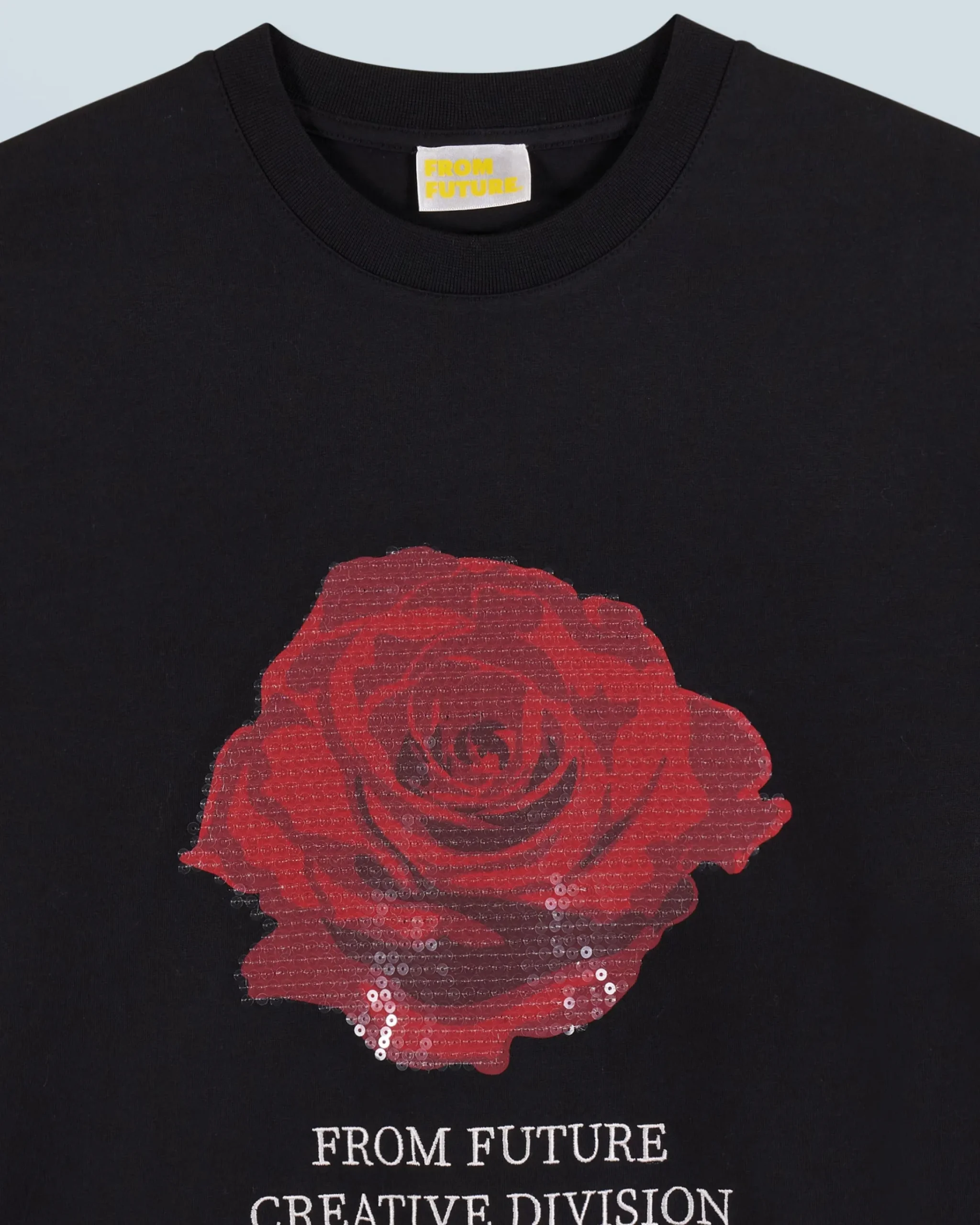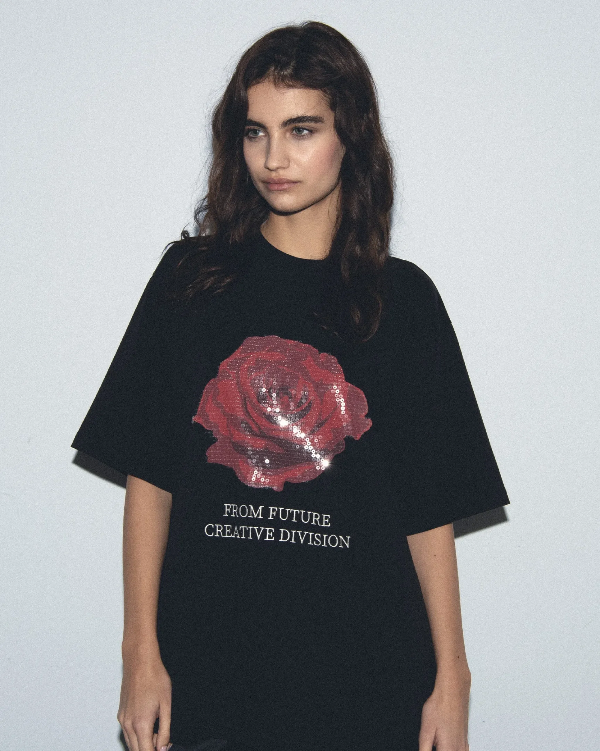 Una vera dichiarazione d’intenti, questa t-shirt in cotone oversize rivela una rosa brillante e scintillante firmata “From Future Creative Division”. Il girocollo a costine e le maniche corte lo rendono un capo versatile, da indossare tutti i giorni con una gonna fluida per un look sofisticato o pantaloni ampi per un look casual.
