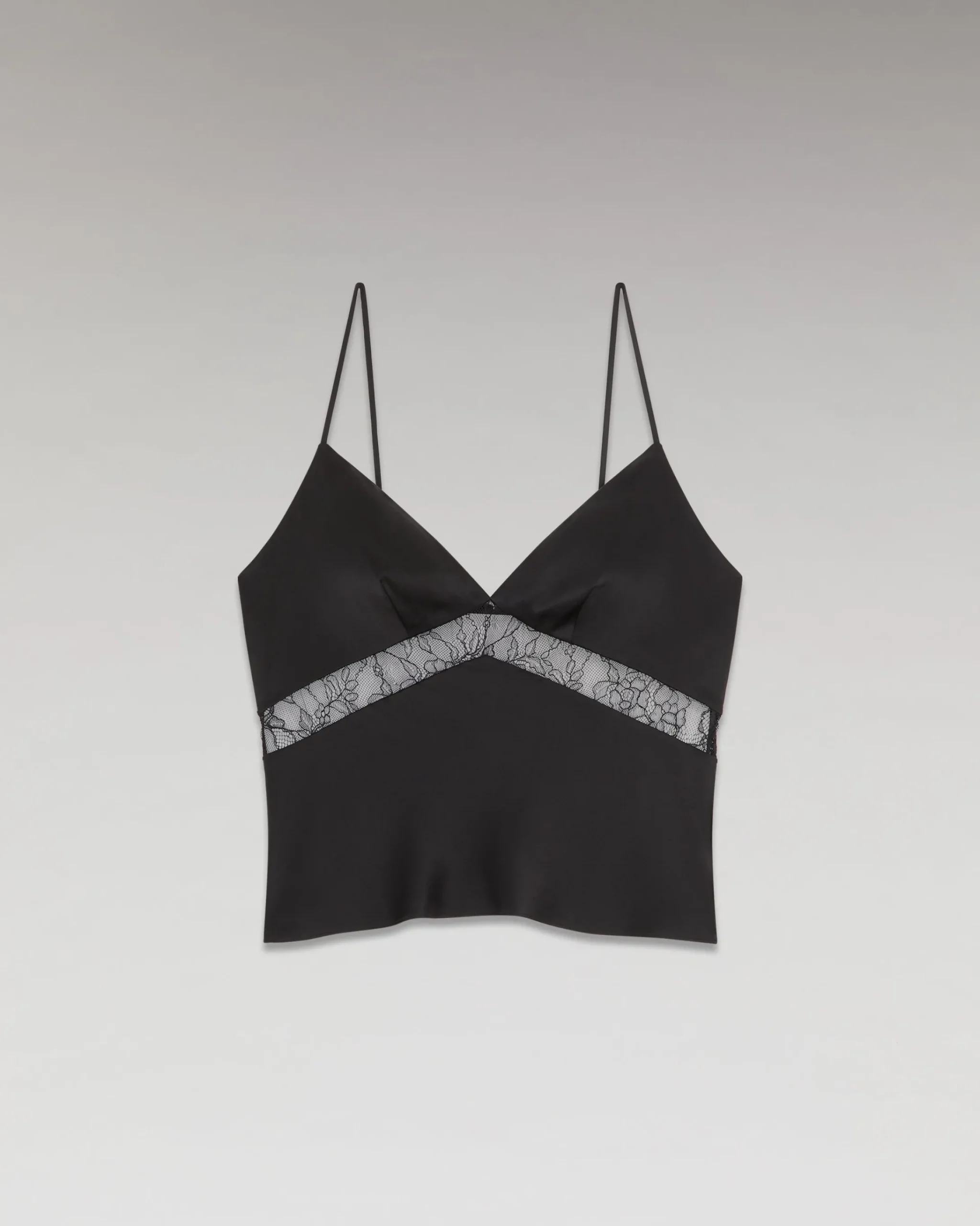 Incarnando tutta l’eleganza cosmica, questo top confezionato in raso di seta leggero e lucente propone un taglio slim. Con uno scollo a V e spalline sottili, è impreziosito da bande in pizzo. Sfoggia un total look chic abbinandolo a una gonna lunga morbida e un paio di décolleté!