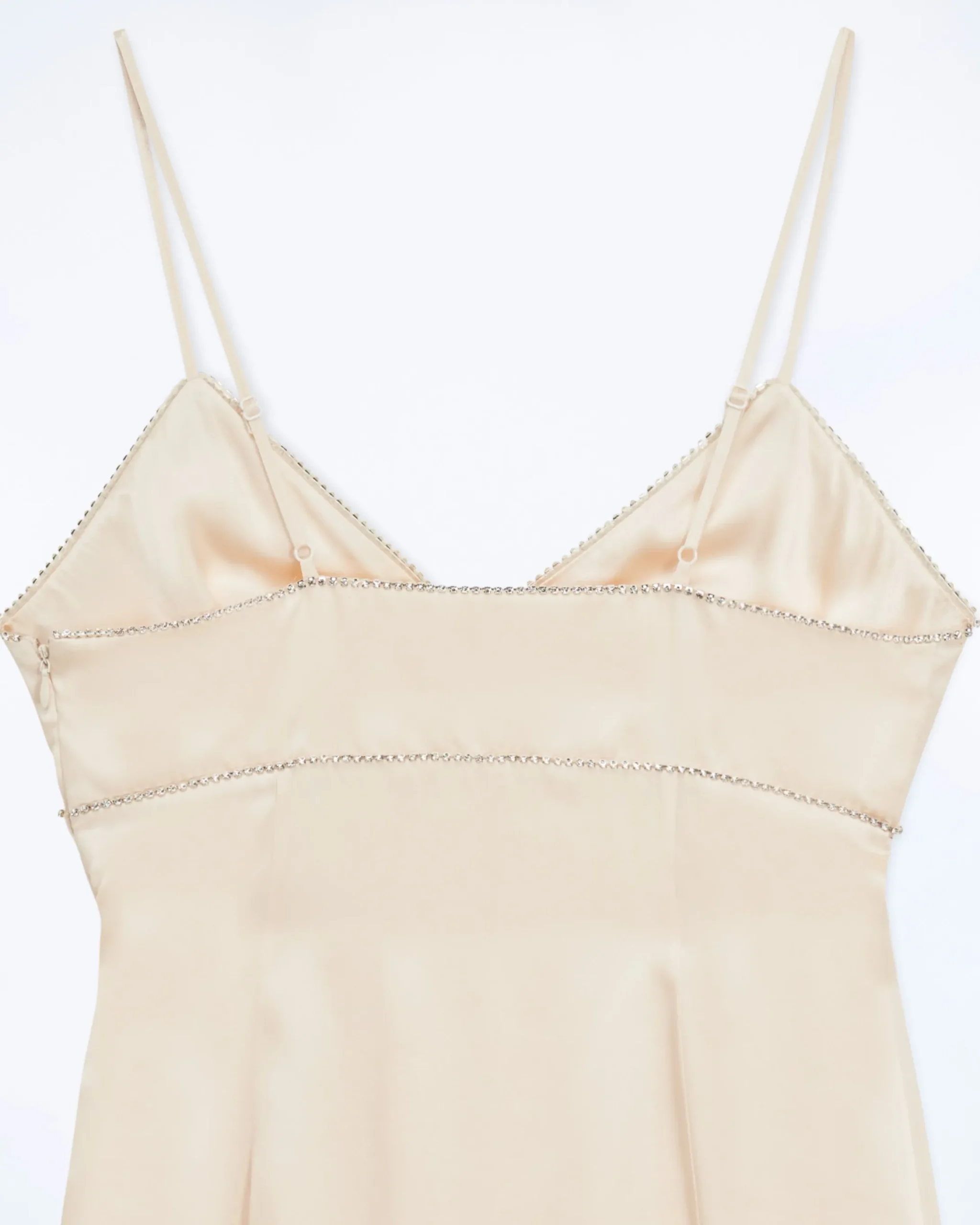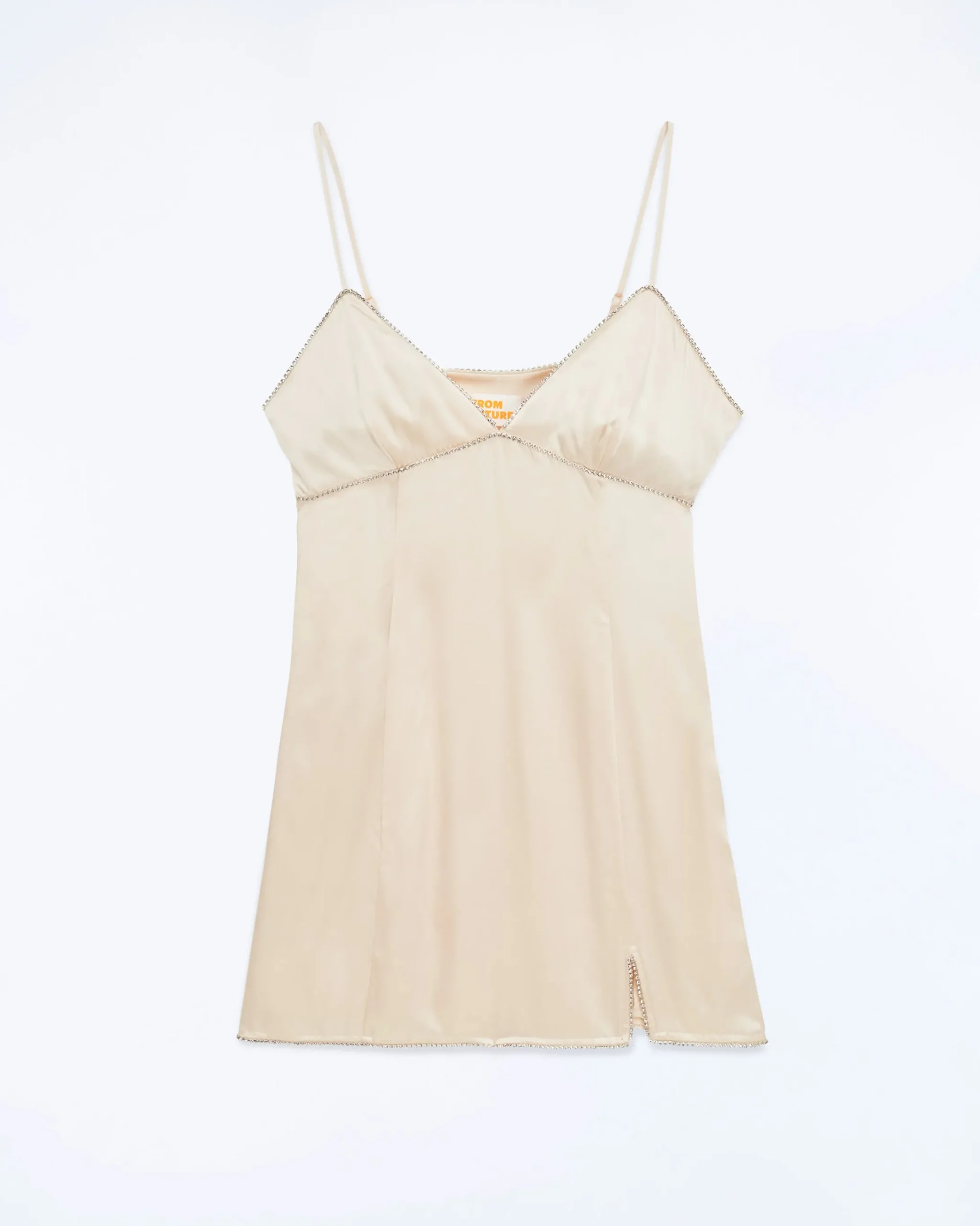 Confezionato in raso di seta lucido e leggero, questo vestito corto incarna tutta l’eleganza cosmica con le sue linee futuriste e un taglio morbido. Con spalline sottili, presenta uno scollo a V e una gonna con un piccolo spacco davanti. Da indossare a volontà, è perfetto sia di giorno che di sera, da solo o infilato sotto un top in maglia.