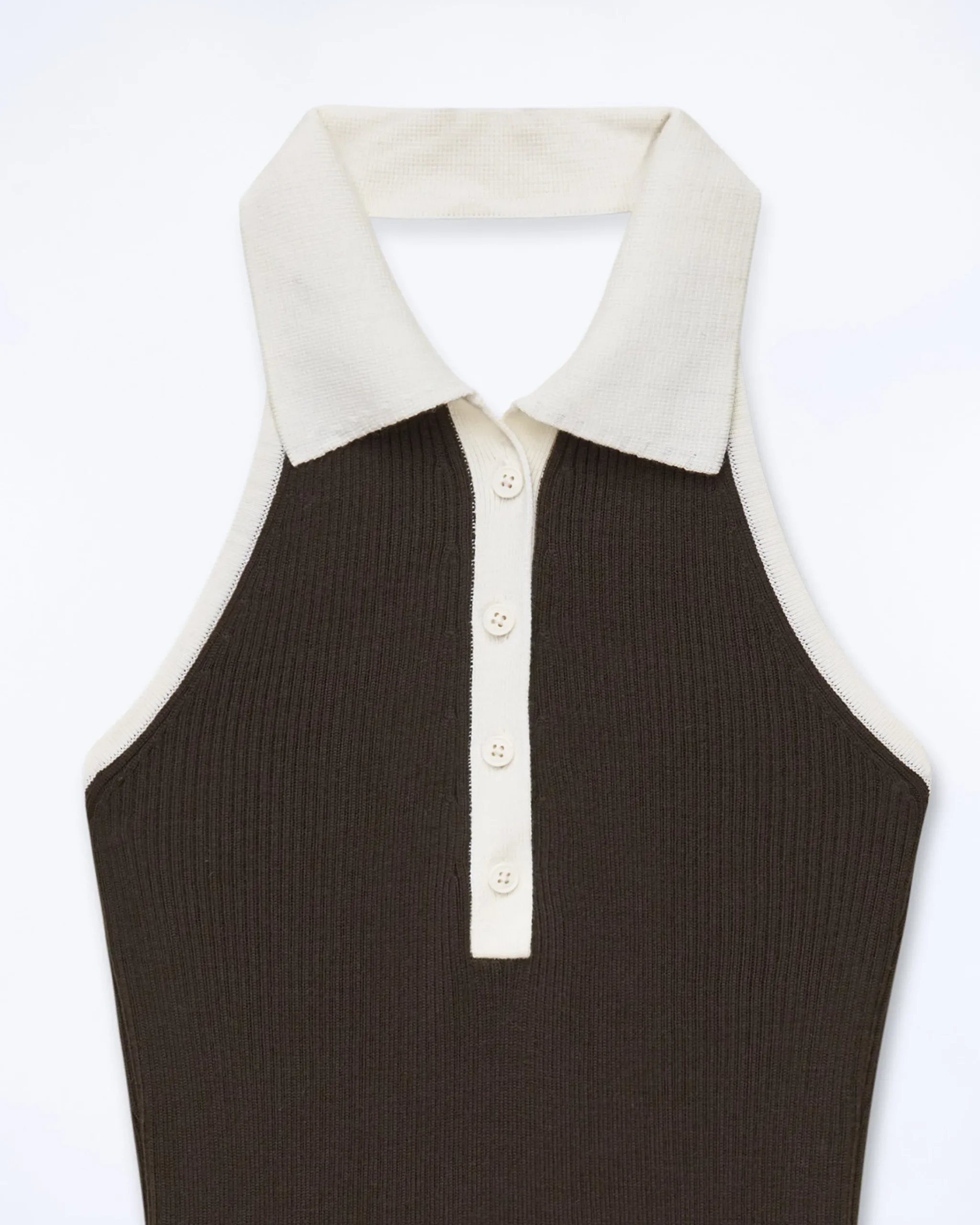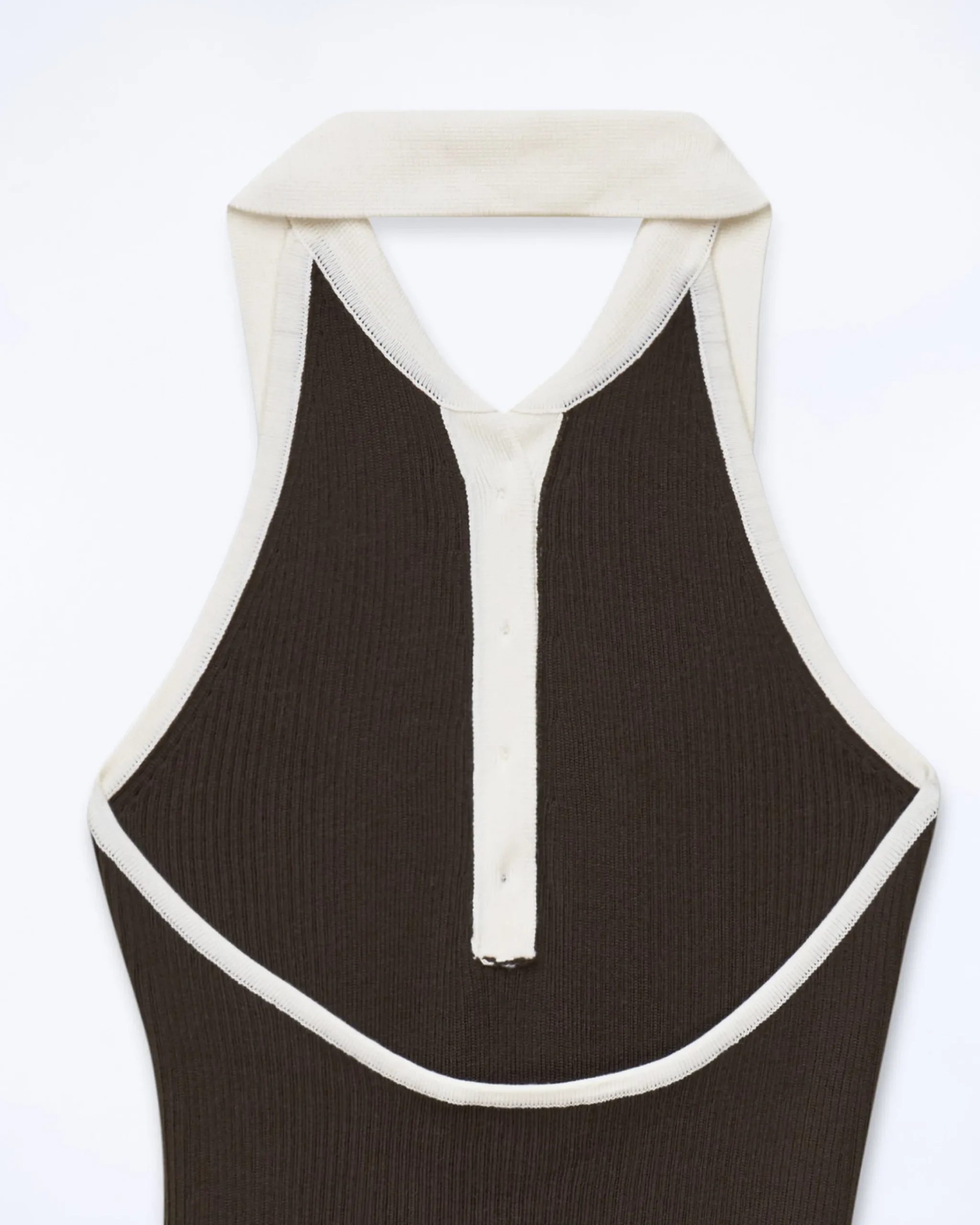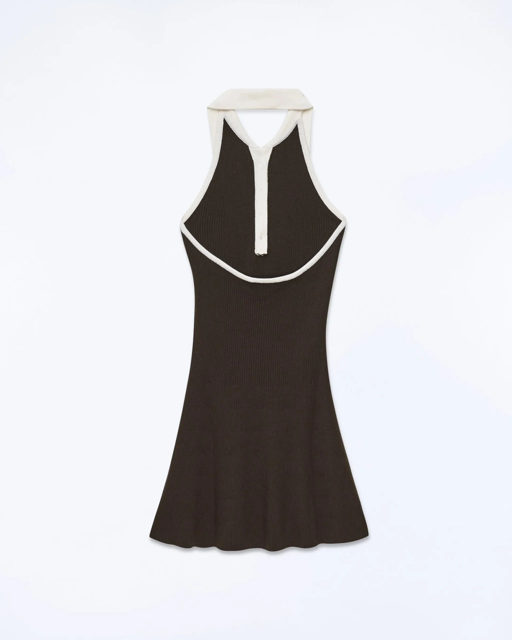 Uno stile sporty-chic per questo vestito corto a coste confezionato in lana merino! Con un collo a polo, un taglio a spalla scesa e bordi a contrasto, ti conquisterà con la sua schiena scoperta e il fondo svasato, per un look futurista audace.