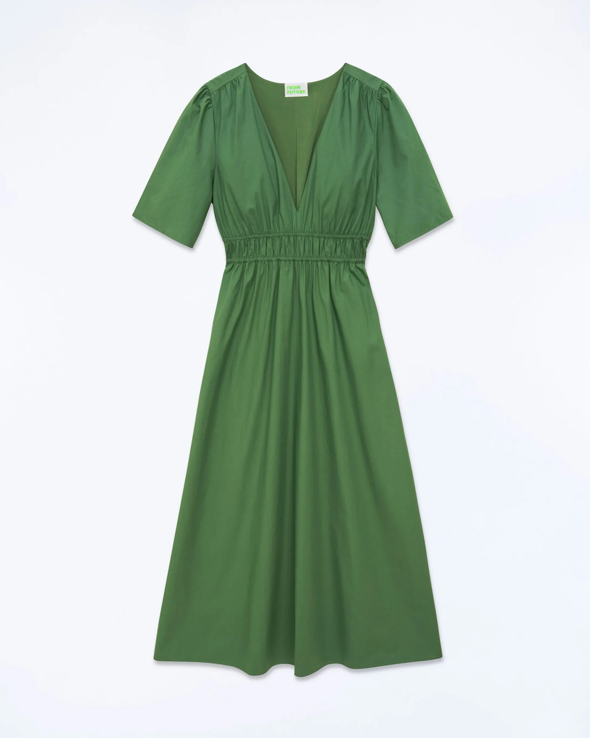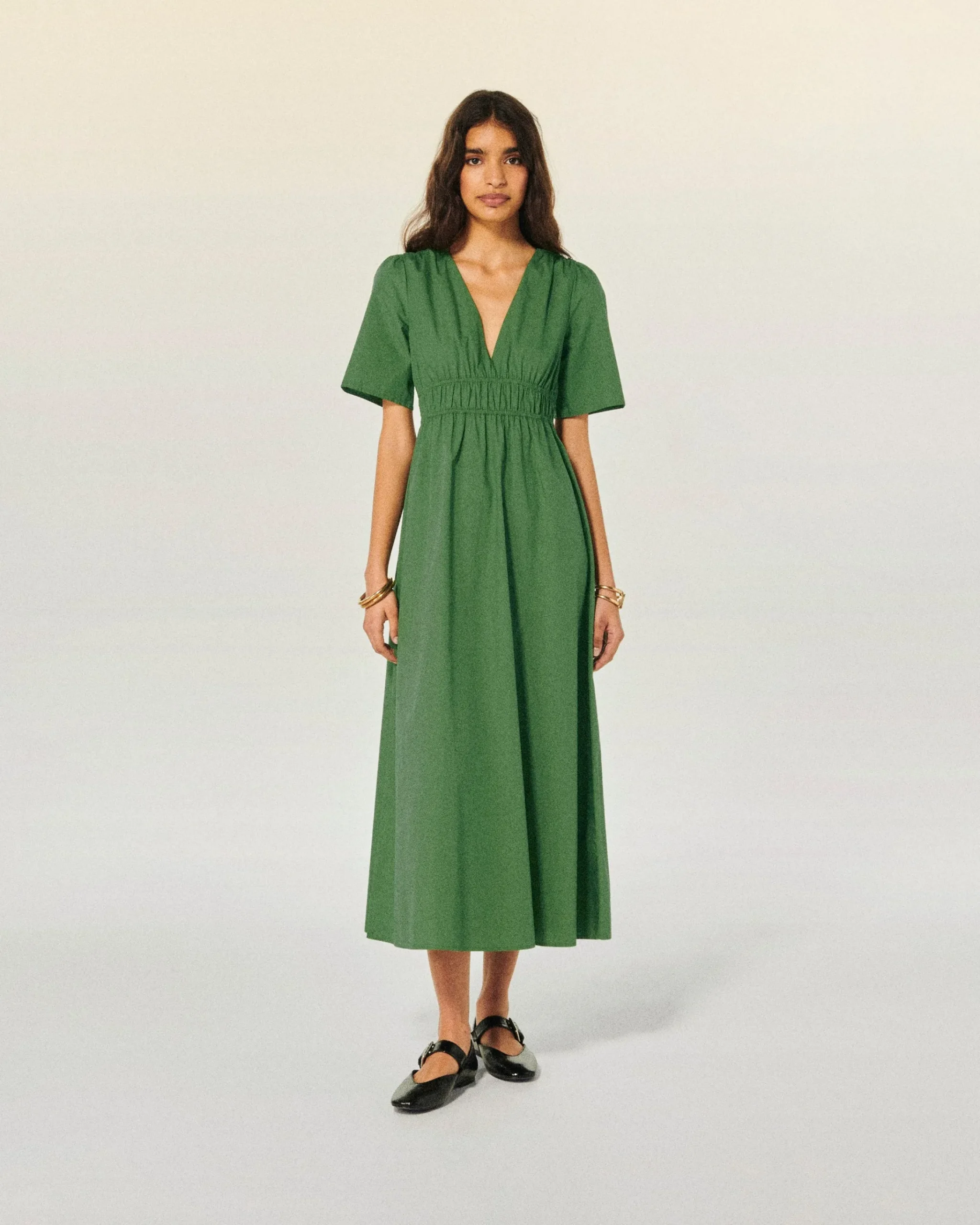 Un taglio slim e arioso per il vestito lungo Gianna in cotone! Con maniche corte e uno scollo profondo, presenta un gioco di increspature sulle spalle e in vita, e una gonna svasata. Completa il tuo look chic con un paio di décolleté o di sandali!