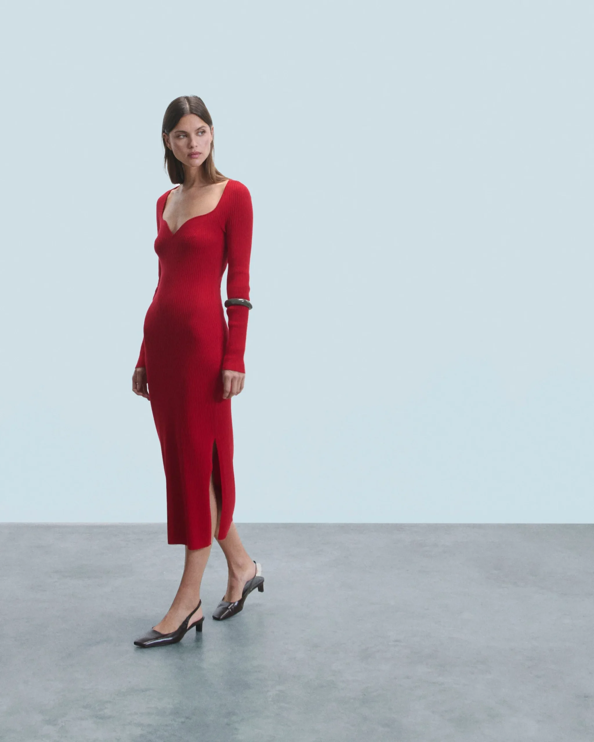 Una maglia a coste è la protagonista di questo vestito lungo e aderente, realizzato in lana merino certificata RWS (Responsible Wool Standard). Con maniche lunghe, presenta uno scollo a cuore e una gonna con spacco sottolineati da bordini a contrasto. Indossalo come una seconda pelle, con un paio di décolleté per un outfit sofisticato o con delle sneakers per un look più casual.