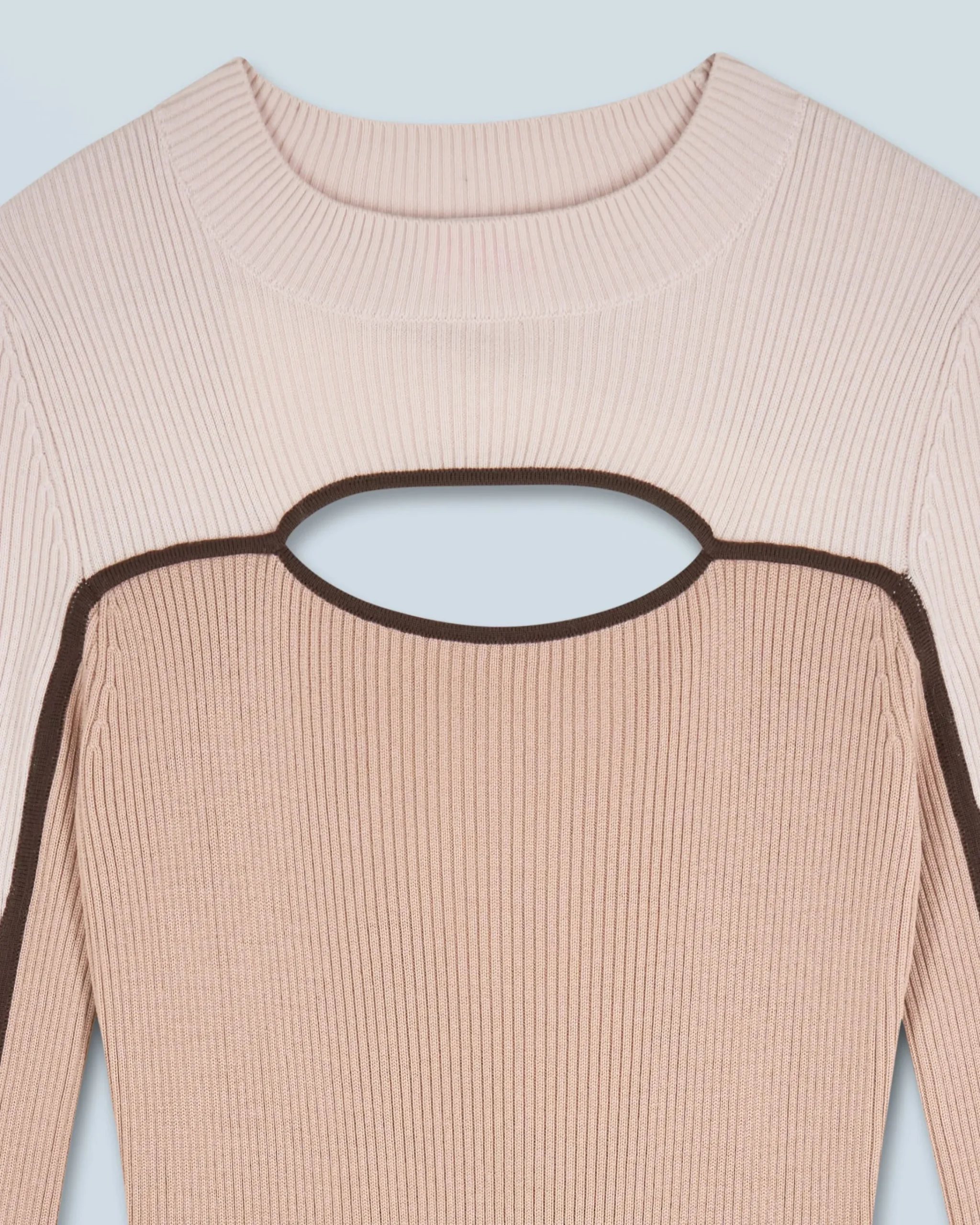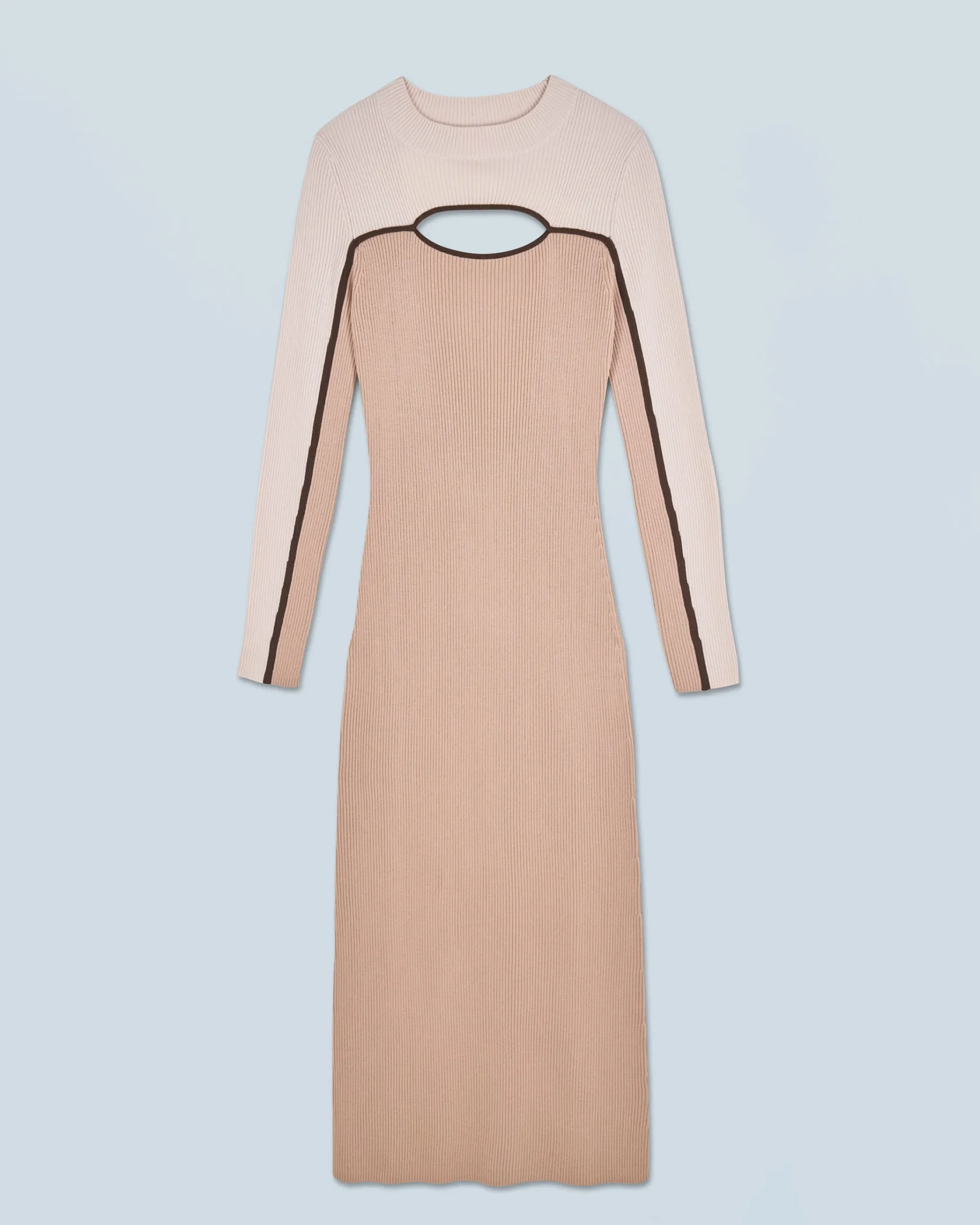 Realizzato in lana merino certificata RWS (Responsible Wool Standard), questo vestito lungo e aderente sfoggia dettagli audaci. Con un collo alto, presenta un cut-out sul petto e maniche lunghe vivacizzate da bordini a contrasto. Elegante e strutturato, si abbina facilmente a un paio di décolleté.
