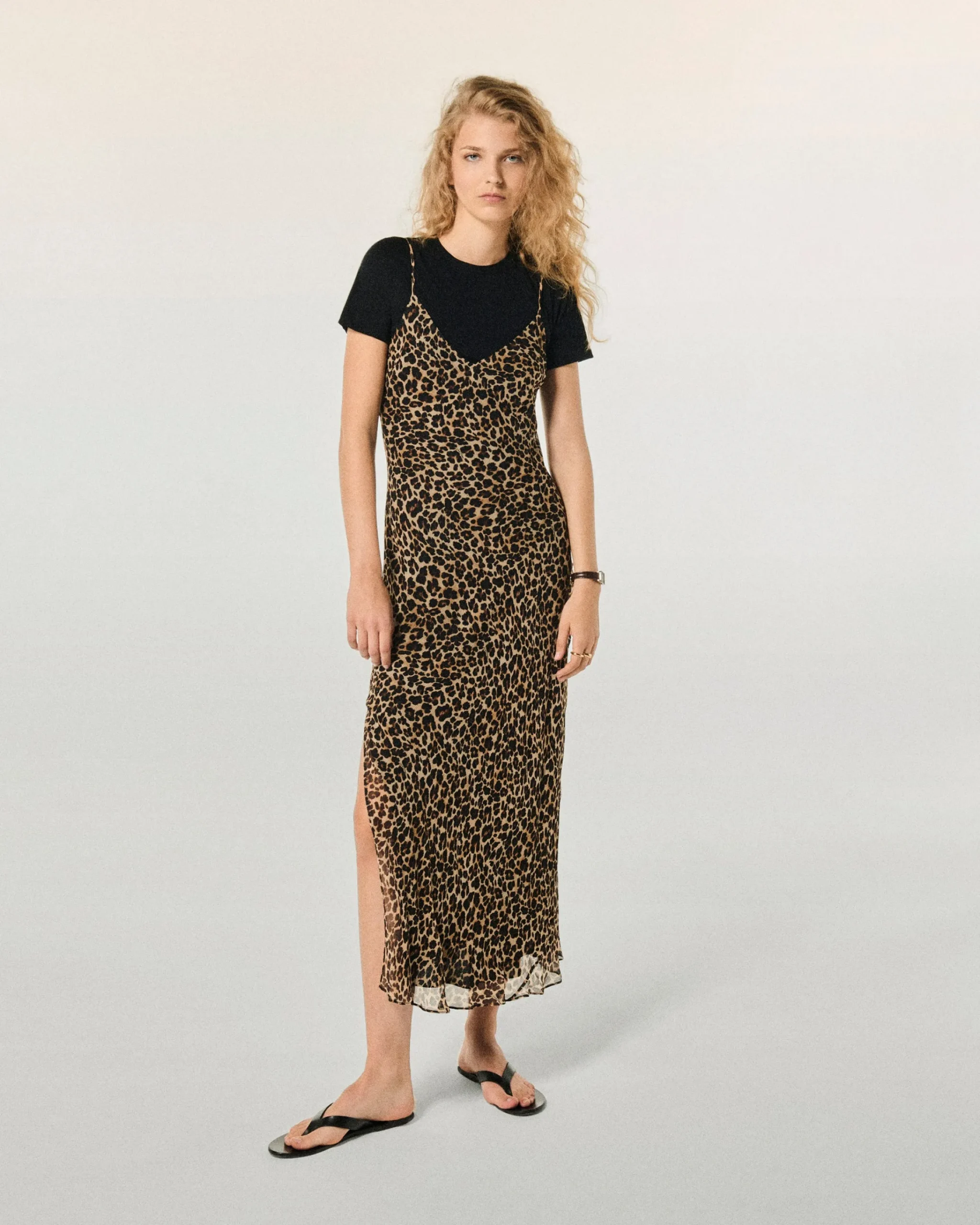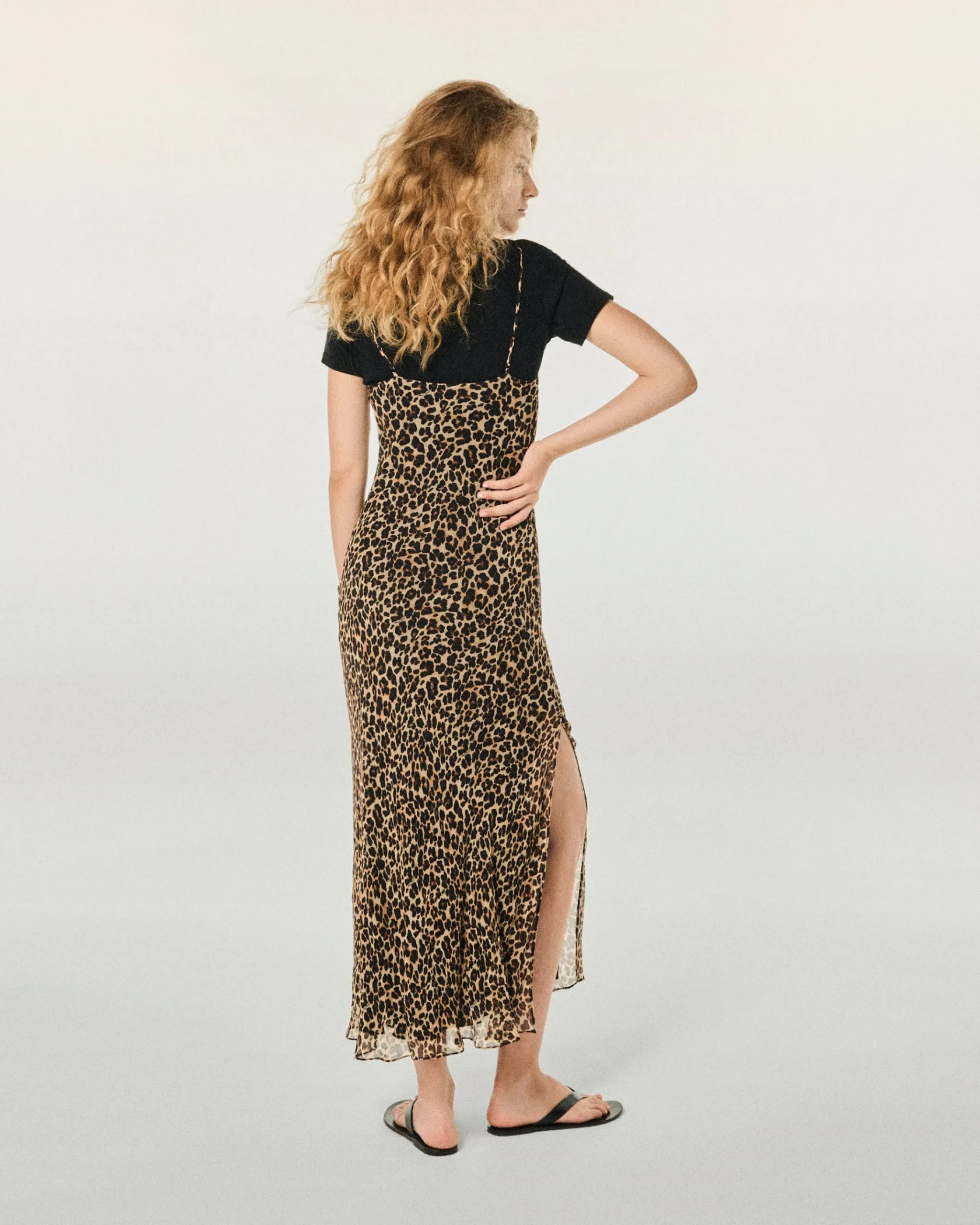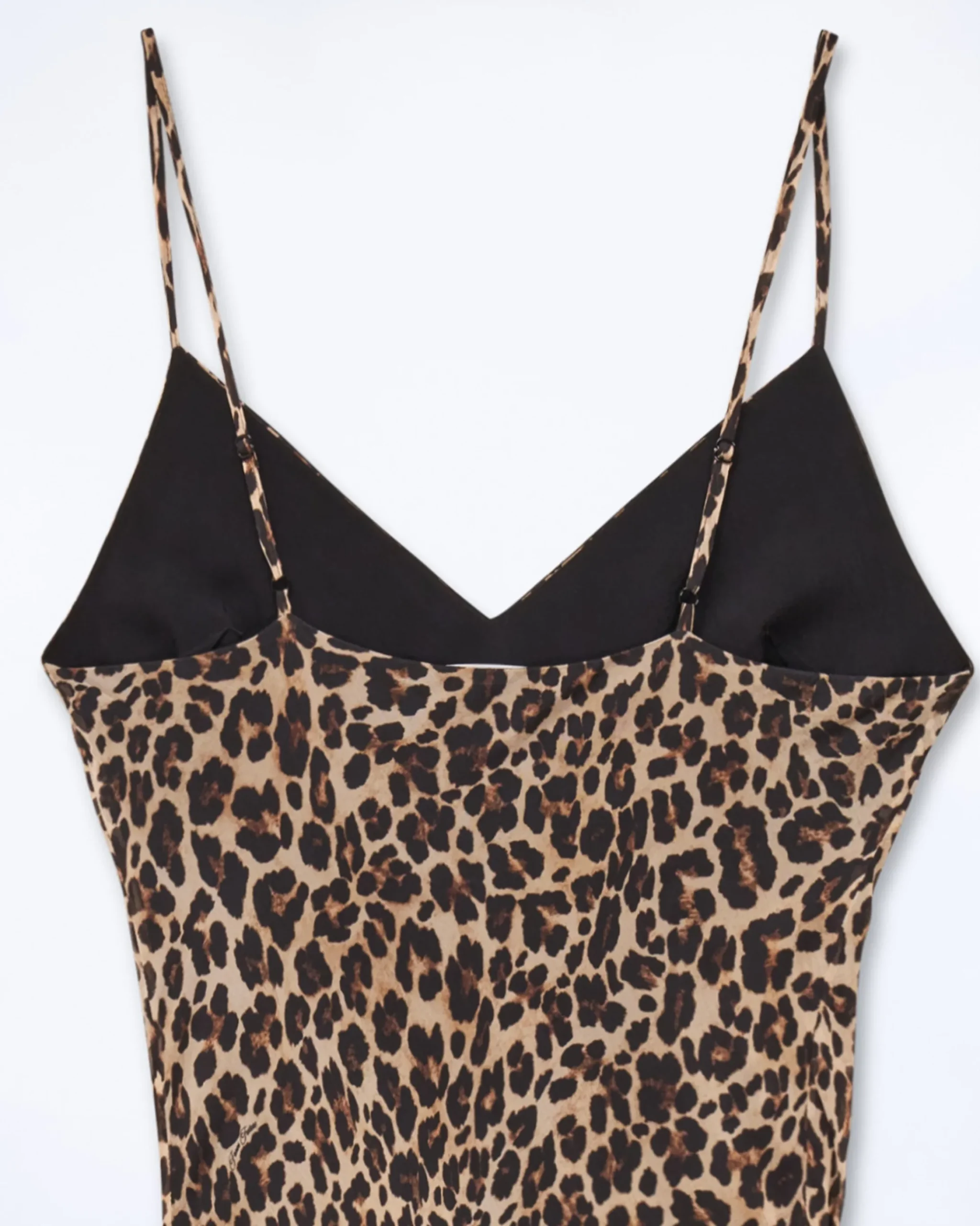 Lasciati condurre verso un futuro cosmico con questo vestito lungo impreziosito da una stampa leopardata! Con spalline sottili, uno scollo a V e una gonna con spacco laterale, offre una vestibilità slim. Chic e audace, puoi indossarlo sia da solo che con un cardigan in maglia.