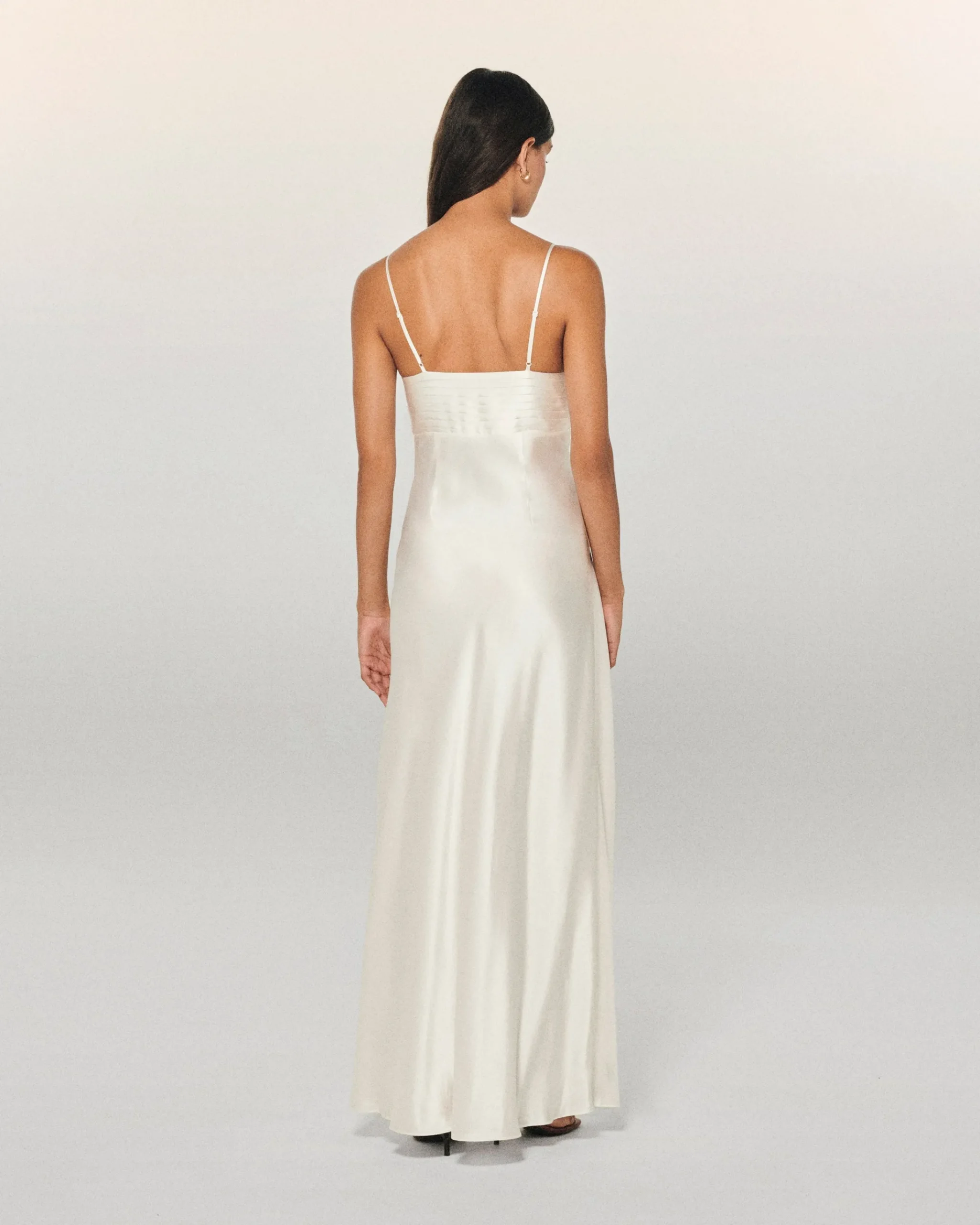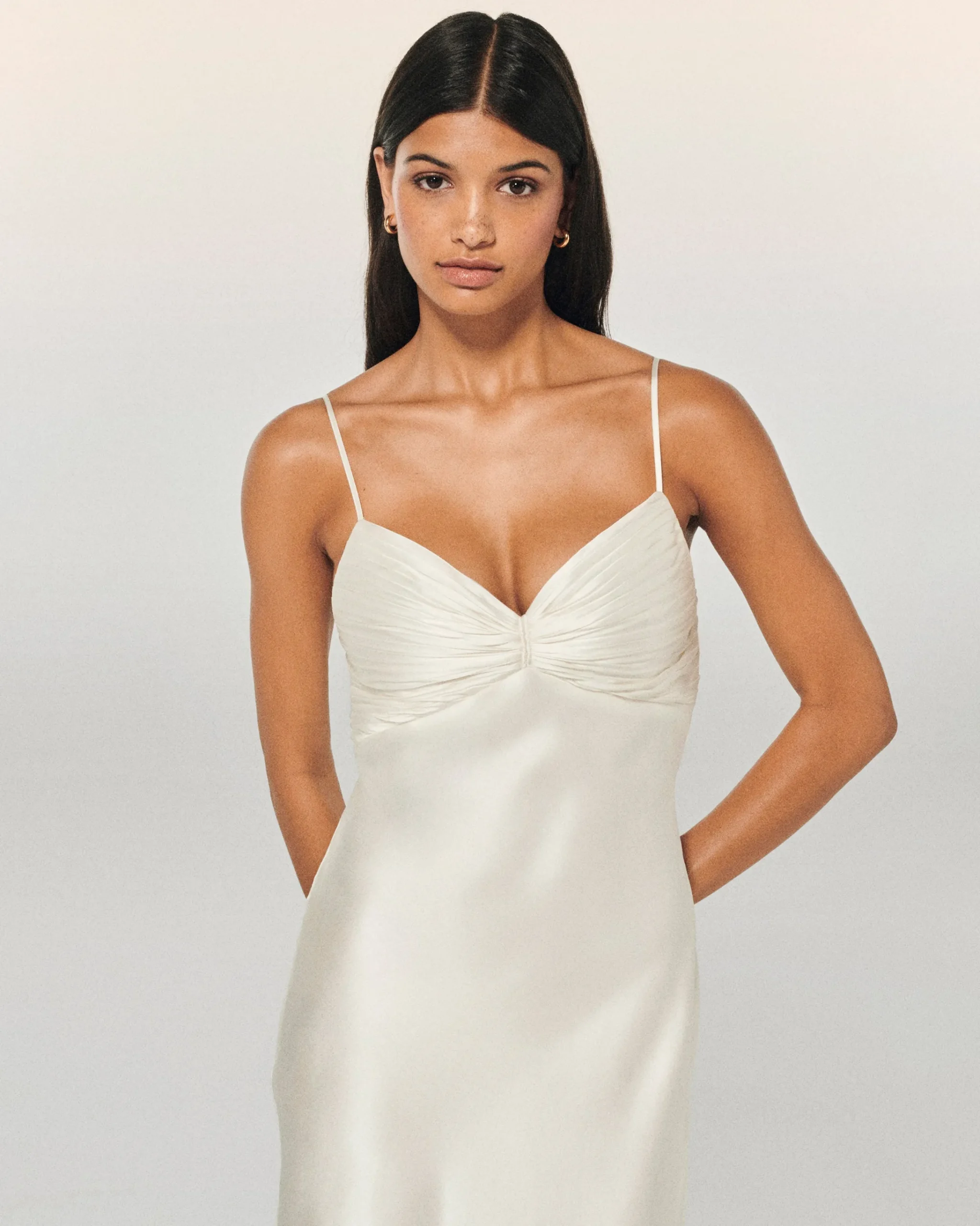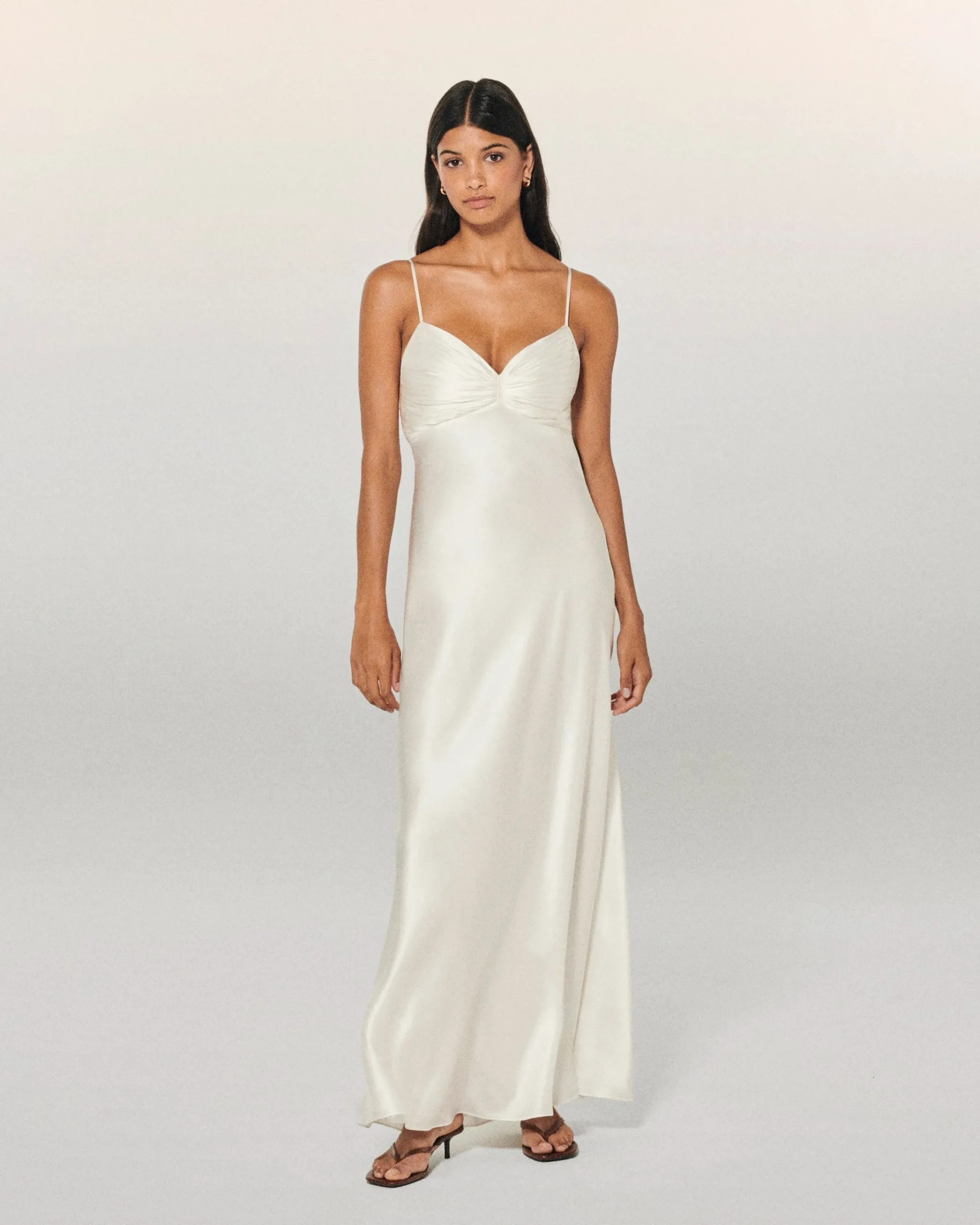 All’insegna della leggerezza, il vestito lungo slim Rosa in raso di seta valorizzerà il tuo look futurista. Con spalline sottili regolabili, presenta uno scollo ornato di arricciature e una gonna con spacco. Ideale sia di giorno che di sera, puoi indossarlo sia da solo che infilato sotto un top in maglia soffice.