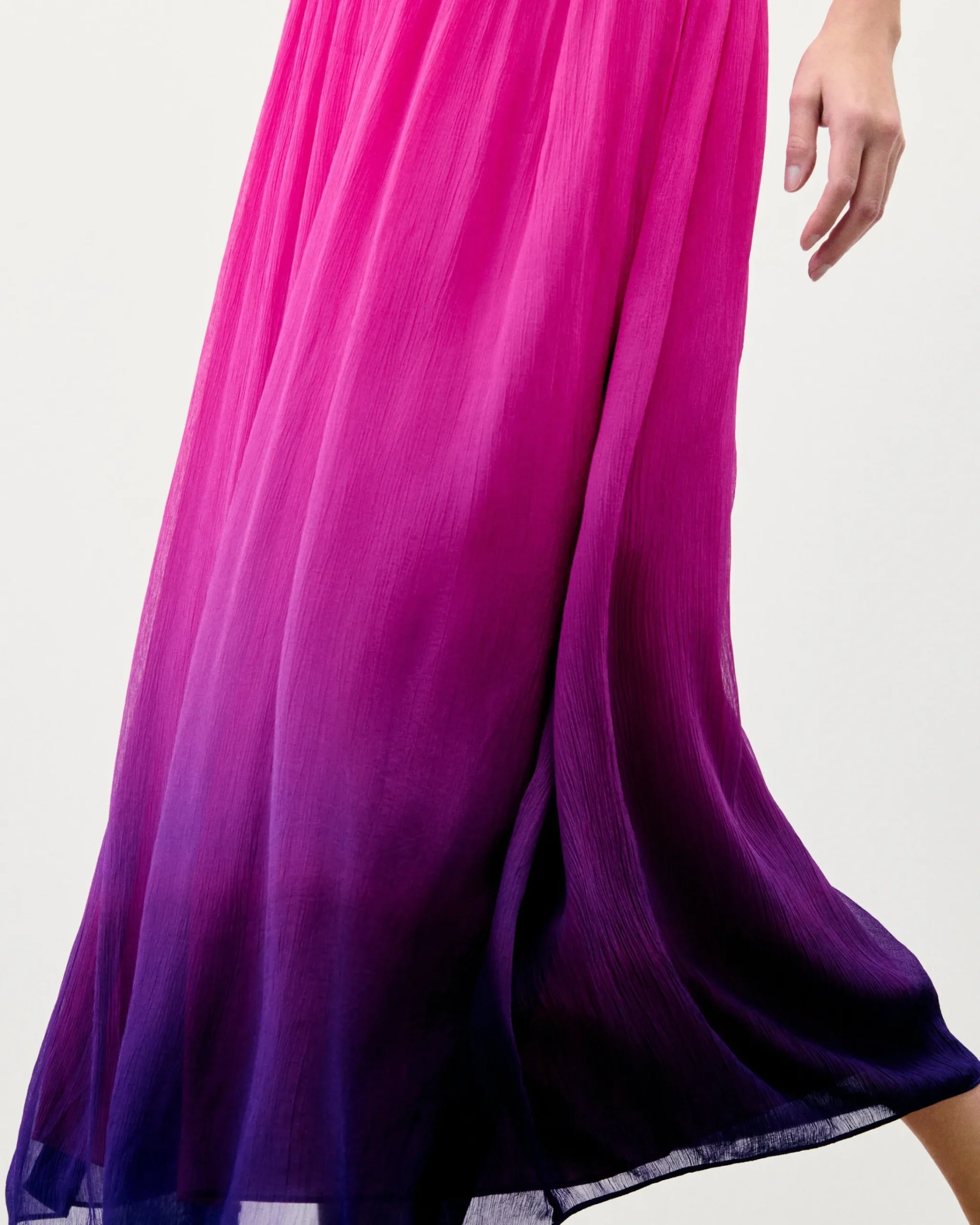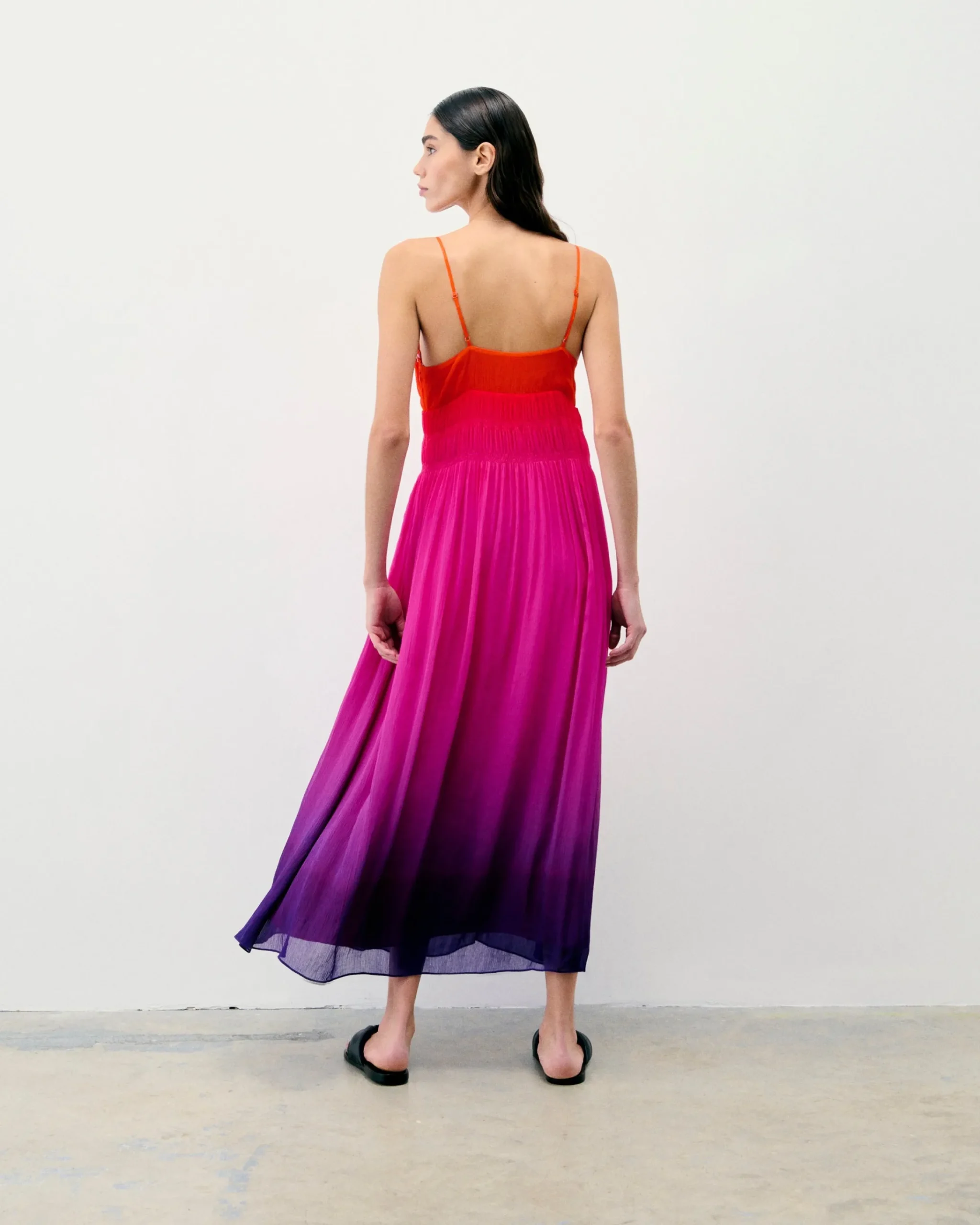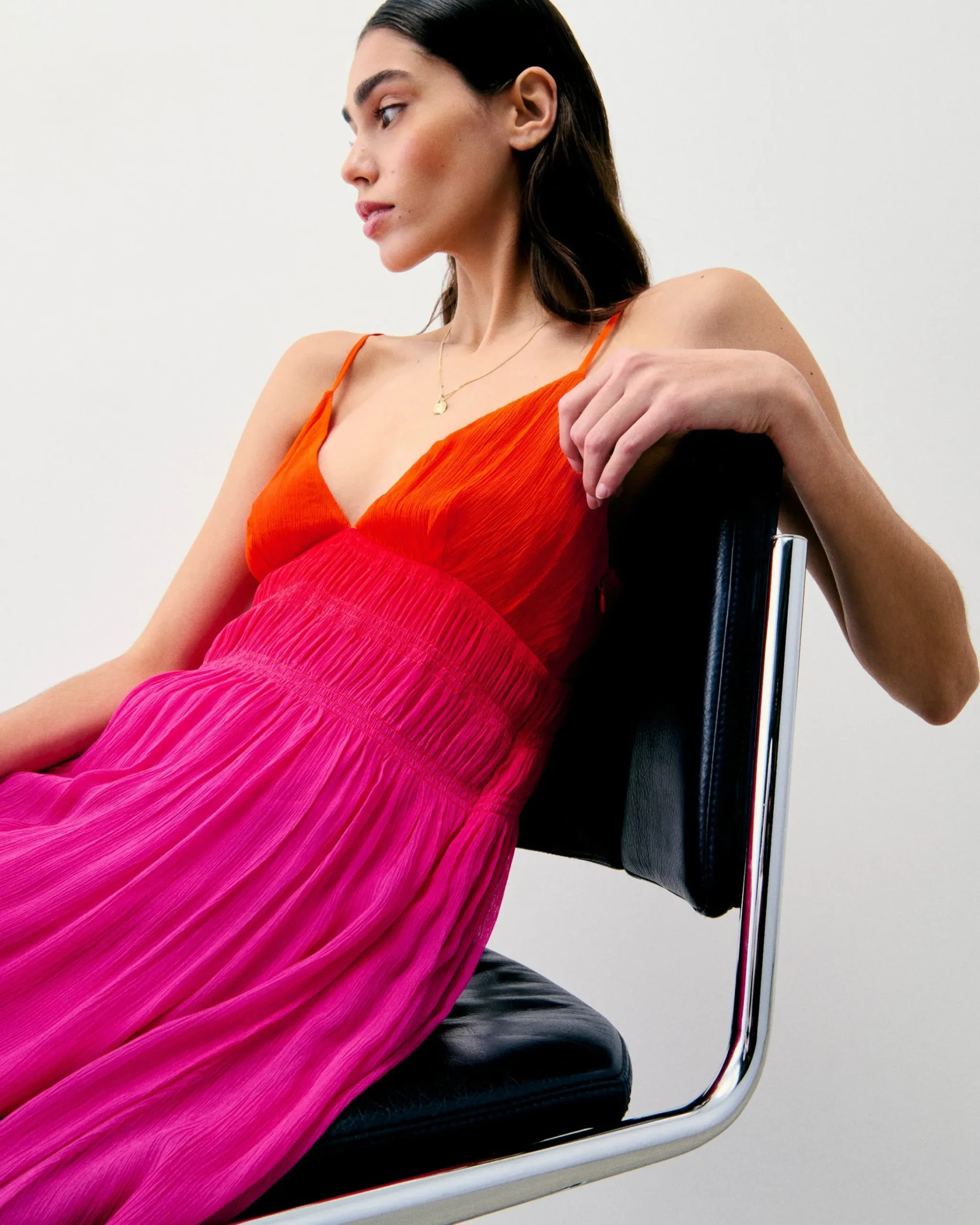 Questo vestito lungo ti conduce verso nuovi orizzonti cosmici. Con uno scollo a V e spalline sottili, presenta un look morbido e slanciato, accentuato da un’arricciatura in vita e da una gonna svasata. Protagonista del tuo guardaroba futurista, puoi indossarlo sia di giorno che di sera.