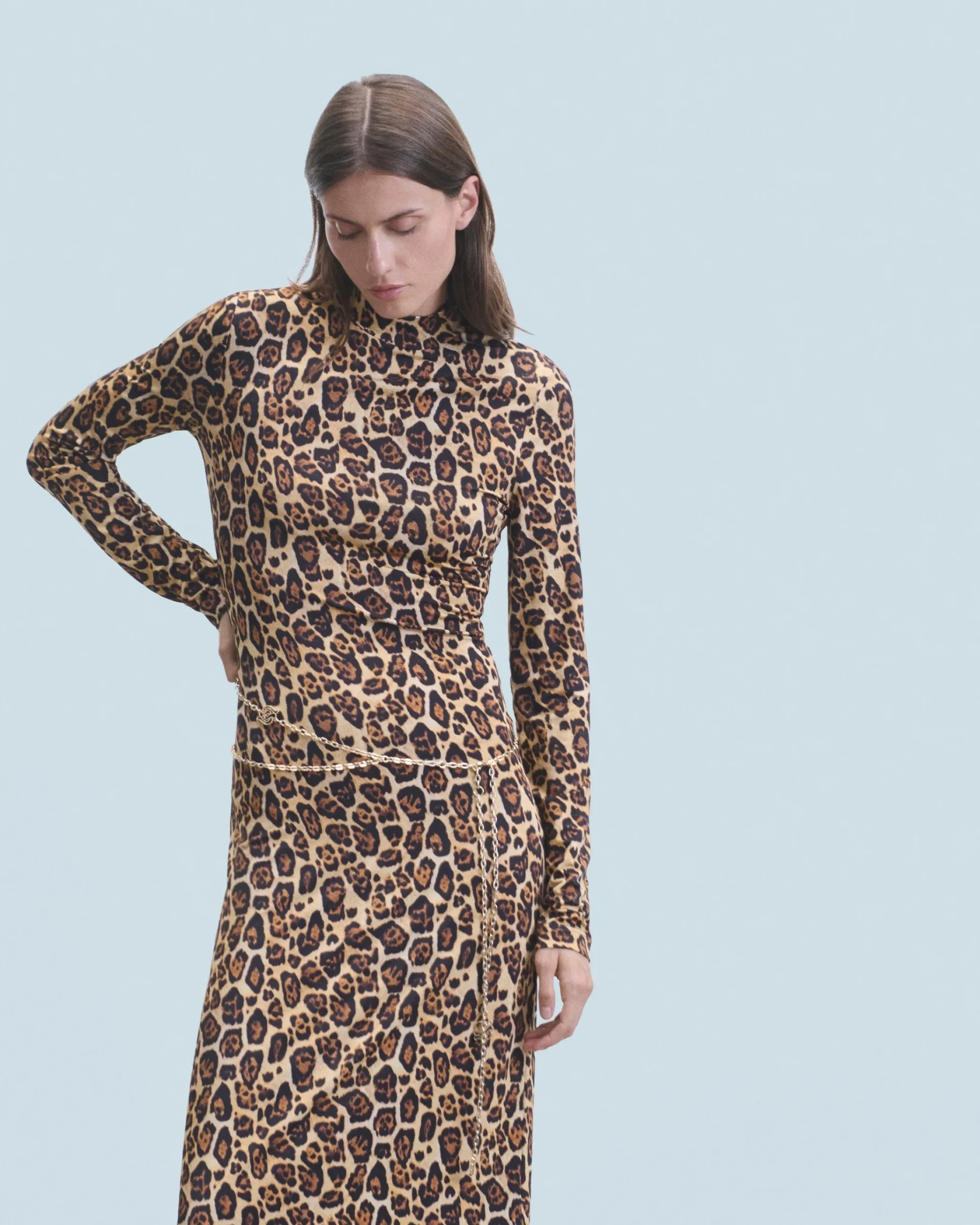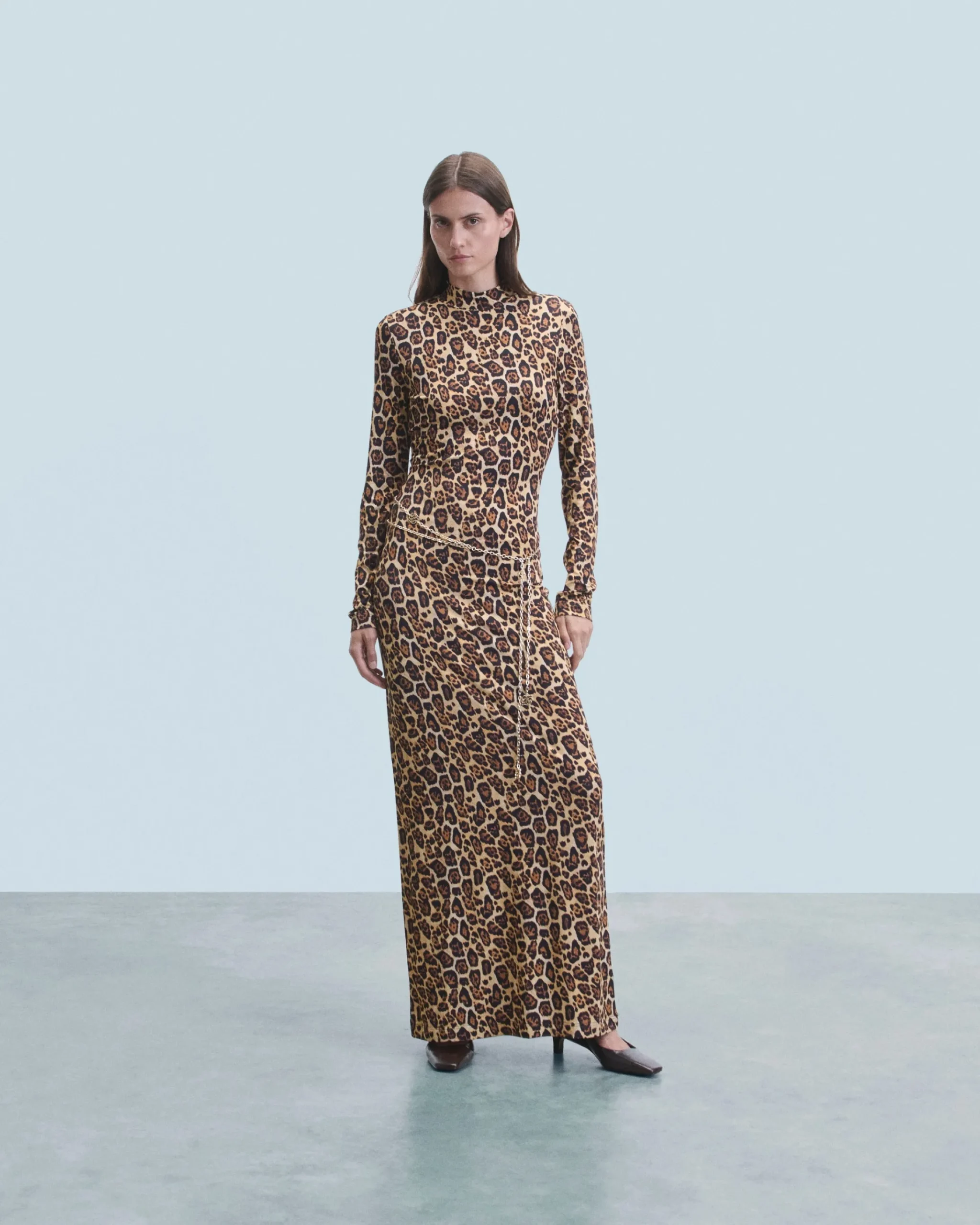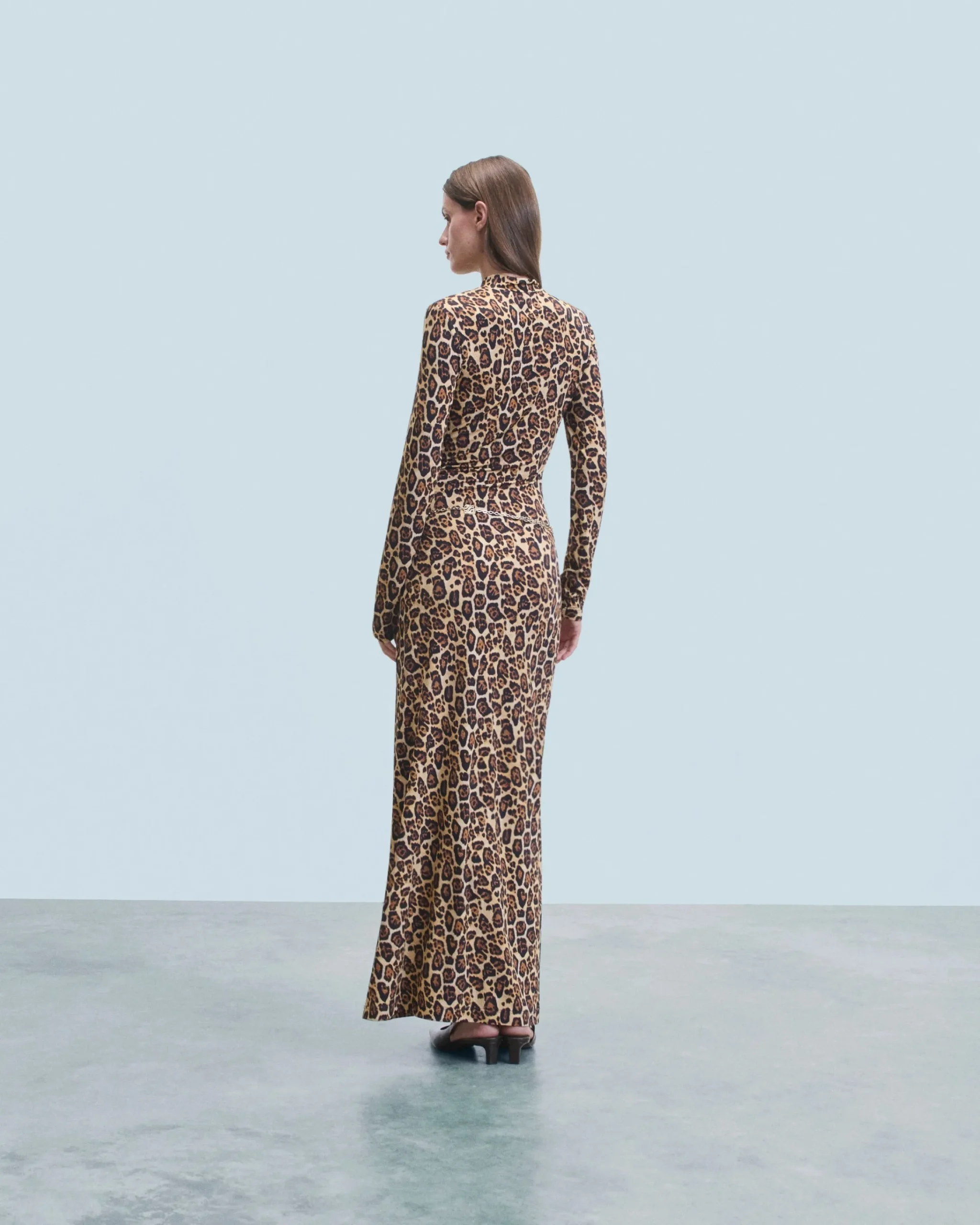 La silhouette è slanciata e i volumi sono rivisitati con questo abito impreziosito da una stampa leopardata. Caratterizzato da scollo tondo e maniche lunghe, seduce con una gonna svasata con delicato spacco. Da indossare come una seconda pelle, adornala con un paio di décolleté per un outfit sofisticato o sneakers per un look casual.