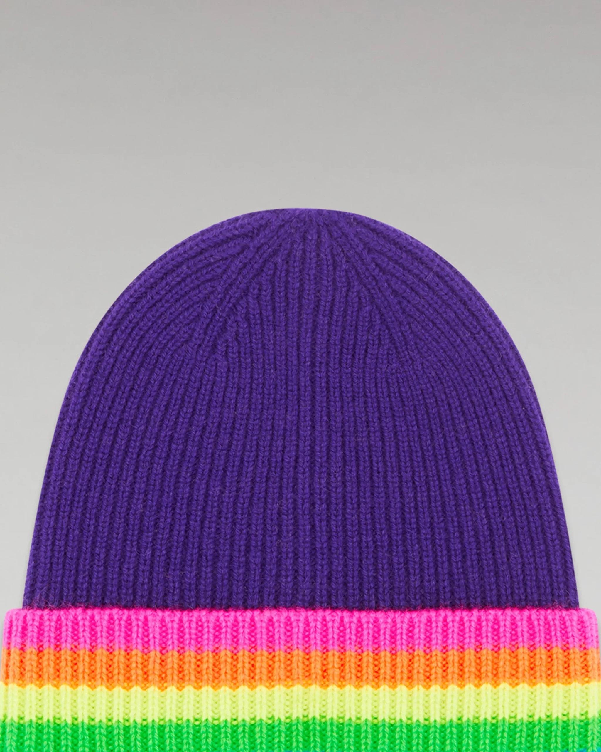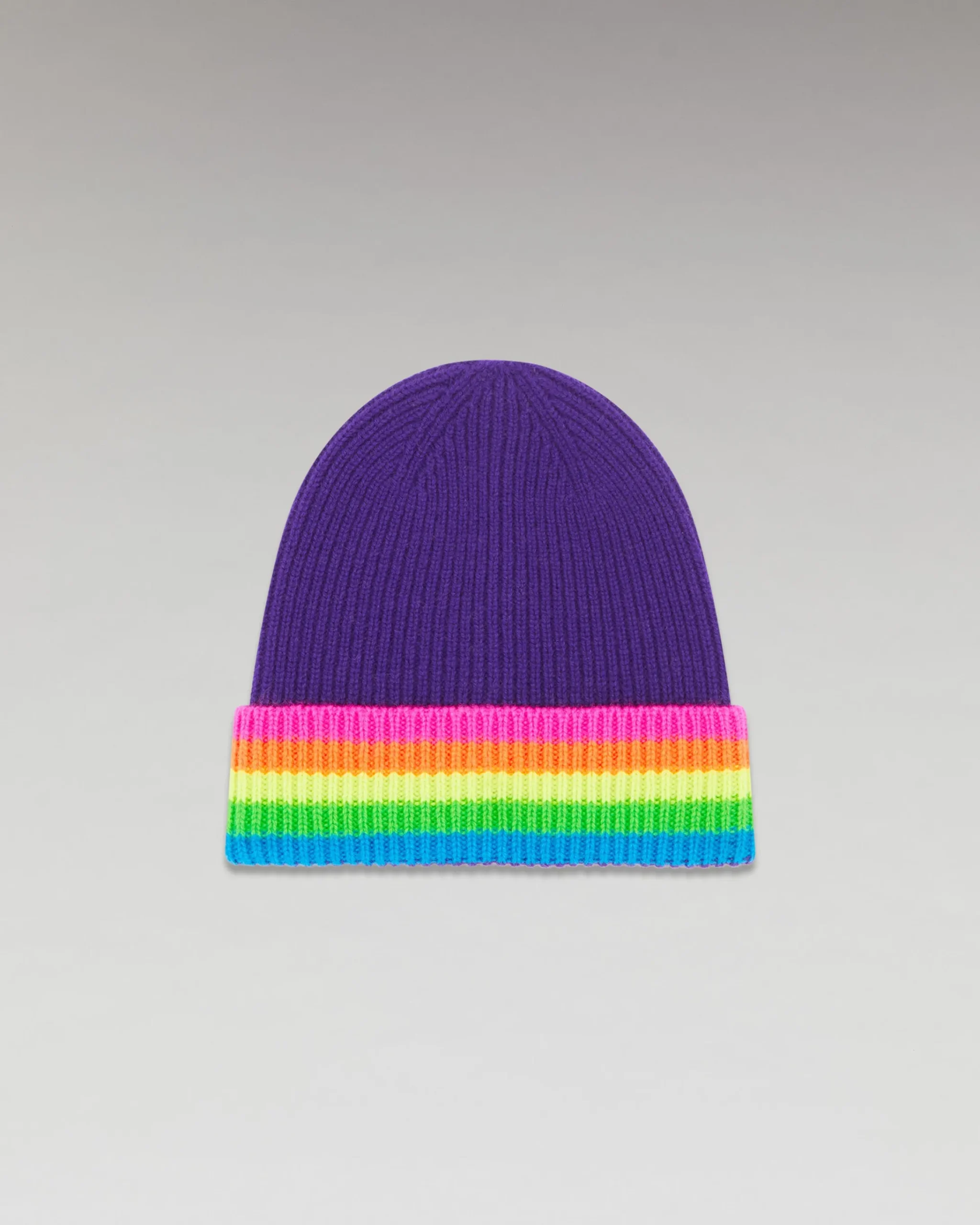 Esplora l’infinito del futuro cosmico con questo berretto a coste che gioca con i contrasti! Confezionato in cashmere 6 fili, presenta un risvolto decorato con bande dai colori vivaci, per innalzare il tuo stile verso nuovi orizzonti. Unendo comfort e morbidezza, illuminerà il tuo look con audacia.
