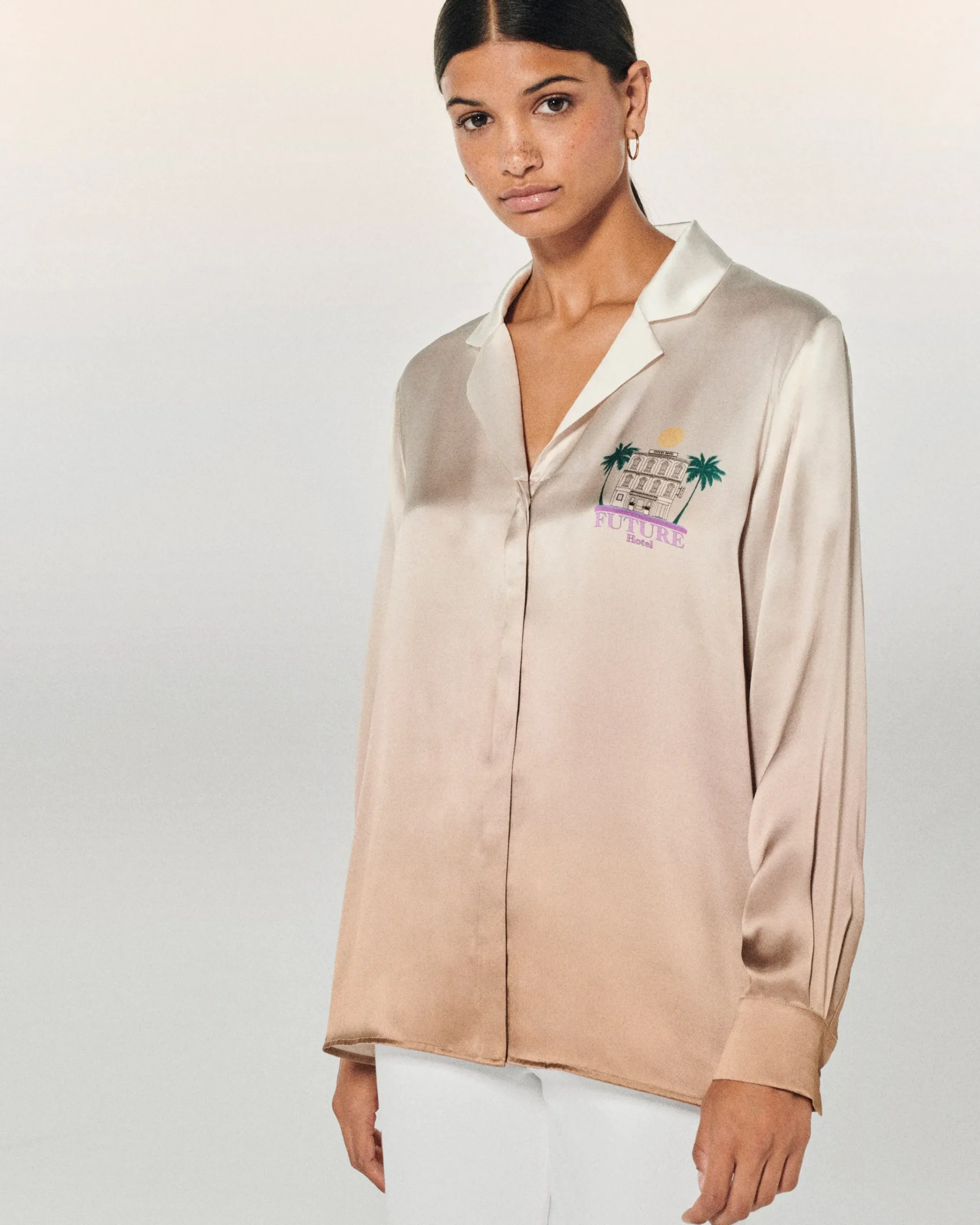 Prenotazione confermata! L’hotel Future ti aspetta su questa camicia morbida fantasia, confezionata in raso di seta lucido e setoso. Con maniche lunghe e polsini con patta e bottone, presenta bordi impreziositi da bordini a contrasto. Indossala con un paio di jeans strutturati per un look chic e casual!