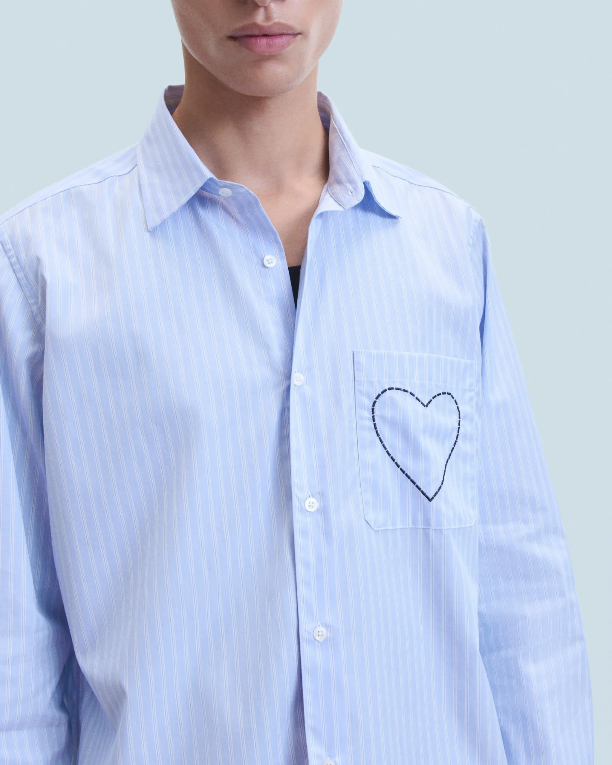 Vivacizzata da un gioco di righe, questa camicia oversize in cotone presenta un cuore delicatamente ricamato sul taschino. Con un collo a camicia e maniche lunghe, presenta una chiusura e polsini con bottoni per un look chic e strutturato.