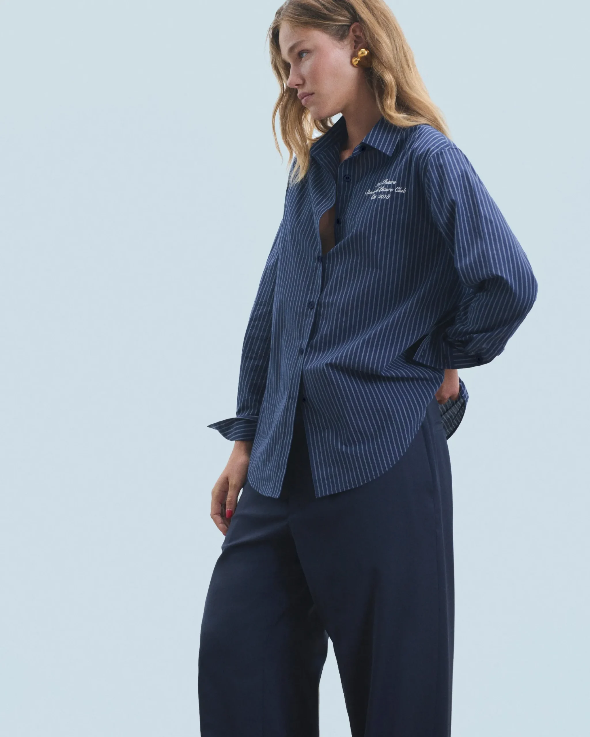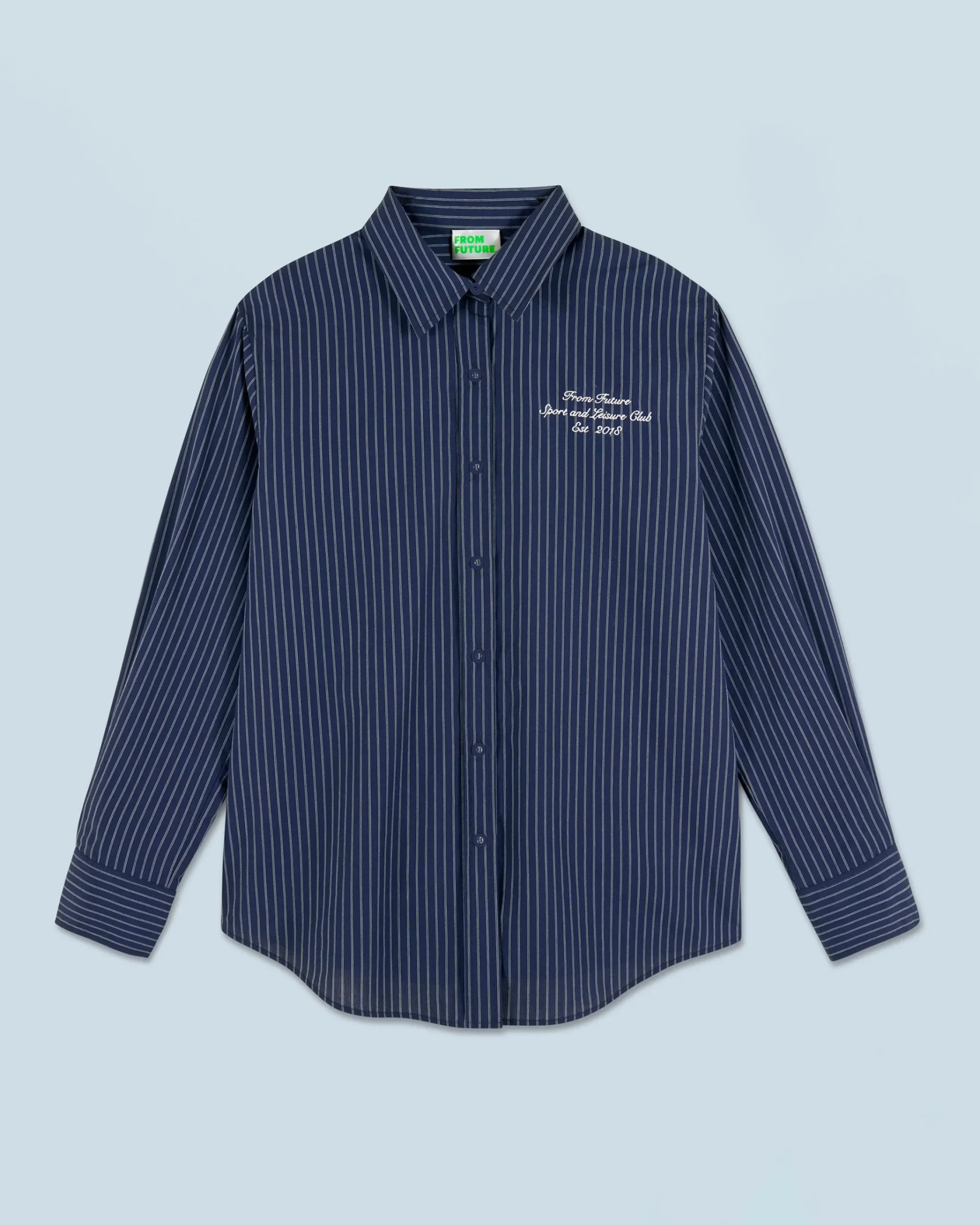 Gioca sulle righe con questa camicia in popeline rigato decorata dal ricamo “From Future Sport Leisure Club” sul petto. Dotato di colletto e maniche lunghe, rivela una chiusura e polsini con bottoni. Incarna l’eleganza casual, abbinalo a una t-shirt ampia e pantaloni dritti.