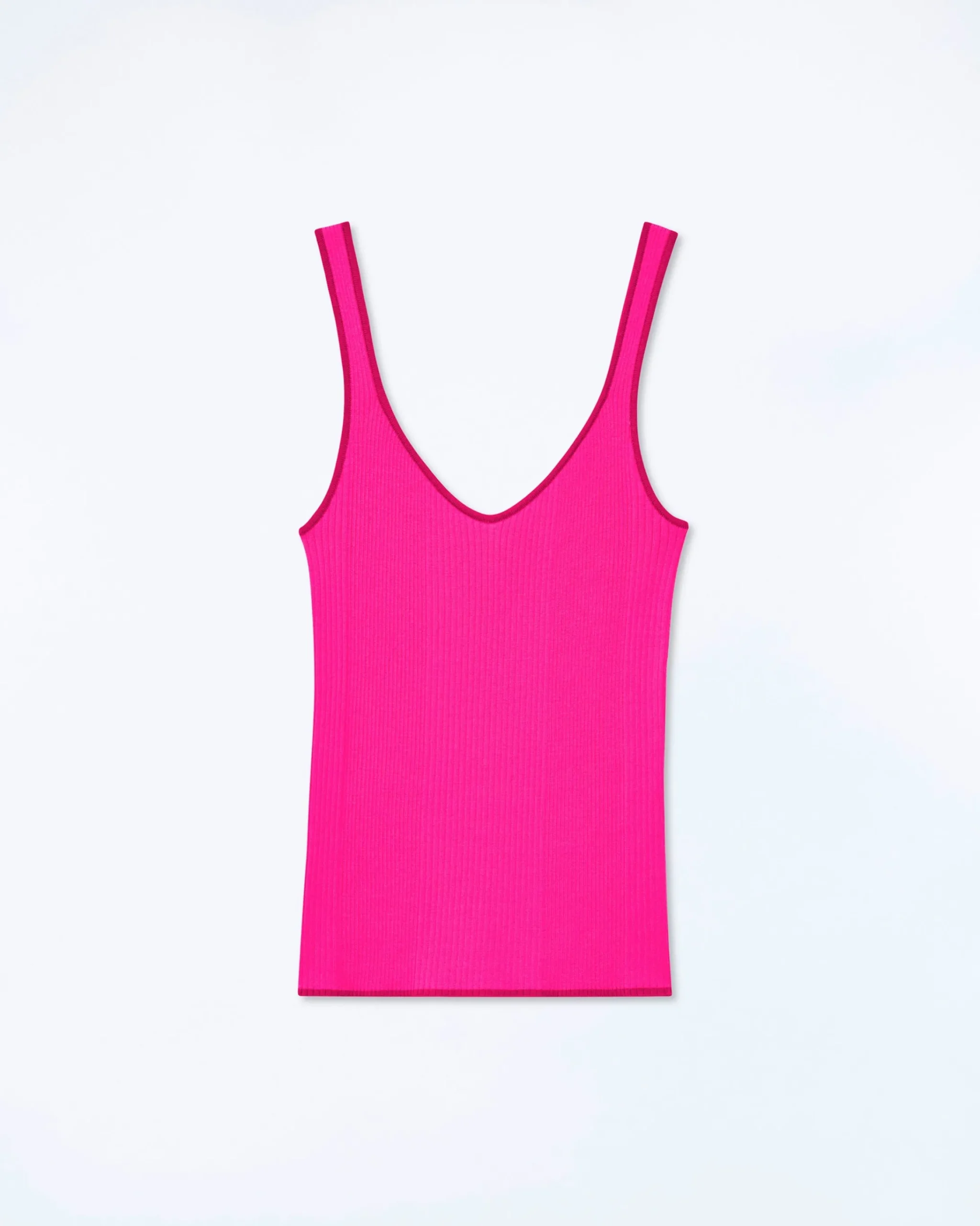 Uno stile vivace per questa canotta corta a coste, confezionata in lana merino! Con spalline sottili, presenta uno scollo a V e bordini a contrasto per creare un look strutturato. Puoi abbinarla a una gonna morbida o a un paio di pantaloni a gamba larga per un look effortless.