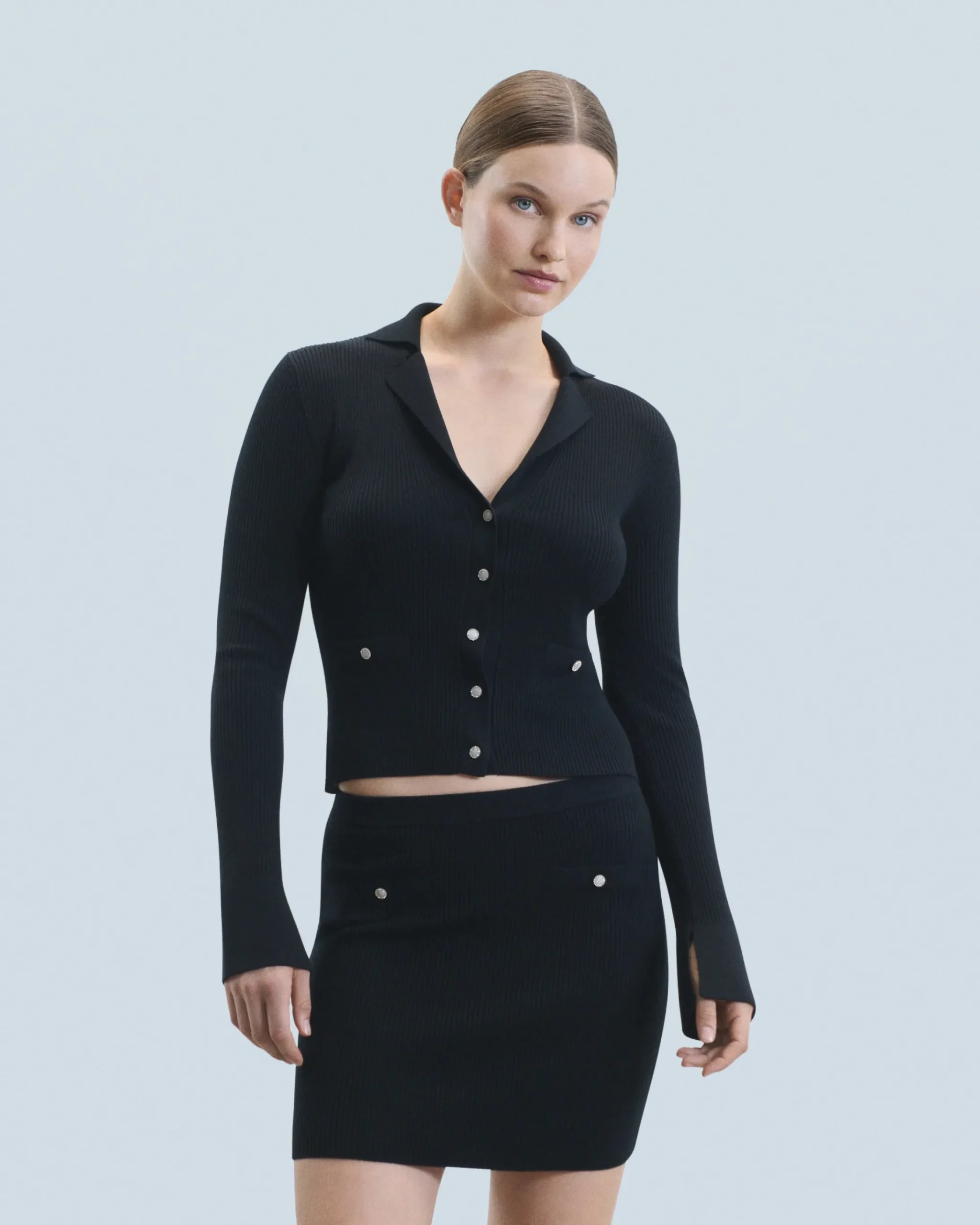 Realizzato in 100% lana merino certificata RWS (Responsible Wool Standard), questo cardigan corto e slim si ispira allo stile sartoriale per dare struttura al tuo look stagionale. Con maniche lunghe e polsini svasati con spacco, presenta un’elegante chiusura impreziosita da bottoni fantasia e tasche finte.