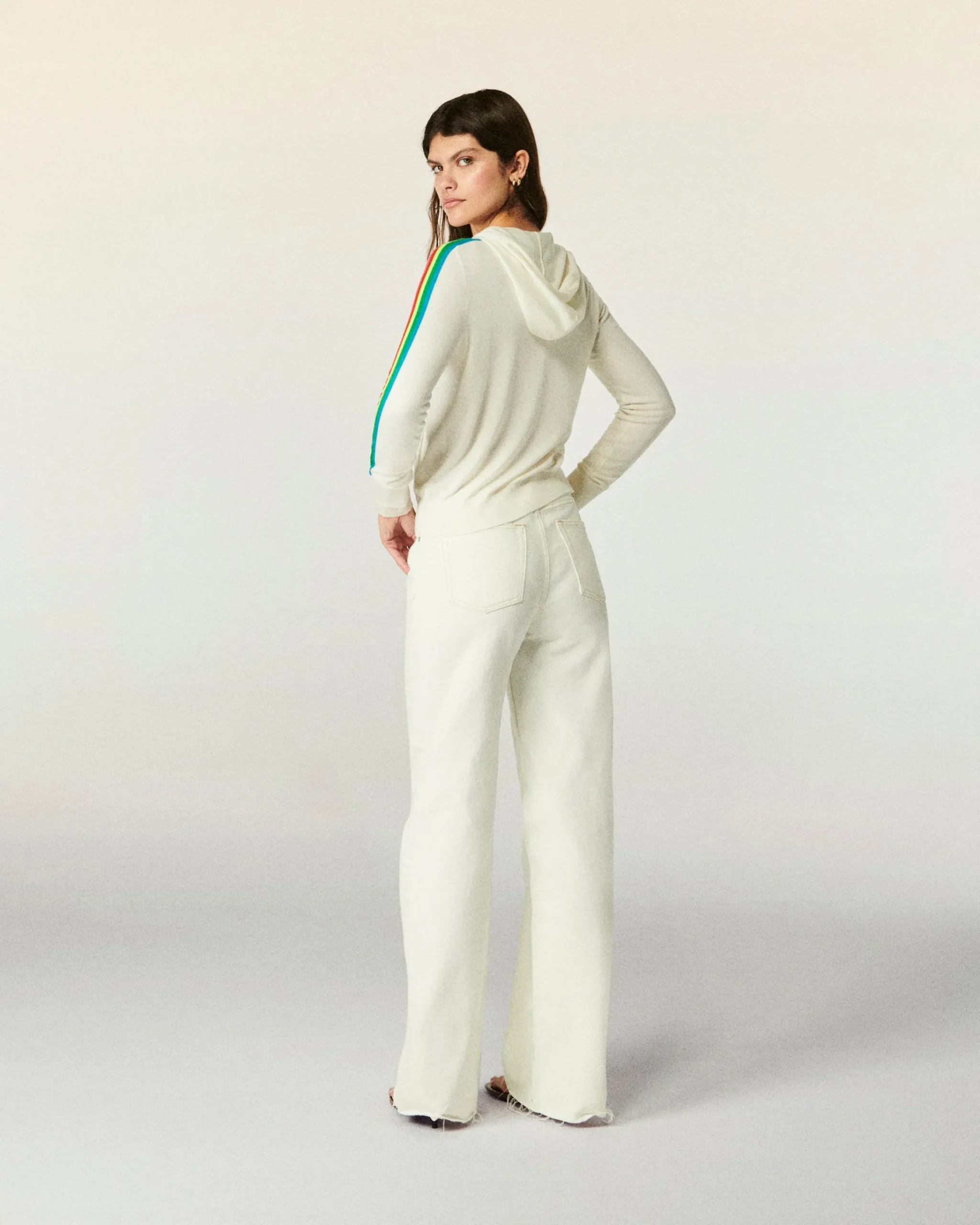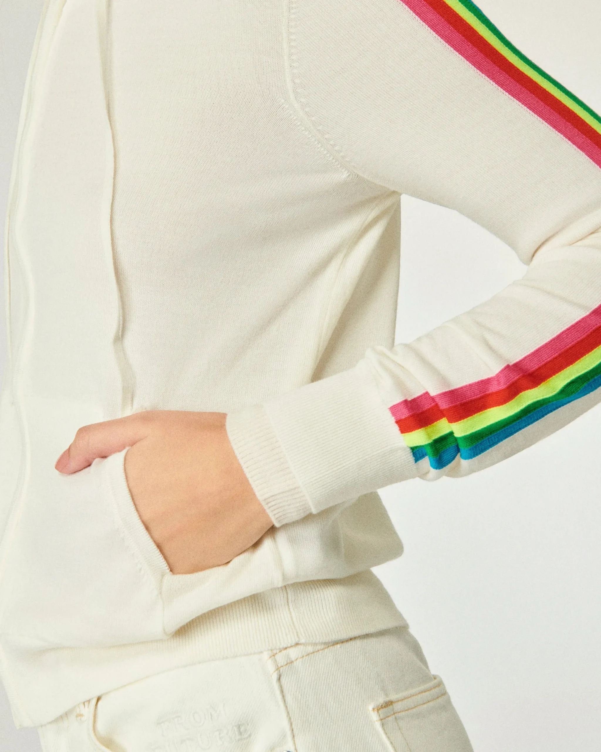 Una maglia soffice e ariosa è la protagonista di questa felpa-maglione corta e confezionata in lana merino. Con un cappuccio, una chiusura a zip e bordi a coste, le iconiche bande multicolori lungo le maniche affermano lo stile From Future. Completa il tuo outfit con un paio di jeans a gamba larga o dei pantaloni dritti!