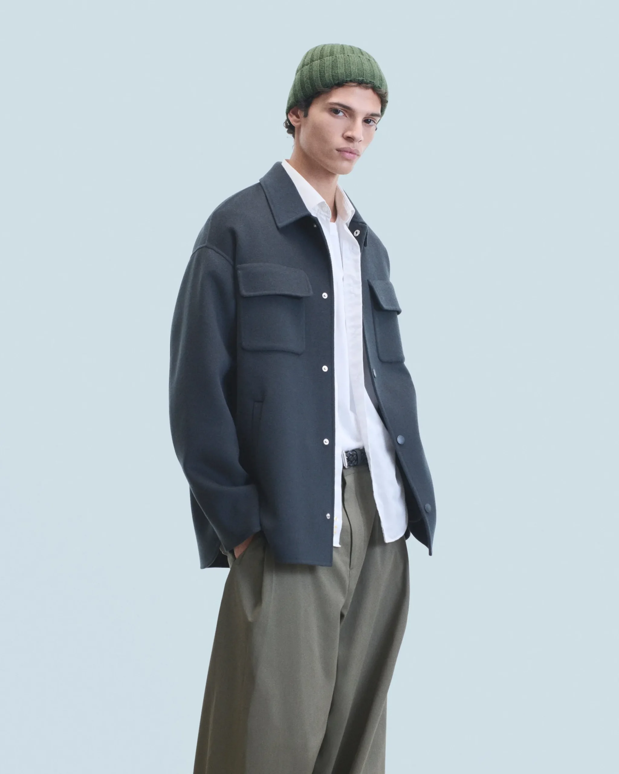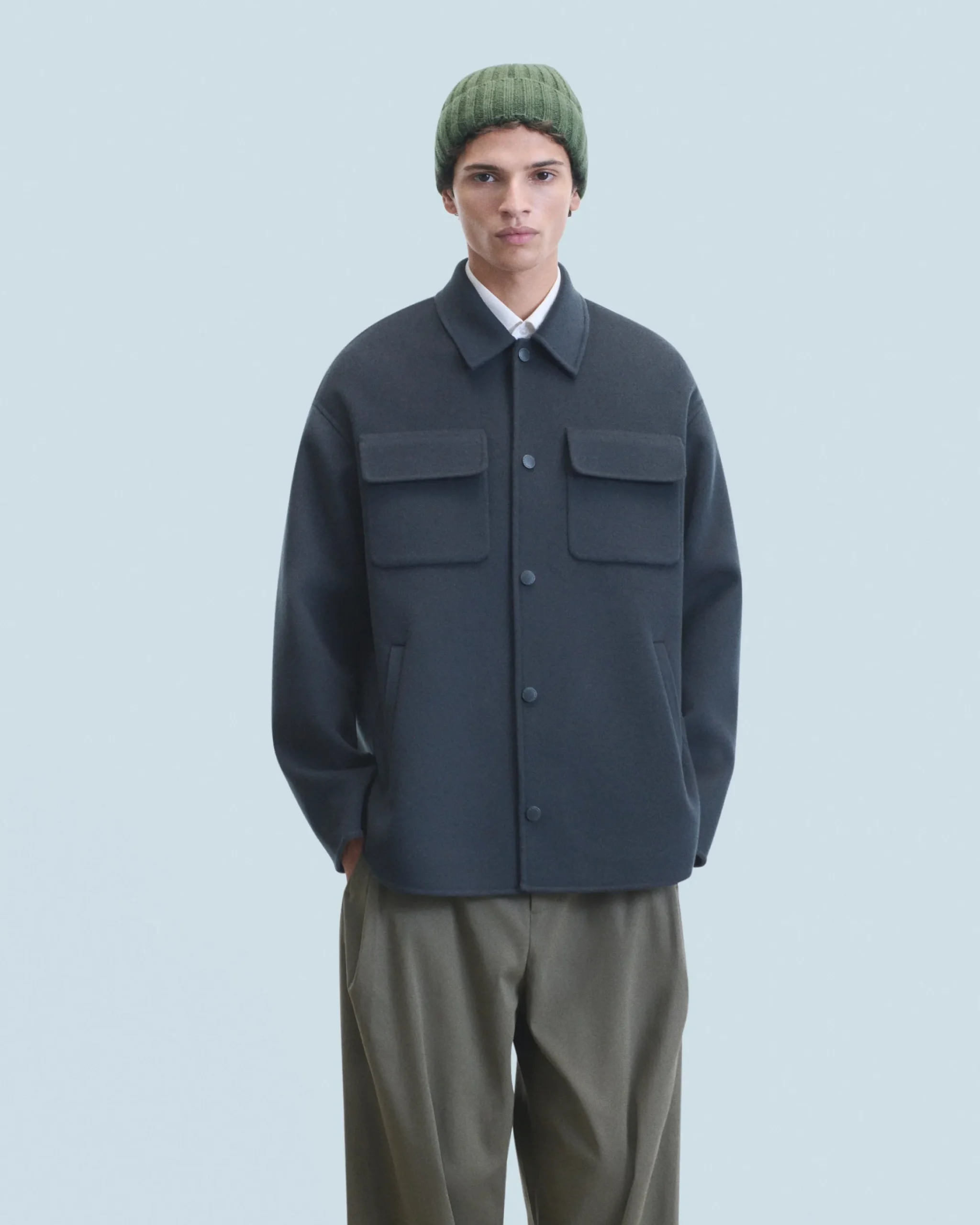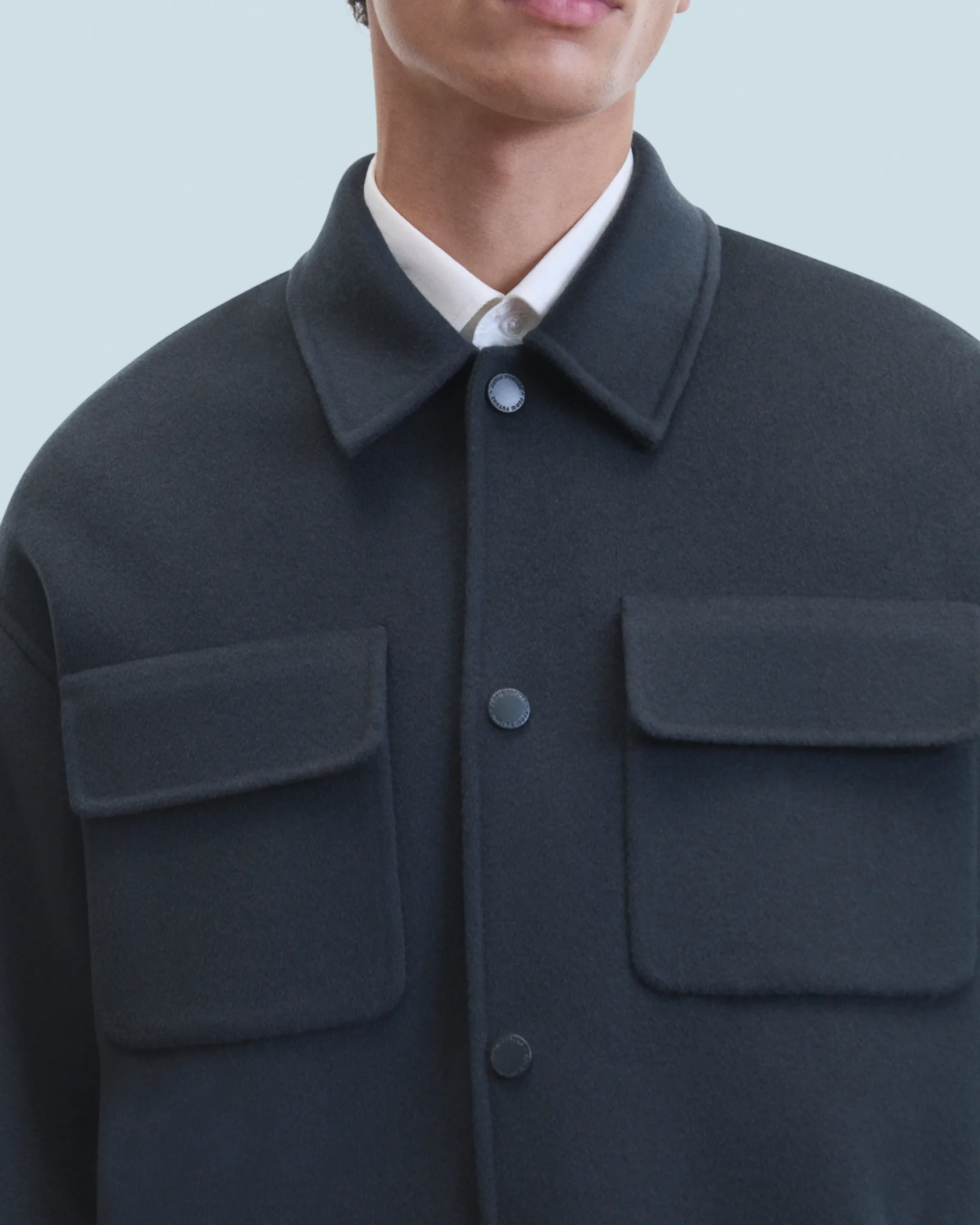 Con il suo taglio impeccabile e le sue linee decise, questa overshirt in lana double face riscalderà il tuo look con un tocco morbido. Caratterizzata da un colletto a camicia e una chiusura con bottoni a pressione, presenta due tasche con patta applicate sul petto e due tasche laterali applicate. Un pezzo essenziale per la stagione, che si abbina sia agli outfit casual che a quelli più sofisticati.
