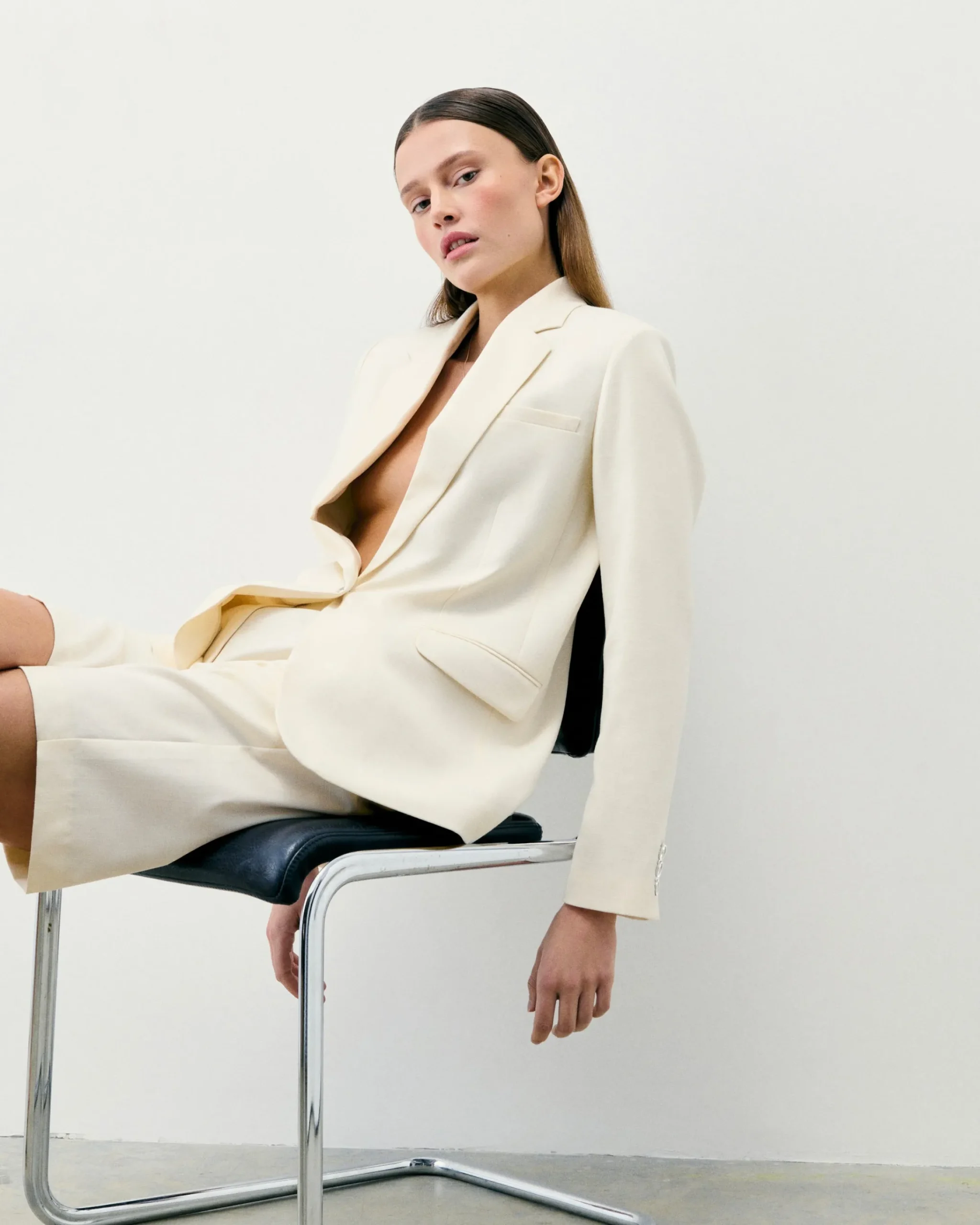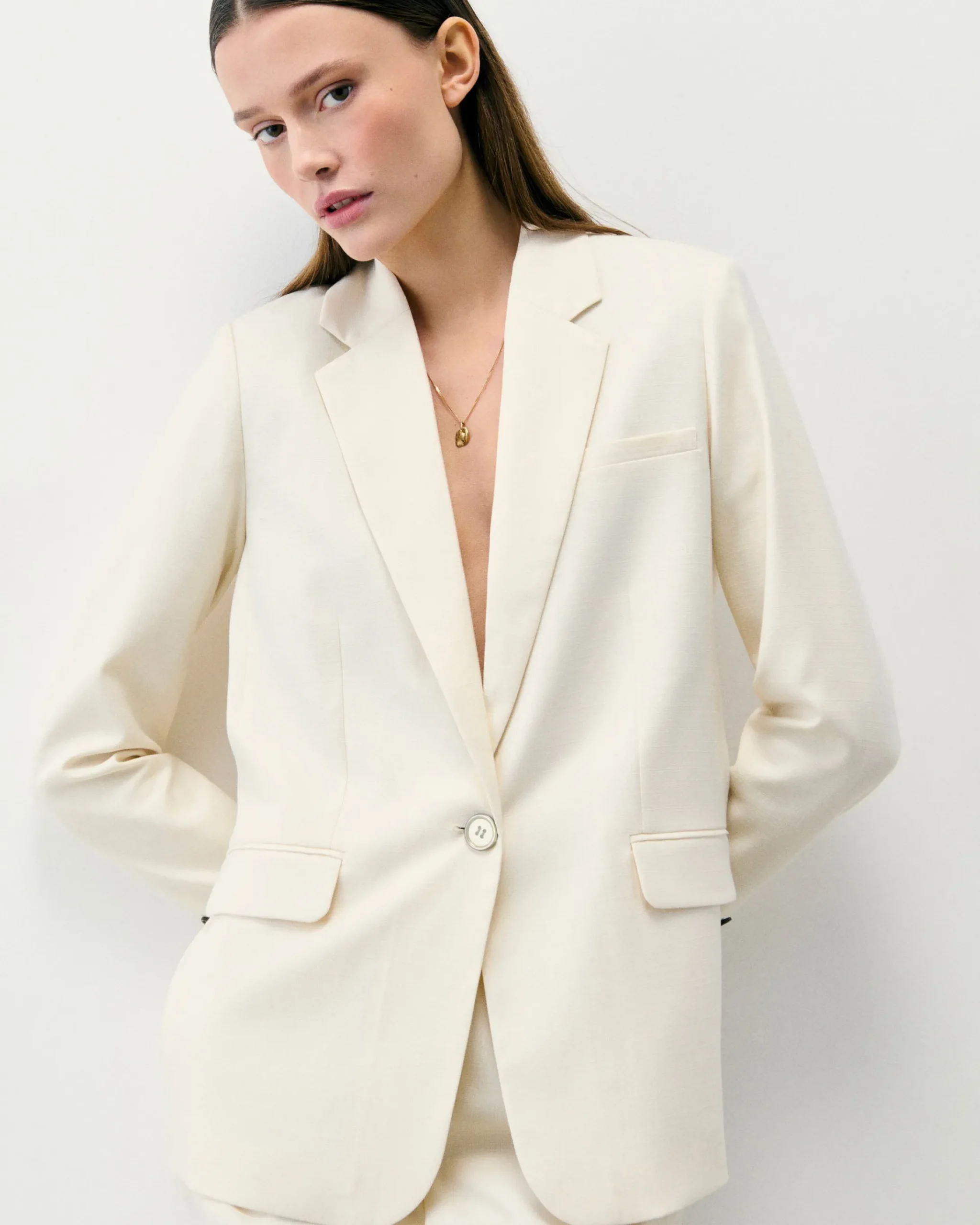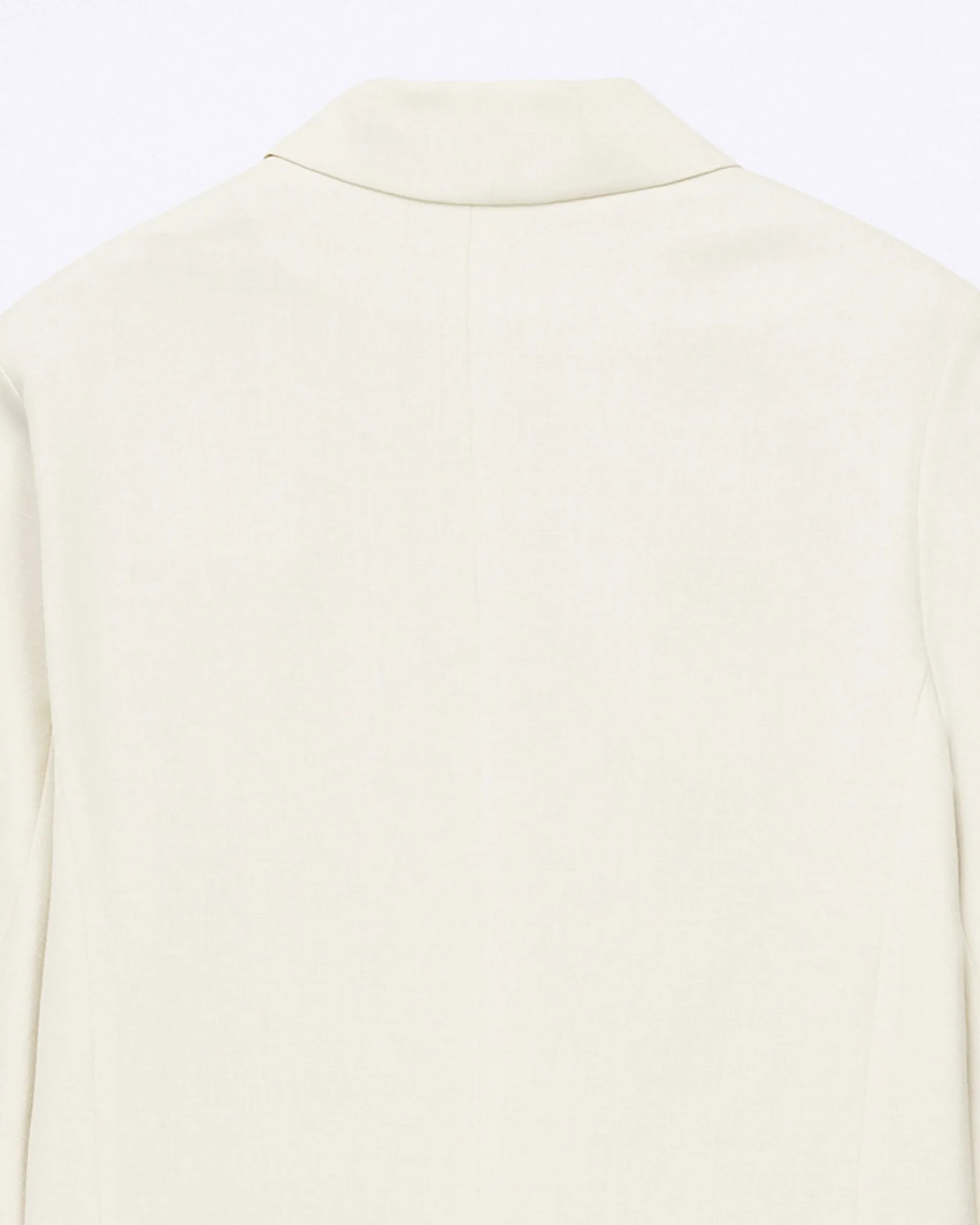 Un’eleganza senza tempo e linee futuriste per questa giacca blazer che si impone come un vero must del guardaroba femminile. Con un collo con revers, maniche lunghe e una chiusura a doppiopetto, presenta dettagli plissettati, una tasca a filetto sul petto e due tasche con patta. Decisamente chic, accompagnerà i tuoi outfit sia di giorno che di sera.