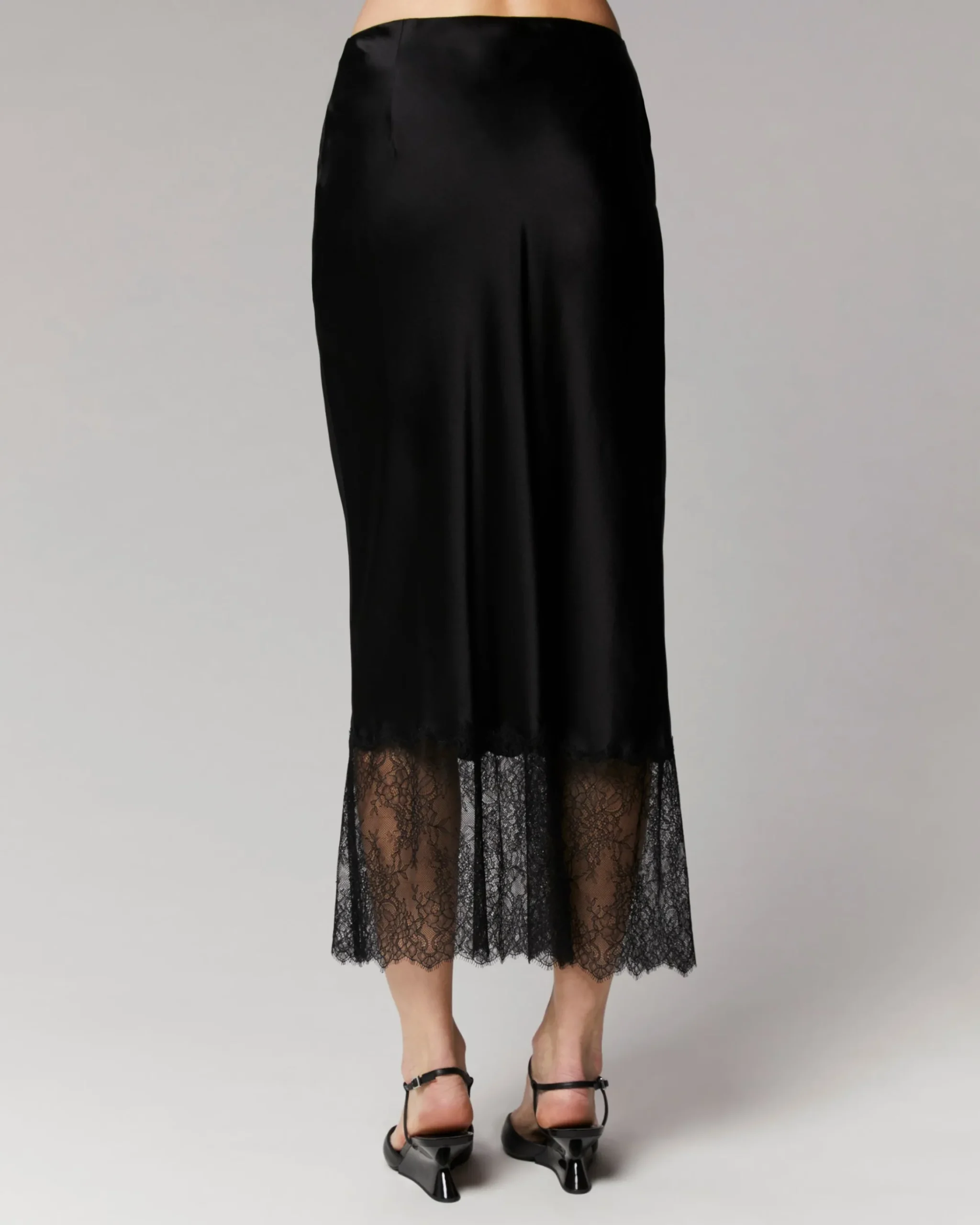 Impregnata di morbidezza e delicatezza, questa gonna midi incarna una visione futurista della raffinatezza. Confezionata in raso di seta leggero, lucido e setoso, disegna un look strutturato sottolineando il punto vita con una cintura elasticizzata. Chic e glamour, ha una vestibilità morbida ed è impreziosita da un gioco di cut-out e bordi in pizzo. Ideale per tutte le occasioni, puoi indossarla con un cardigan in maglia, dei gioielli e un paio di décolleté.