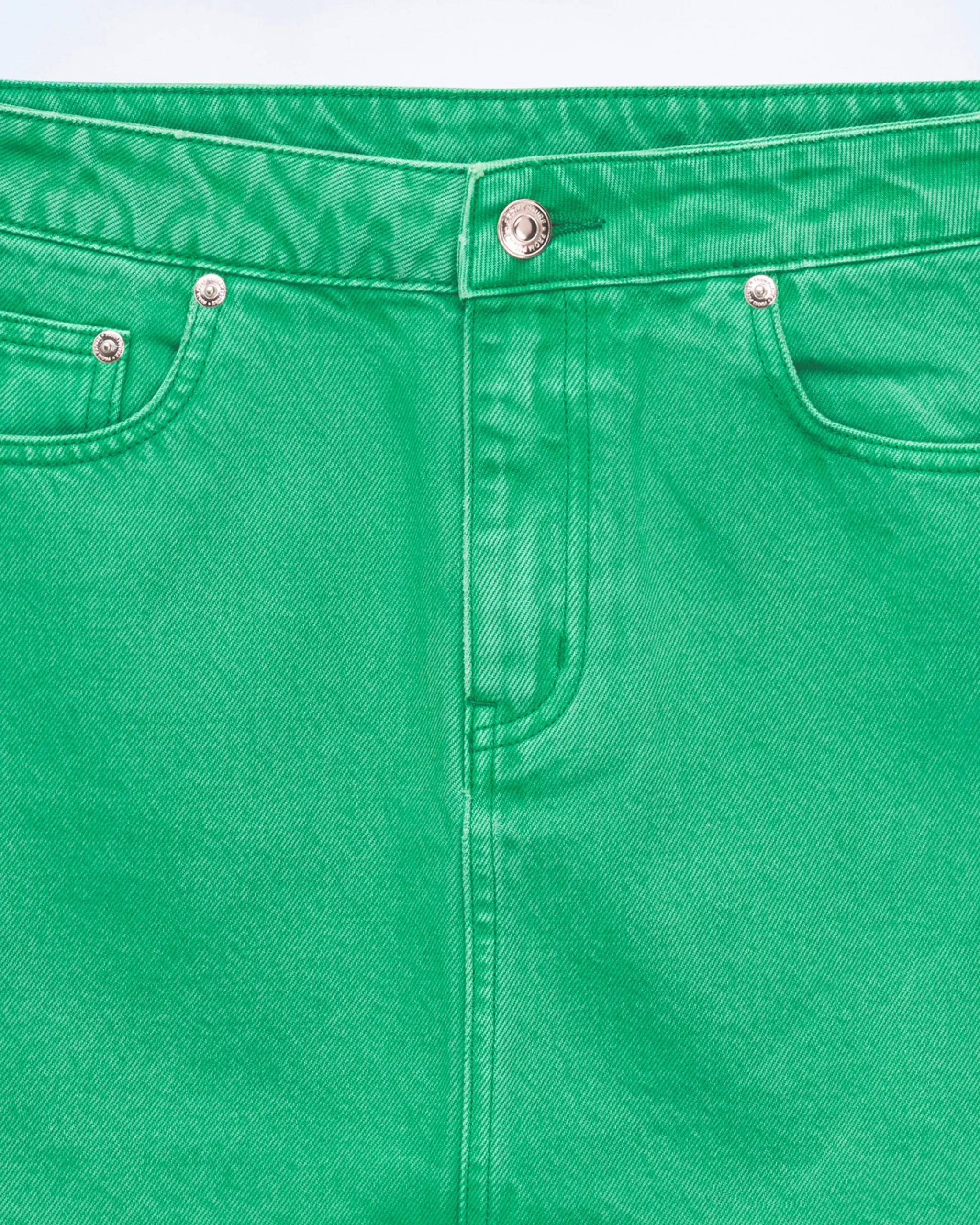 Un verde audace è il protagonista di questa minigonna in denim. Con una chiusura a zip con bottone, è dotata di due tasche sul davanti e due tasche a filetto finte dietro. Chic e casual allo stesso tempo, puoi giocare con le sovrapposizioni indossandola con una camicia in cotone infilata sotto un maglione in maglia.