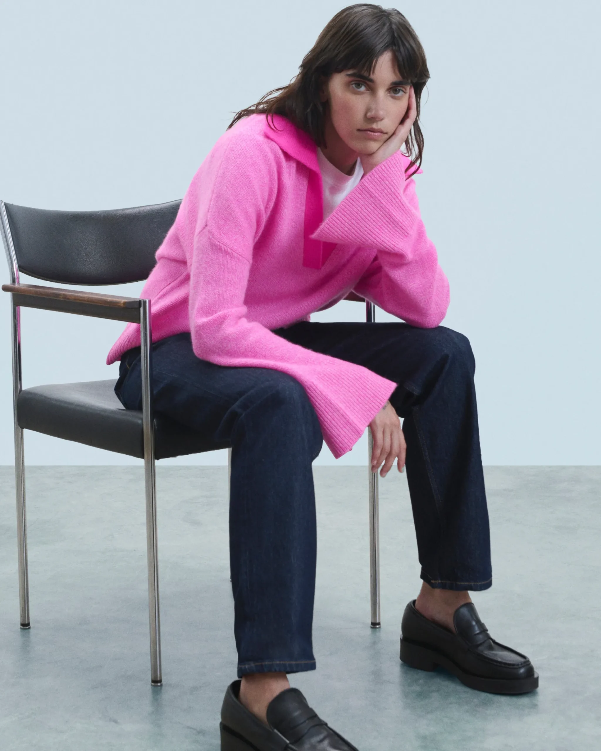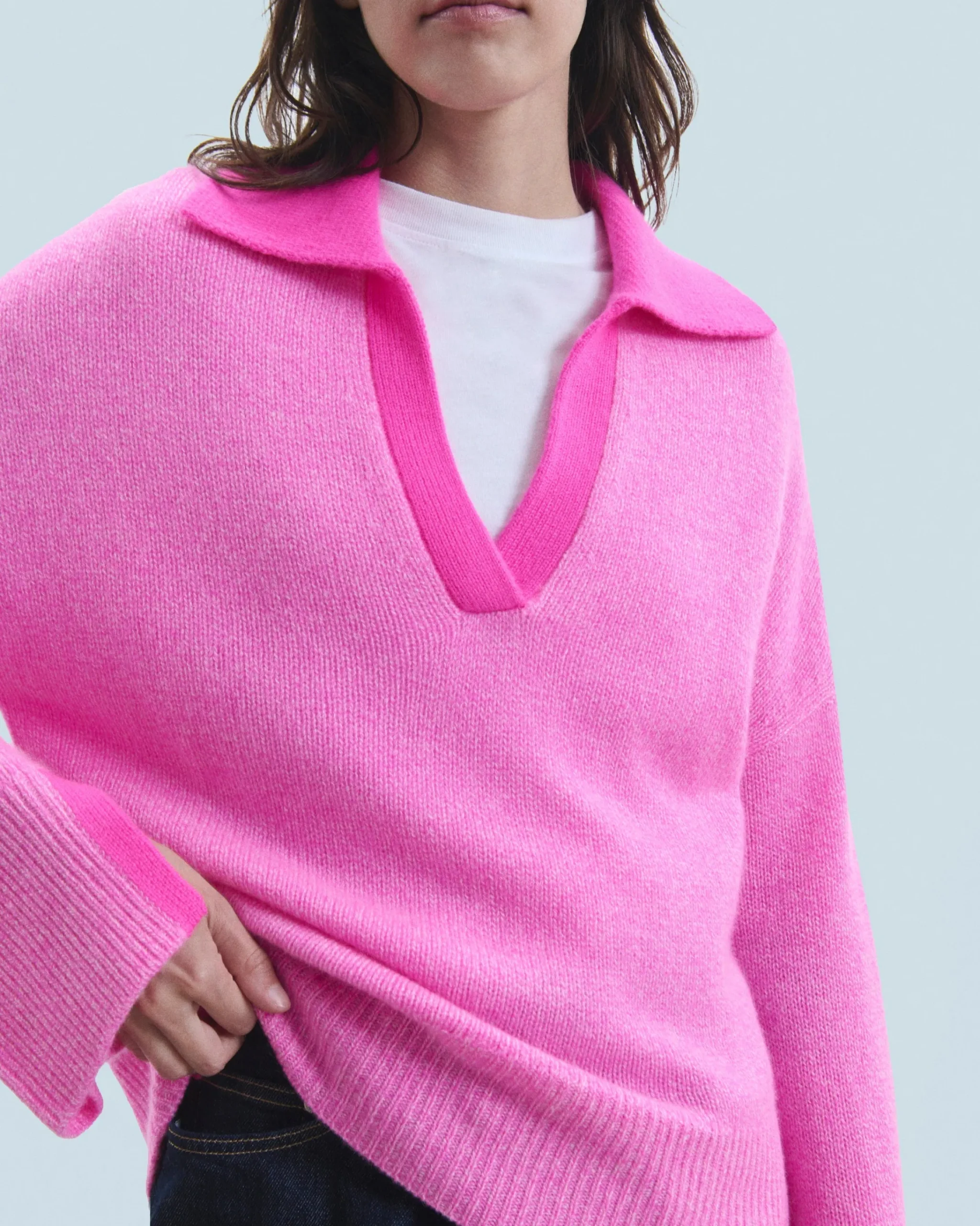 Una morbida maglia bicolore per questo lungo maglione oversize in cashmere. Con maniche lunghe e svasate, i bordi a contrasto danno struttura al collo a polo e ai polsini con spacco. Per un look chic e casual, indossalo con pantaloni sartoriali o una gonna morbida.