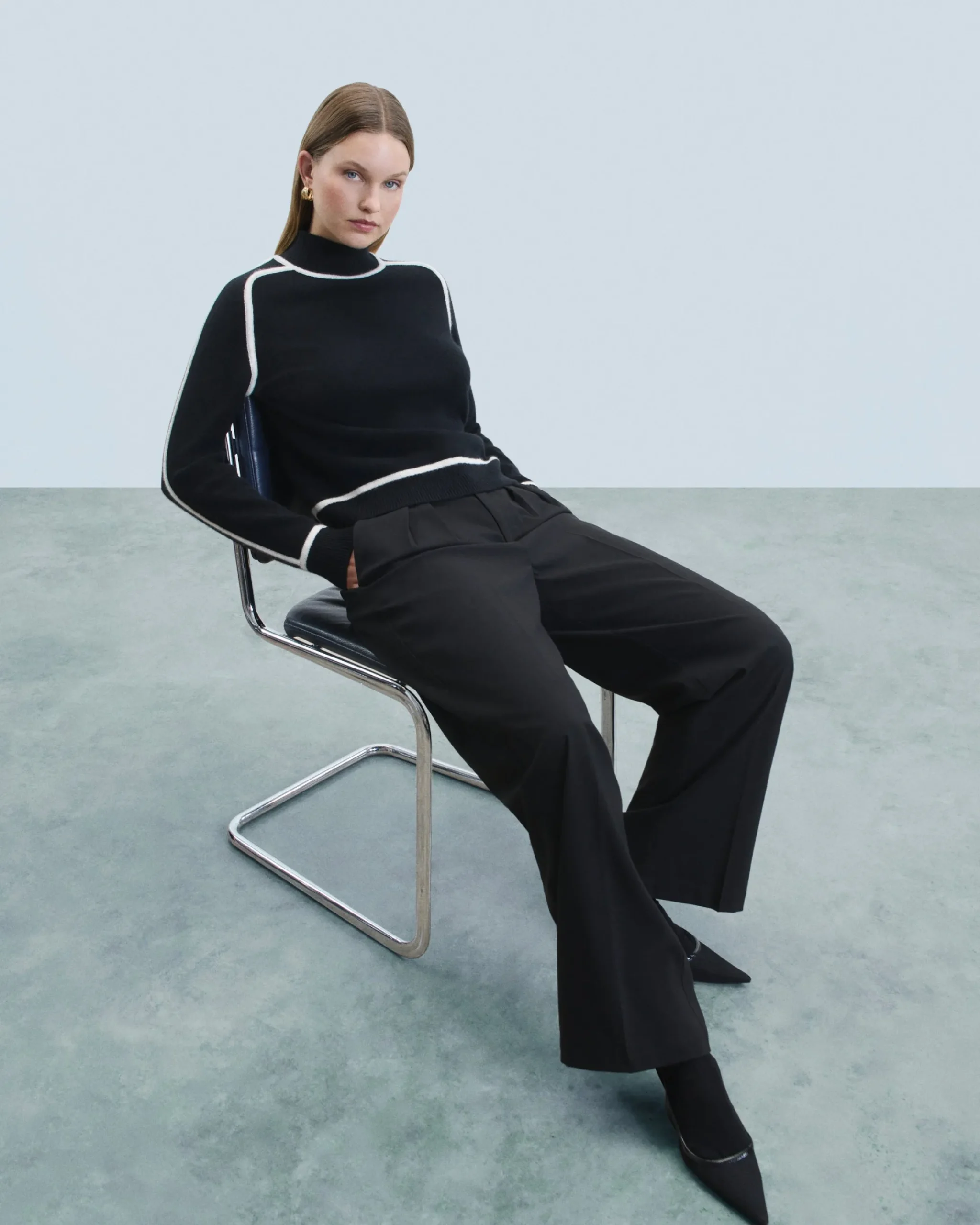 Il nostro iconico maglione in cashmere è vivacizzato da audaci linee a contrasto. Il collo alto, le maniche lunghe e i bordi a coste disegnano un look strutturato, perfetto per affermare il tuo stile in questa stagione. Indossalo con un paio di pantaloni a gamba larga o una gonna corta per un look chic e casual!