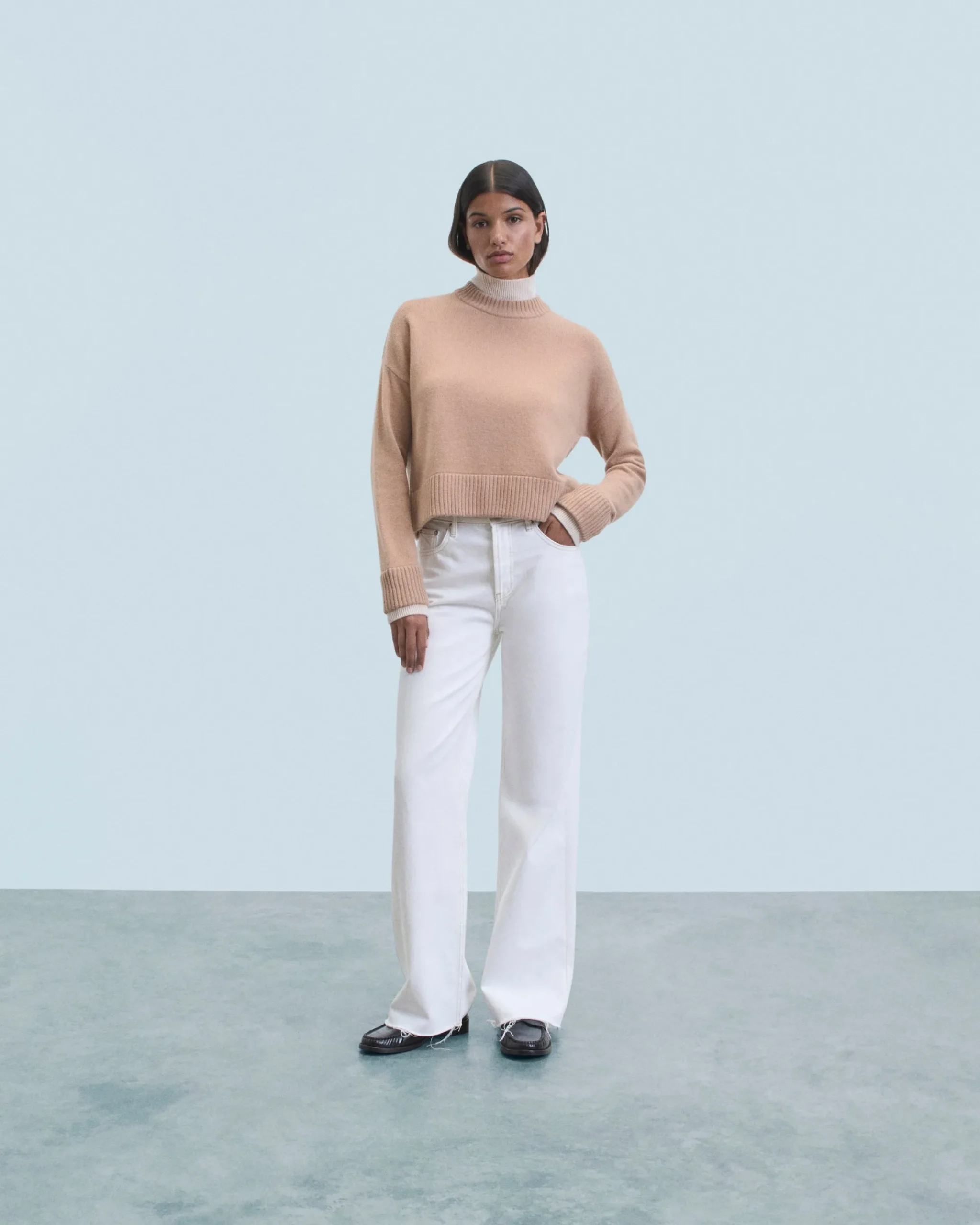 Impreziosito da un collo alto e polsini a contrasto, questo maglione corto e oversize crea un elegante effetto di sovrapposizione. Realizzato in cashmere, le maniche lunghe e i bordi a coste riscalderanno il tuo outfit di stagione. Indossalo con un paio di jeans a gamba larga o una gonna morbida per un look chic e strutturato!